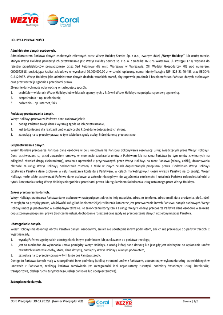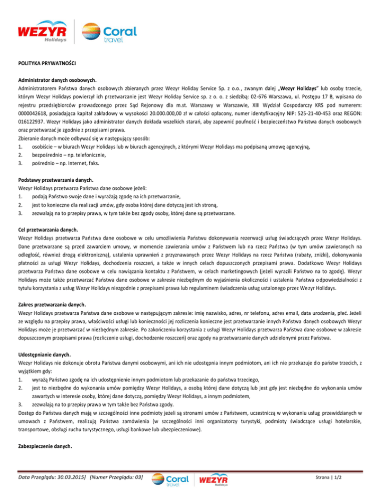 POLITYKA PRYWATNOŚCI Administrator danych osobowych. Administratorem Państwa danych osobowych zbieranych przez Wezyr Holiday Service Sp. z o.o., zwanym dalej „Wezyr Holidays” lub osoby trzecie, którym Wezyr Holidays powierzył ich przetwarzanie jest Wezyr Holiday Service sp. z o. o. z siedzibą: 02-676 Warszawa, ul. Postępu 17 B, wpisana do rejestru przedsiębiorców prowadzonego przez Sąd Rejonowy dla m.st. Warszawy w Warszawie, XIII Wydział Gospodarczy KRS pod numerem: 0000042618, posiadająca kapitał zakładowy w wysokości 20.000.000,00 zł w całości opłacony, numer identyfikacyjny NIP: 525-21-40-453 oraz REGON: 016122937. Wezyr Holidays jako administrator danych dokłada wszelkich starań, aby zapewnić poufność i bezpieczeństwo Państwa danych osobowych oraz przetwarzać je zgodnie z przepisami prawa. Zbieranie danych może odbywać się w następujący sposób: 1. osobiście – w biurach Wezyr Holidays lub w biurach agencyjnych, z którymi Wezyr Holidays ma podpisaną umowę agencyjną, 2. bezpośrednio – np. telefonicznie, 3. pośrednio – np. Internet, faks. Podstawy przetwarzania danych. Wezyr Holidays przetwarza Państwa dane osobowe jeżeli: 1. podają Państwo swoje dane i wyrażają zgodę na ich przetwarzanie, 2. jest to konieczne dla realizacji umów, gdy osoba której dane dotyczą jest ich stroną, 3. zezwalają na to przepisy prawa, w tym także bez zgody osoby, której dane są przetwarzane. Cel przetwarzania danych. Wezyr Holidays przetwarza Państwa dane osobowe w celu umożliwienia Państwu dokonywania rezerwacji usług świadczących przez Wezyr Holidays. Dane przetwarzane są przed zawarciem umowy, w momencie zawierania umów z Państwem lub na rzecz Państwa (w tym umów zawieranyc h na odległość, również drogą elektroniczną), ustalenia uprawnień z przyznawanych przez Wezyr Holidays na rzecz Państwa (rabaty, zniżki), dokonywania płatności za usługi Wezyr Holidays, dochodzenia roszczeń, a także w innych celach dopuszczonych przepisami prawa. Dodatkowo Wezyr Holidays przetwarza Państwa dane osobowe w celu nawiązania kontaktu z Państwem, w celach marketingowych (jeżeli wyrazili Państwo na to zgodę). Wezyr Holidays może także przetwarzać Państwa dane osobowe w zakresie niezbędnym do wyjaśnienia okoliczności i ustalenia Państwa o dpowiedzialności z tytułu korzystania z usług Wezyr Holidays niezgodnie z przepisami prawa lub regulaminem świadczenia usług ustalonego przez Wezyr Holidays. Zakres przetwarzania danych. Wezyr Holidays przetwarza Państwa dane osobowe w następującym zakresie: imię nazwisko, adres, nr telefonu, adres email, data urodzenia, płeć. Jeżeli ze względu na przepisy prawa, właściwości usługi lub konieczności jej rozliczenia konieczne jest przetwarzanie innych Państwa danych osobowych Wezyr Holidays może je przetwarzać w niezbędnym zakresie. Po zakończeniu korzystania z usługi Wezyr Holidays przetwarza Państwa dane osobowe w zakresie dopuszczonym przepisami prawa (rozliczenie usługi, dochodzenie roszczeń) oraz zgody na przetwarzanie danych udzielonymi przez Państwa. Udostępnianie danych. Wezyr Holidays nie dokonuje obrotu Państwa danymi osobowymi, ani ich nie udostępnia innym podmiotom, ani ich nie przekazuje d o państw trzecich, z wyjątkiem gdy: 1. wyrażą Państwo zgodę na ich udostępnienie innym podmiotom lub przekazanie do państwa trzeciego, 2. jest to niezbędne do wykonania umów pomiędzy Wezyr Holidays, a osobą której dane dotyczą lub jest gdy jest niezbędne do wykon ania umów zawartych w interesie osoby, której dane dotyczą, pomiędzy Wezyr Holidays, a innym podmiotem, 3. zezwalają na to przepisy prawa w tym także bez Państwa zgody. Dostęp do Państwa danych mają w szczególności inne podmioty jeżeli są stronami umów z Państwem, uczestniczą w wykonaniu usług przewidzianych w umowach z Państwem, realizują Państwa zamówienia (w szczególności inni organizatorzy turystyki, podmioty świadczące usługi hotelarskie, transportowe, obsługi ruchu turystycznego, usługi bankowe lub ubezpieczeniowe). Zabezpieczenie danych. Data Przeglądu: 30.03.2015] [Numer Przeglądu: 03] Strona | 1/2 Państwa dane osobowe są zabezpieczone przed bezprawnym udostępnieniem osobom nieupoważnionym, zabraniem przez osoby nieupoważnione, zniszczeniem, utratą, uszkodzeniem lub zmianą oraz przetwarzaniem niezgodnym z przepisami ustawy o ochronie danych osobowych. Wezyr Holidays wykorzystuje techniczne oraz organizacyjne środki zabezpieczające ochronę przetwarzania danych. Świadczenie usług drogą elektroniczną. Wezyr Holidays świadcząc usługi drogą elektroniczną przetwarza Państwa dane osobowe w zakresie i celach dopuszczonych prawem (szczególnie podczas dokonywania rezerwacji on-line), w tym za Państwa zgodą inne dane, które nie są niezbędne do świadczenia usługi drogą elektroniczną. Dane zbierane automatycznie. Jeżeli korzystają Państwo z usług telekomunikacyjnych lub usług świadczonych drogą elektroniczną (np. dostęp do stron internetowych Wezyr Holidays) Państwa dane telekomunikacyjne(np. adres IP) są generowane i przetwarzane przez Wezyr Holidays automatycznie i nie można ich powiązać z Państwa danymi osobowymi. Systemy informatyczne obsługujące wykonywanie usług świadczonych drogą elektroniczną mogą automatycznie ze względów technicznych zbierać dane(np. rodzaj przeglądarki internetowej, lub wykorzystywanego systemu operacyjnego, strony, z której Państwo weszli na stro ny Wezyr Holidays, statystykę Państwa aktywności na stronie). Dane takie zbierane są tylko w celach statystycznych i nie są powiązane z Państwa danymi osobowymi. Pliki „cookies”. Wezyr Holidays stosuje technologię „cookies” w celu zapewnienia funkcjonalności serwisów internetowych i prowadzenia analiz. „Cookies” jest informacją zapisywaną przez serwer na komputerze użytkownika, którą serwer może odczytać przy p