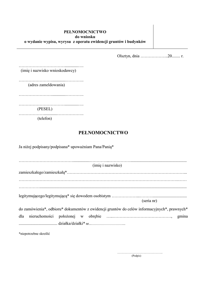 PEŁNOMOCNICTWO do wniosku o wydanie wypisu, wyrysu z operatu ewidencji gruntów i budynków Olsztyn, dnia ………………..20........ r. …………………………….............…. (imię i nazwisko wnioskodawcy) …………………….............…………. (adres zameldowania) …………………….............…………. …………………………….............…. (PESEL) ……………….............………………. (telefon) PEŁNOMOCNICTWO Ja niżej podpisany/podpisana* upoważniam Pana/Panią* …………………………………................…………...……………...................................................... (imię i nazwisko) zamieszkałego/zamieszkałą*…………………………………………………………………………... …………………………………………………………………………………………………….…… ……………............................................................................................................................................. legitymującego/legitymującą* się dowodem osobistym ………………...………................................. (seria nr) do zamówienia*, odbioru* dokumentów z ewidencji gruntów do celów informacyjnych*, prawnych* dla nieruchomości położonej w obrębie …..……………………………………, ..................................... działka/działki* nr...………………………... *niepotrzebne skreślić …………………………………………. (Podpis) gmina