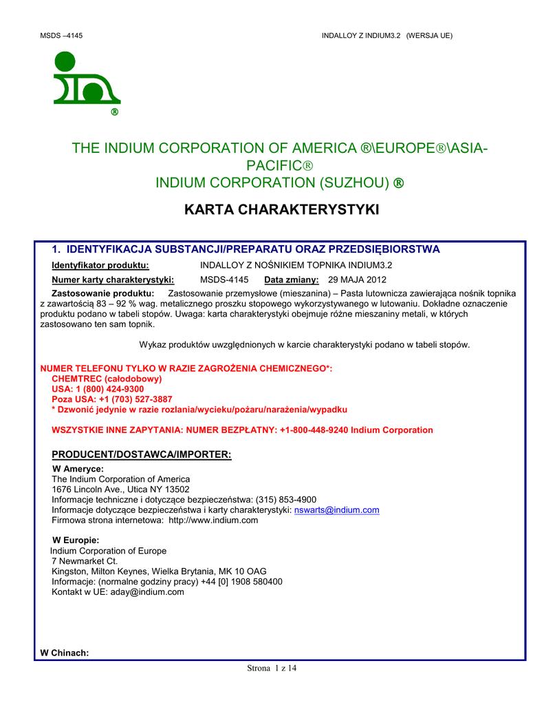 MSDS –4145 INDALLOY Z INDIUM3.2 (WERSJA UE) THE INDIUM CORPORATION OF AMERICA ®\EUROPE\ASIAPACIFIC INDIUM CORPORATION (SUZHOU) KARTA CHARAKTERYSTYKI 1. IDENTYFIKACJA SUBSTANCJI/PREPARATU ORAZ PRZEDSIĘBIORSTWA Identyfikator produktu: INDALLOY Z NOŚNIKIEM TOPNIKA INDIUM3.2 Numer karty charakterystyki: MSDS-4145 Data zmiany: 29 MAJA 2012 Zastosowanie produktu: Zastosowanie przemysłowe (mieszanina) – Pasta lutownicza zawierająca nośnik topnika z zawartością 83 – 92 % wag. metalicznego proszku stopowego wykorzystywanego w lutowaniu. Dokładne oznaczenie produktu podano w tabeli stopów. Uwaga: karta charakterystyki obejmuje różne mieszaniny metali, w których zastosowano ten sam topnik. Wykaz produktów uwzględnionych w karcie charakterystyki podano w tabeli stopów. NUMER TELEFONU TYLKO W RAZIE ZAGROŻENIA CHEMICZNEGO*: CHEMTREC (całodobowy) USA: 1 (800) 424-9300 Poza USA: +1 (703) 527-3887 * Dzwonić jedynie w razie rozlania/wycieku/pożaru/narażenia/wypadku WSZYSTKIE INNE ZAPYTANIA: NUMER BEZPŁATNY: +1-800-448-9240 Indium Corporation PRODUCENT/DOSTAWCA/IMPORTER: W Ameryce: The Indium Corporation of America 1676 Lincoln Ave., Utica NY 13502 Informacje techniczne i dotyczące bezpieczeństwa: (315) 853-4900 Informacje dotyczące bezpieczeństwa i karty charakterystyki: [email protected] Firmowa strona internetowa: http://www.indium.com W Europie: Indium Corporation of Europe 7 Newmarket Ct. Kingston, Milton Keynes, Wielka Brytania, MK 10 OAG Informacje: (normalne godziny pracy) +44 [0] 1908 580400 Kontakt w UE: [email protected] W Chinach: Strona 1 z 14 MSDS –4145 INDALLOY Z INDIUM3.2 (WERSJA UE) Indium Corporation (Suzhou) Co., Ltd. No. 428 Xinglong Street Suzhou Industrial Park Suchun Industrial Square Unit No. 14-C Jiangsu Province, Chiny 215126 Informacje: (86) 512-6283-4900 W Azji: Asia-Pacific Operations-Singapore 29 Kian Teck Avenue Singapur 628908 Informacje: +65 6268-8678 2. IDENTYFIKACJA ZAGROŻEŃ GŁÓWNE DROGI NARAŻENIA: ⊗Oczy ⊗Wdychanie ⊗Skóra Klasyfikacja: Zwroty R: Symbol Xn ⊗Spożycie Czynniki rakotwórcze wymienione w: NTP IARC OSHA ⊗Niewymienione R20/21/22, R36/37/38, R33, R40, R48, R61, R50/53, R51/53 Informacje ogólne (GHS): ołów i (lub) antymon Hasło ostrzegawcze: Ostrzeżenie Zwroty informujące o zagrożeniu H302 Działa szkodliwie po połknięciu. H315 Działa drażniąco na skórę H317 Może powodować reakcję alergiczną skóry H319 Działa drażniąco na oczy H335 Może wywoływać podrażnienie dróg oddechowych H332 Działa szkodliwie w następstwie wdychania H351 Podejrzewa się, że powoduje raka (ołów) (składnik zastrzeżony 0,2%) H360 Może działać szkodliwie na płodność lub na dziecko w łonie matki (dotyczy produktu zawierającego ołów) H373 Może powodować uszkodzenie narządów poprzez długotrwałe lub narażenie powtarzane (dotyczy produktu zawierającego ołów) H413 Może powodować długotrwałe szkodliwe skutki dla organizmów wodnych (produkt jako całość) H400+H413 Działa bardzo toksycznie na organizmy wodne, może powodować długotrwałe szkodliwe skutki dla organizmów wodnych (ołów) H401+H413 Działa toksycznie na organizmy wodne, może powodować długotrwałe szkodliwe skutki dla organizmów wodnych (antymon) EUH201A Uwaga! Zawiera ołów (dotyczy jedynie wymienionych produktów zawierających ołów). Patrz wykaz. Zwroty wskazujące środki ostrożności P233 Przechowywać pojemnik szczelnie zamknięty. P261 Unikać wdychania pyłu/dymu/gazu/mgły/par/rozpylonej cieczy P270 Nie jeść, nie pić i nie palić podczas używania produktu Strona 2 z 14 MSDS –4145 INDALLOY Z INDIUM3.2 (WERSJA UE) P273 P280 P362 P302 +P352 P304 + 341 Unikać uwolnienia do środowiska Stosować rękawice ochronne/ odzież ochronną/ ochronę oczu /ochronę twarzy Zanieczyszczoną odzież zdjąć i wyprać przed ponownym użyciem W PRZYPADKU DOSTANIA SIĘ NA SKÓRĘ: Umyć dużą ilością wody z mydłem. W PRZYPADKU DOSTANIA SIĘ DO DRÓG ODDECHOWYCH: W przypadku trudności z oddychaniem, wyprowadzić lub wynieść poszkodowanego na świeże powietrze i zapewnić warunki do odpoczynku w pozycji umożliwiającej swobodne oddychanie. P305 + 351 W PRZYPADKU DOSTANIA SIĘ DO OCZU: Ostrożnie płukać wodą przez kilka minut (15 min) ----------------------------------------------------------------------------------------------------------------------------------------------------------------INNE ZAGROŻENIA: MOŻLIWE SKUTKI DLA ZDROWIA: Kontakt z oczami: Kontakt z materiałem w temperaturze pokojowej lub z dymami materiału w typowej temperaturze lutowania rozpływowego ponad 100°C mo że powodować poważne podrażnienie oczu. Połknięcie: Produkt zawiera sproszkowany stop metalu i związki organiczne. Działa szkodliwie po połknięciu. Może powodować oparzenia przewodu pokarmowego i skutki ogólnoustrojowe. Wdychanie: Opary lub dymy materiału w typowej temperaturze lutowania rozpływowego ponad 100°C mog ą powodować miejscowe podrażnienie dróg oddechowych. Działa szkodliwie w następstwie wdychania. Kontakt ze skórą: Może wywoływać podrażnienie lub zapalenie skóry. Przewlekłe: SREBRO: Długotrwały kontakt ze skórą lub spożycie proszku, soli lub dymów srebra może spowodować chorobę o nazwie argyria, powodującą niebieskawe zabarwienie skóry i oczu. CYNA: W badaniach na zwierzętach stwierdzono zwiększoną częstość występowania mięsaka. OŁÓW: Długotrwałe narażenie na pary lub dymy w wyższej temperaturze może powodować podrażnienie dróg oddechowych i ogólnoustrojowe zatrucie ołowiem. Objawy zatrucia ołowiem obejmują ból głowy, nudności, ból brzucha, ból mięśni i stawów oraz uszkodzenie układu nerwowego, krwionośnego i nerek. Oznaki i objawy narażenia – niedokrwistość. Prawdopodobne działanie rakotwórcze na człowieka. MIEDŹ: Nadmierne narażenie na dymy miedzi może powodować gorączkę miedziową (dreszcze, bóle mięśni, nudności, gorączka,
