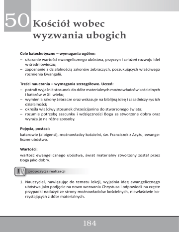 50 Kościół wobec wyzwania ubogich Cele katechetyczne – wymagania ogólne: – ukazanie wartości ewangelicznego ubóstwa, przyczyn i założeń rozwoju idei w średniowieczu; – zapoznanie z działalnością zakonów żebraczych, poszukujących właściwego rozmienia Ewangelii. Treści nauczania – wymagania szczegółowe. Uczeń: – potrafi wyjaśnić stosunek do dóbr materialnych możnowładców kościelnych i katarów w XII wieku; – wymienia zakony żebracze oraz wskazuje na biblijną ideę i zasadniczy rys ich działalności; – określa właściwy stosunek chrześcijanina do stworzonego świata; – rozumie potrzebę szacunku i wdzięczności Bogu za stworzone dobra oraz wyraża je na różne sposoby. Pojęcia, postaci: katarowie (albigensi), możnowładcy kościelni, św. Franciszek z Asyżu, ewangeliczne ubóstwo. Wartości: wartość ewangelicznego ubóstwa, świat materialny stworzony został przez Boga jako dobry. realizacji: propozycja realizacji 1 Propozycje 1. Nauczyciel, nawiązując do tematu lekcji, wyjaśnia ideę ewangelicznego ubóstwa jako podjęcie na nowo wezwania Chrystusa i odpowiedź na częste przypadki nadużyć ze strony możnowładców kościelnych, niewłaściwie korzystających z dóbr materialnych. 184 2. Zapoznanie z działalnością sekty katarów – uczniowie na podstawie tekstu z podręcznika układają w parach odezwę do mieszkańców XII-wiecznej Europy, w której ostrzegają przed albigensami (warto podpowiedzieć uczniom, by starali się ułożyć tę odezwę w duchu tamtych czasów. Można wpleść w nią odpowiedzi na pytania z sekcji zastanów się z podręcznika). 3. Odczytanie i analiza Mt 6, 25–33. 4. Przybliżenie idei i działalności wybranych zakonów, powstałych w odpowiedzi na słowa Jezusa z powyższej Ewangelii, np. cystersów, franciszkanów, dominikanów (może być w formie prezentacji multimedialnej, referatów przygotowanych przez wybranych wcześniej uczniów bądź grupowej analizy materiałów o tychże zakonach – broszur, ulotek, publikacji itp.). 5. Dyskusja – postawa współczesnych ludzi wobec piękna i wspaniałości świata (m.in. ekologia i jej właściwe rozumienie, troska o środowisko naturalne). 6. Uczniowie sporządzają w zeszycie krótką notatkę z lekcji. Inna propozycja pracy na lekcji: 123 inna propozycja pracy na lekcji Na początku lekcji nauczyciel przedstawia krótką historię albigensów i wypisuje na tablicy ich postulaty. Uczniowie się zastanawiają, czy postulaty te są zgodne z Biblią. Następnie nauczyciel zwraca uwagę na doniosłość zagadnienia ewangelicznego ubóstwa i krótko zarysowuje życiorys św. Franciszka (można posłużyć się fotogramami, przeźroczami, fragmentami filmów itp.). Wreszcie uczniowie sami dokonują refleksji, jakie jest znaczenie przesłania św. Franciszka dla dzisiejszych czasów. Pewien problem może stanowić wykonanie ćwiczenia 4. z pracy domowej. Życiorys św. Dominika nie jest łatwo dostępny. Będzie przedstawiany w późniejszych klasach. Jednakże nauczyciel religii może to ćwiczenie zlecić chętnym, którzy pragną podwyższyć ocenę (zbliża się koniec roku). Najlepszą pracę mogliby oni zaprezentować na forum klasy. Modlitwa: odczytanie przez kilkoro uczniów Pieśni słonecznej św. Franciszka z podręcznika. Polecenie 1. z podręcznika ucznia. Ewentualnie ułożenie utworu analogicznego do Pieśni słonecznej lub modlitwy dziękczynnej za dowolne stworzenie Boże (tekst utworu można skopiować z materiałów do wykorzystania lub polecić uczniom odszukanie go, np. w internecie). 185 Korelacja z innymi przedmiotami: język polski – literatura franciszkańska, misteria franciszkańskie w średniowieczu; historia – św. Franciszek i historia jego zakonu, ruchy plebejskie w średniowieczu; wiedza o społeczeństwie – odpowiedzialność chrześcijanina za środowisko naturalne, wychowanie do aktywnego udziału w życiu gospodarczym: plastyka – św. Franciszek w malarstwie, najsłynniejsze klasztory franciszkańskie we Włoszech i w Polsce, szopka bożonarodzeniowa; godziny do dyspozycji wychowawcy – odpowiedni stosunek do świata roślin i zwierząt. Materiały do wykorzystania: materiały do wykorzystania Najwyższy, wszechpotężny, dobry Panie. Twoja jest sława, chwała i cześć, i wszelkie błogosławieństwo. Pochwalony bądź, Panie, z wszystkimi swymi twory, Przede wszystkim z szlachetnym bratem naszym, słońcem, Które dzień stwarza, a Ty świecisz przez nie, I jest piękne i promienne w wielkim blasku, Twoim, Najwyższy, jest wyobrażeniem. Pochwalony bądź, Panie, przez brata naszego, wiatr, I przez powietrze, i czas pochmurny, i pogodny, i wszelki, Przez które dajesz tworom swoim utrzymanie. Pochwalony bądź, Panie, przez siostrę naszą, wodę, Co pożyteczna jest wielce i pokorna, i cenna, i czysta. 186 Pochwalony bądź, Panie, przez brata naszego, ogień, Którym oświecasz noc, A on jest piękny i radosny, i silny, i mocny. Pochwalony bądź, Panie, przez siostrę naszą, matkę ziemię, Która nas żywi i chowa, I rodzi różne owoce z barwnymi kwiaty i zioły. Pochwalony bądź, Panie, przez tych, co przebaczają dla miłości Twojej, I znoszą słabości i utrapienia. Błogosławieni, którzy wytrwają w pokoju, Gdyż przez Ciebie, Najwyższy, będą uwieńczeni. Św. Franciszek z Asyżu, Pieśń słoneczna; tłum. Leopold Staff 187