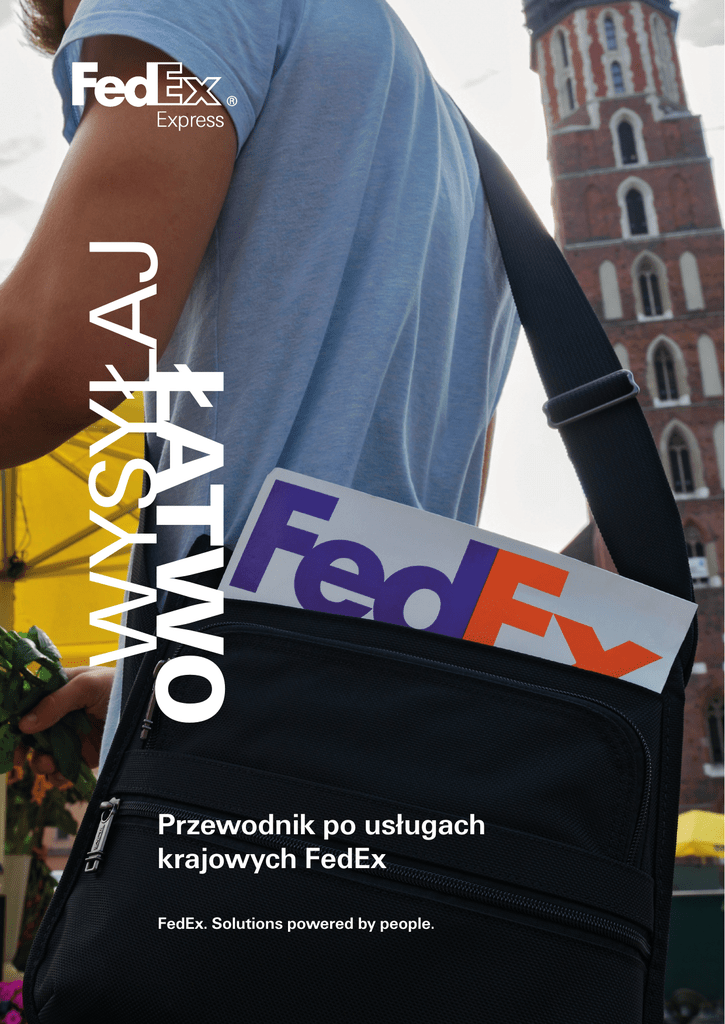 WYSYŁAJ ŁATWO Przewodnik po usługach krajowych FedEx FedEx. Solutions powered by people. Witamy w FedEx Usługi FedEx to gwarancja niezawodnej dostawy przesyłek ekspresowych i optymalne rozwiązania wspierające rozwój Twojej firmy. Wykorzystując globalną sieć połączeń lotniczych i drogowych, docieramy na czas do 220 krajów i terytoriów na całym świecie, łącząc każdego dnia krajowych oraz międzynarodowych przedsiębiorców. Z FedEx zyskujesz dostęp do wiedzy i wieloletniego doświadczenia, zebranych na wielu rynkach lokalnych, w skali dostosowanej do potrzeb Twojej firmy. Niezależnie od tego, czy wysyłasz paczkę, czy paletę, jeśli Twoi partnerzy oczekują natychmiastowej dostawy, doręczymy przesyłkę nawet we wczesnych godzinach porannych. Decydując się na współpracę z FedEx, masz więc pewność, że obietnice złożone Twoim klientom i partnerom biznesowym zostaną dotrzymane. Jeśli szukasz czegoś więcej niż standardowa usługa, wspólnie wypracujemy rozwiązanie najlepsze dla Ciebie. Spis treści Przesyłki lekkie: paczki 4 Nadawanie paczek Usługi standardowe Dostępne usługi dodatkowe i dedykowane Paczka standardowa a niestandardowa Wycena paczek Obsługa paczek Przygotowanie i pakowanie paczek Przesyłki ciężkie: palety 9 Nadawanie palet Usługi standardowe Dostępne usługi dodatkowe i dedykowane Palety standardowe, dłużyce i inne przesyłki specjalne Wycena palet Obsługa palet Rozwiązania FedEx dla biznesu 12 Usługi dodatkowe Usługi dedykowane Nadawanie przesyłek z FedEx 18 Narzędzia automatyzacji wysyłki 20 Narzędzia dla małych i średnich przedsiębiorstw Zaawansowane rozwiązania dla wymagających klientów Cennik usług krajowych 21 Kontakt 27 Przesyłki lekkie: paczki Wybierz jedną z naszych niezawodnych usług FedEx Next Day, dającą możliwość doręczenia paczki do odbiorcy już na następny dzień roboczy - na terenie całego kraju. Jednocześnie, jeżeli czas i szybkość działania mają dla Ciebie kluczowe znaczenie, oferujemy Ci możliwość doręczenia paczki we wczesnych godzinach porannych: do 9:00, 10:00 lub 12:00. Dzięki temu masz pewność, że ważne i pilne dla Twojego biznesu przesyłki zostaną doręczone już z samego rana następnego dnia. Nadawanie paczek Z FedEx możesz nadać dokumenty i paczki o określonych wymiarach i kształtach. Twoja przesyłka zostanie nadana i wyceniona jako paczka, jeśli spełni wszystkie poniższe warunki: n a liście przewozowym zostanie oznaczona jako paczka poprzez wpisanie liczby elementów przesyłki w odpowiednich przedziałach wagowych dla paczek waga rzeczywista lub gabarytowa każdego z elementów przesyłki jest niższa niż 70 kg suma długości, szerokości i wysokości pojedynczego elementu nie jest większa niż 300 cm najdłuższy bok żadnego z elementów przesyłki nie przekracza długości 200 cm Wymiary paczki Najdłuższy bok paczki a + b + c ≤ 300 cm c a b 4 Przewodnik po usługach krajowych ≤ 200 cm Przesyłki lekkie: paczki Usługi standardowe Ekspresowe doręczenia poranne FedEx Next Day do 9 FedEx Next Day do 10 Doręczenie przesyłki standardowej o wadze do 35 kg, realizowane do godziny 9:00 następnego dnia roboczego(1). Doręczenie przesyłki standardowej o wadze do 35 kg, realizowane do godziny 10:00 następnego dnia roboczego(1). FedEx Next Day do 12 Doręczenie przesyłki standardowej o wadze do 35 kg, realizowane do godziny 12:00 następnego dnia roboczego(1). Doręczenia na następny dzień FedEx Next Day Standard Sprawdź dostępność porannych usług ekspresowych na fedex.com/pl Doręczenie do adresata przesyłki standardowej i niestandardowej o wadze do 70 kg na następny dzień roboczy - na terenie całego kraju. Dostępne usługi dodatkowe i dedykowane Alternatywna godzina doręczenia Dodatkowe opcje doręczenia Notyfikacje Usługi dedykowane Przetarg Pobranie Telefon od kuriera Przesyłka proceduralna FedEx Evening 17-19/19-22 Zniesienie/Wniesienie SMS Pakiet zwrotny Doręczenie w sobotę Zwrot potwierdzonych dokumentów (ZPD) E-mail Etykieta zwrotna Doręczenie do rąk własnych Skanowanie i archiwizacja Potwierdzenie doręczenia Możliwość nadania usługi FedEx Next Day do 9/10/12 zależy od kodu pocztowego, na który ma zostać doręczona. Dostępność usług krajowych FedEx dla wybranych kodów pocztowych w Polsce sprawdź na stronie fedex.com/pl (1) Przewodnik po usługach krajowych 5 Przesyłki lekkie: paczki Paczka standardowa a niestandardowa Paczka standardowa to pojedynczy element o kształcie prostopadłościanu, którego najdłuższa krawędź nie jest dłuższa niż 150 cm, a żadna z pozostałych krawędzi nie jest dłuższa niż 70 cm, przy czym suma dwóch najdłuższych krawędzi jest mniejsza niż 180 cm. Podstawę paczki standardowej stanowi zawsze bok o największej powierzchni. Zakwalifikujemy Twoją paczkę jako standardową, jeżeli żaden jej fragment nie będzie przekraczać wymiarów paczki standardowej. Paczkami standardowymi są również koperty tekturowe oraz tuby o przekroju trójkątnym. Maksymalna waga paczki standardowej wynosi 35 kg, a jej opakowanie nie może utrudniać lub uniemożliwiać przesuwania jej po gładkich i płaskich powierzchniach. Paczka, która ze względu na swoje przymioty, m.in. takie jak: wymiar, nieregularny kształt czy wrażliwa na uszkodzenia zawartość, nie może być sortowana za pomocą mechanicznego sortera - w wyniku konieczności manualnego traktowania - zostanie zakwalifikowana jako paczka niestandardowa. Wymiary paczki standardowej Paczka niestandardowa to każdy element będący paczką, którego ze względu na swoje rozmiary lub właściwości nie możemy zakwalifikować jako paczkę standardową. Paczkami niestandardowymi będą m.in. paczki: • zawierające płyny lub takie z luźną zawartością, mogące ulec rozdarciu • z ostrymi bądź wystającymi elementami, • ze znacznie przesuniętym środkiem ciężkości lub łatwo przewracające się, 