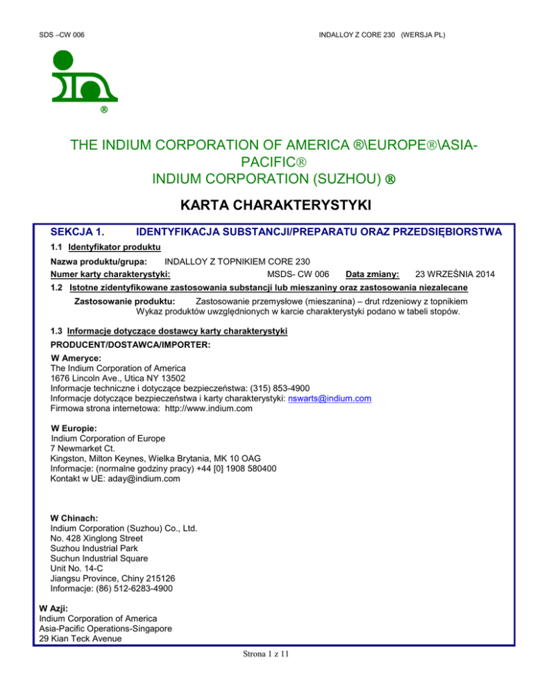 SDS –CW 006 INDALLOY Z CORE 230 (WERSJA PL) THE INDIUM CORPORATION OF AMERICA ®\EUROPE\ASIAPACIFIC INDIUM CORPORATION (SUZHOU) KARTA CHARAKTERYSTYKI SEKCJA 1. IDENTYFIKACJA SUBSTANCJI/PREPARATU ORAZ PRZEDSIĘBIORSTWA 1.1 Identyfikator produktu Nazwa produktu/grupa: INDALLOY Z TOPNIKIEM CORE 230 Numer karty charakterystyki: MSDS- CW 006 Data zmiany: 23 WRZEŚNIA 2014 1.2 Istotne zidentyfikowane zastosowania substancji lub mieszaniny oraz zastosowania niezalecane Zastosowanie produktu: Zastosowanie przemysłowe (mieszanina) – drut rdzeniowy z topnikiem Wykaz produktów uwzględnionych w karcie charakterystyki podano w tabeli stopów. 1.3 Informacje dotyczące dostawcy karty charakterystyki PRODUCENT/DOSTAWCA/IMPORTER: W Ameryce: The Indium Corporation of America 1676 Lincoln Ave., Utica NY 13502 Informacje techniczne i dotyczące bezpieczeństwa: (315) 853-4900 Informacje dotyczące bezpieczeństwa i karty charakterystyki: [email protected] Firmowa strona internetowa: http://www.indium.com W Europie: Indium Corporation of Europe 7 Newmarket Ct. Kingston, Milton Keynes, Wielka Brytania, MK 10 OAG Informacje: (normalne godziny pracy) +44 [0] 1908 580400 Kontakt w UE: [email protected] W Chinach: Indium Corporation (Suzhou) Co., Ltd. No. 428 Xinglong Street Suzhou Industrial Park Suchun Industrial Square Unit No. 14-C Jiangsu Province, Chiny 215126 Informacje: (86) 512-6283-4900 W Azji: Indium Corporation of America Asia-Pacific Operations-Singapore 29 Kian Teck Avenue Strona 1 z 11 SDS –CW 006 INDALLOY Z CORE 230 (WERSJA PL) Singapur 628908 Informacje: +65 6268-8678 1.4 Numer telefonu alarmowego NUMER TELEFONU TYLKO W RAZIE ZAGROŻENIA CHEMICZNEGO*: CHEMTREC (całodobowy) USA: 1 (800) 424-9300 Poza USA: +1 (703) 527-3887 * Dzwonić jedynie w razie rozlania/wycieku/pożaru/narażenia/wypadku WSZYSTKIE INNE ZAPYTANIA: NUMER BEZPŁATNY: +1-800-448-9240 Indium Corporation SEKCJA 2. IDENTYFIKACJA ZAGROŻEŃ 2.1 Klasyfikacja substancji lub mieszaniny Klasyfikacja zgodnie z dyrektywami UE 67/548/EWG lub 1999/45/WE Zwroty R: Symbol Xi R36/37/38, R42/43 2.2 Elementy etykiety Oznakowanie zgodnie z rozporządzeniem (WE) nr 1272/2008 Piktogramy Hasło ostrzegawcze: Ostrzeżenie Zwroty wskazujące rodzaj zagrożenia H317 Może powodować reakcję alergiczną skóry H319 Działa drażniąco na oczy H334 Może powodować objawy alergii lub astmy lub trudności w oddychaniu w następstwie wdychania H335 Może powodować podrażnienie dróg oddechowych. EUH208 Zawiera kalafonię. Może powodować wystąpienie reakcji alergicznej Zwroty wskazujące środki ostrożności P233 Przechowywać pojemnik szczelnie zamknięty P261 Unikać wdychania pyłu/dymu/gazu/mgły/par/rozpylonej cieczy P270 Nie jeść, nie pić ani nie palić podczas używania produktu P273 Unikać uwolnienia do środowiska P280 Stosować rękawice ochronne/ odzież ochronną/ ochronę oczu /ochronę twarzy P362 Zanieczyszczoną odzież zdjąć i wyprać przed ponownym użyciem P301 + P314 W PRZYPADKU SPOŻYCIA: W przypadku złego samopoczucia zasięgnąć porady/zgłosić się pod opiekę lekarza. P302 +P352 W PRZYPADKU DOSTANIA SIĘ NA SKÓRĘ: Umyć dużą ilością wody z mydłem. P304 + 341 W PRZYPADKU DOSTANIA SIĘ DO DRÓG ODDECHOWYCH: W przypadku trudności z Strona 2 z 11 SDS –CW 006 INDALLOY Z CORE 230 (WERSJA PL) oddychaniem, wyprowadzić lub wynieść poszkodowanego na świeże powietrze i zapewnić warunki do odpoczynku w pozycji umożliwiającej swobodne oddychanie. P305 + 351 W PRZYPADKU DOSTANIA SIĘ DO OCZU: Ostrożnie płukać wodą przez kilka minut (15 min) GŁÓWNE DROGI NARAŻENIA: ⊗Oczy ⊗Wdychanie Czynnik rakotwórczy wymieniony w: ⊗Skóra ⊗Spożycie NTP IARC OSHA ⊗Niewymieniony 2.3 INNE ZAGROŻENIA MOŻLIWE SKUTKI DLA ZDROWIA: Kontakt z oczami: Działa drażniąco na oczy; jeśli nie zostanie usunięty, może doprowadzić do ciężkiego podrażnienia oczu. Kontakt z dymami stopionego metalu może powodować podrażnienie. Połknięcie: Produkt zawiera stopy metali i związki organiczne. Może wywoływać podrażnienie. . Dostanie się do dróg oddechowych: Wdychanie dymów lub pyłu może spowodować miejscowe podrażnienie dróg oddechowych. Kontakt ze skórą: Może wywoływać podrażnienie lub zapalenie skóry. Kalafonia może wywoływać uczulenie skóry. Przewlekłe: SREBRO: Długotrwały kontakt ze skórą lub spożycie proszku, soli lub dymów srebra może spowodować chorobę o nazwie argyria, powodującą niebieskawe zabarwienie skóry i oczu. CYNA: W badaniach na zwierzętach stwierdzono zwiększoną częstość występowania mięsaka. MIEDŹ: Nadmierne narażenie na dymy miedzi może powodować gorączkę miedziową (dreszcze, bóle mięśni, nudności, gorączka, suchość w gardle, kaszel, osłabienie, zobojętnienie), metaliczny lub słodki smak, przebarwienie skóry i włosów. Normalne postępowanie ze stałym metalem nie jest szkodliwe. SEKCJA 3. SKŁAD I INFORMACJA O SKŁADNIKACH 3.2 Mieszanina: Składniki % wag Nr identyfikacyjny CAS/ NR EINECS CYNA * 7440-31-5/231-141-8 SREBRO * 7440-22-4/231-131-3 MIEDŹ * 7440-50-8 /231-159-6 Strona 3 z 11 SDS –CW 006 INDALLOY Z CORE 230 (WERSJA PL) KALAFONIA, MIESZANINA 1,0-5,0 65997-05-9 PRODUKT NIE ZAWIERA SUBSTANCJI WZBUDZAJĄCYCH SZCZEGÓLNIE DUŻE OBAWY (SVHC) ZGŁASZANYCH WEDŁUG REACH W UE. N.O. = nie określono * zawartości procentowe w mieszaninach stopowych - patrz tabela stopów http://www.indium.com TABELA STOPÓW Indalloy (mieszanina metali) 121 CYNA (%) Sn 96,5 SREBRO (%) Ag 3,5 MIEDŹ (%) Cu - Ciężar właściwy 7,50 Zgodność z RoHS 2 Tak 241 (SAC 387) 95,5 3,8 0,7 7,40 Tak 256 (SAC 305) 96,5 3 0,5 7,35 Tak 263 (SAC0307) 99 0,3 0,7 7,31 Tak RoHS 2 = (2011/65/WE) SEKCJA 4. PIERWSZA POMOC 4.1 Opis pierwszej pomocy: Kontakt z oczami: Rozchylić powieki i przemywać oczy dużą ilością letniej wody co najmniej przez 15 minut. W razie utrzymywania się podrażnienia skonsultować się z lekarzem. Połknięcie: Jeśli poszkodowa