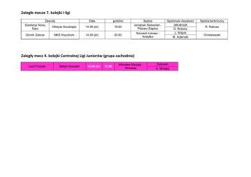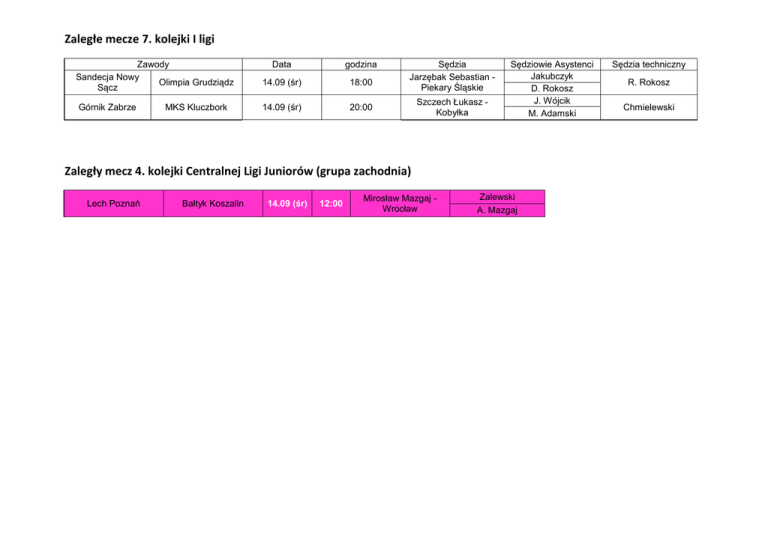 Zaległe mecze 7. kolejki I ligi Zawody Sandecja Nowy Olimpia Grudziądz Sącz Górnik Zabrze MKS Kluczbork Data godzina 14.09 (śr) 18:00 14.09 (śr) 20:00 Sędzia Jarzębak Sebastian Piekary Śląskie Szczech Łukasz Kobyłka Sędziowie Asystenci Jakubczyk D. Rokosz J. Wójcik M. Adamski Zaległy mecz 4. kolejki Centralnej Ligi Juniorów (grupa zachodnia) Lech Poznań Bałtyk Koszalin 14.09 (śr) 12:00 Mirosław Mazgaj Wrocław Zalewski A. Mazgaj Sędzia techniczny R. Rokosz Chmielewski