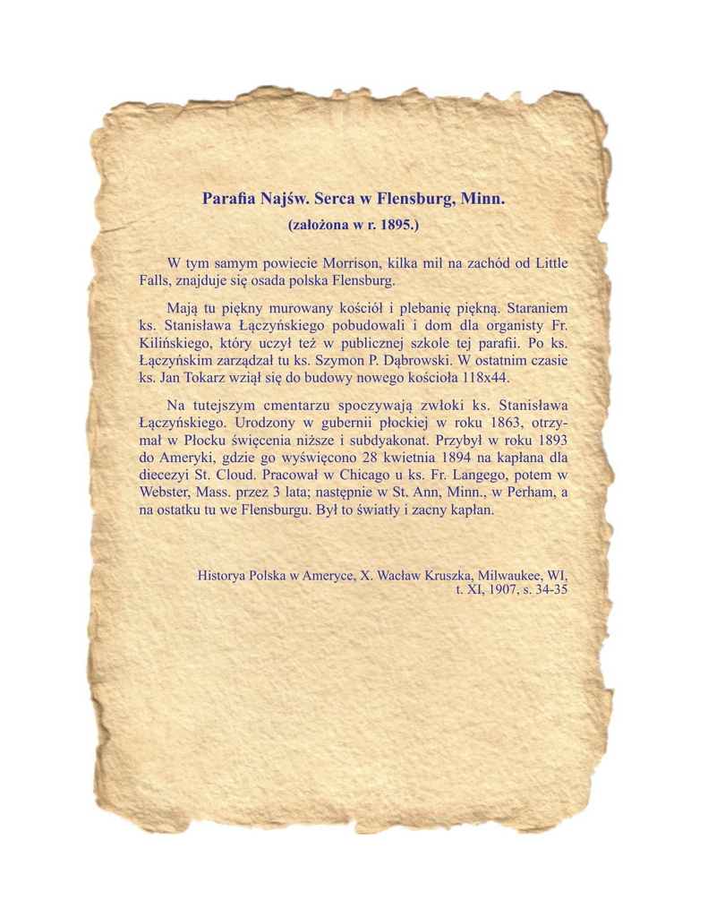 Parafia Najśw. Serca w Flensburg, Minn. (założona w r. 1895.) W tym samym powiecie Morrison, kilka mil na zachód od Little Falls, znajduje się osada polska Flensburg. Mają tu piękny murowany kościół i plebanię piękną. Staraniem ks. Stanisława Łączyńskiego pobudowali i dom dla organisty Fr. Kilińskiego, który uczył też w publicznej szkole tej parafii. Po ks. Łączyńskim zarządzał tu ks. Szymon P. Dąbrowski. W ostatnim czasie ks. Jan Tokarz wziął się do budowy nowego kościoła 118x44. Na tutejszym cmentarzu spoczywają zwłoki ks. Stanisława Łączyńskiego. Urodzony w gubernii płockiej w roku 1863, otrzymał w Płocku święcenia niższe i subdyakonat. Przybył w roku 1893 do Ameryki, gdzie go wyświęcono 28 kwietnia 1894 na kapłana dla diecezyi St. Cloud. Pracował w Chicago u ks. Fr. Langego, potem w Webster, Mass. przez 3 lata; następnie w St. Ann, Minn., w Perham, a na ostatku tu we Flensburgu. Był to światły i zacny kapłan. Historya Polska w Ameryce, X. Wacław Kruszka, Milwaukee, WI, t. XI, 1907, s. 34-35