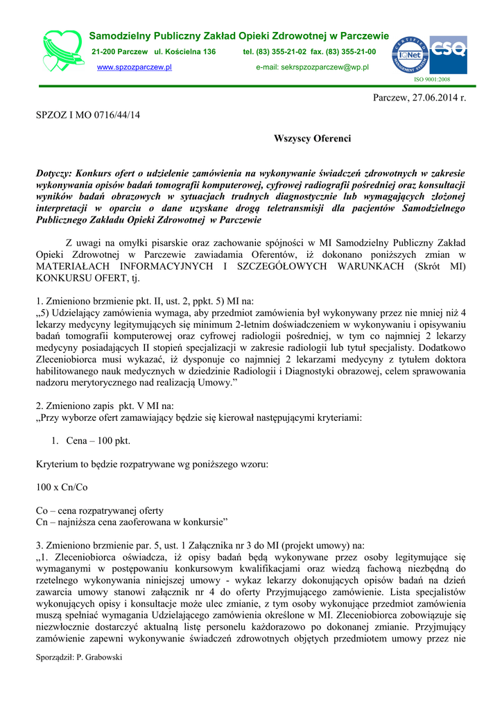 Samodzielny Publiczny Zakład Opieki Zdrowotnej w Parczewie 21-200 Parczew ul. Kościelna 136 www.spzozparczew.pl tel. (83) 355-21-02 fax. (83) 355-21-00 e-mail: [email protected] ISO 9001:2008 Parczew, 27.06.2014 r. SPZOZ I MO 0716/44/14 Wszyscy Oferenci Dotyczy: Konkurs ofert o udzielenie zamówienia na wykonywanie świadczeń zdrowotnych w zakresie wykonywania opisów badań tomografii komputerowej, cyfrowej radiografii pośredniej oraz konsultacji wyników badań obrazowych w sytuacjach trudnych diagnostycznie lub wymagających złożonej interpretacji w oparciu o dane uzyskane drogą teletransmisji dla pacjentów Samodzielnego Publicznego Zakładu Opieki Zdrowotnej w Parczewie Z uwagi na omyłki pisarskie oraz zachowanie spójności w MI Samodzielny Publiczny Zakład Opieki Zdrowotnej w Parczewie zawiadamia Oferentów, iż dokonano poniższych zmian w MATERIAŁACH INFORMACYJNYCH I SZCZEGÓŁOWYCH WARUNKACH (Skrót MI) KONKURSU OFERT, tj. 1. Zmieniono brzmienie pkt. II, ust. 2, ppkt. 5) MI na: „5) Udzielający zamówienia wymaga, aby przedmiot zamówienia był wykonywany przez nie mniej niż 4 lekarzy medycyny legitymujących się minimum 2-letnim doświadczeniem w wykonywaniu i opisywaniu badań tomografii komputerowej oraz cyfrowej radiologii pośredniej, w tym co najmniej 2 lekarzy medycyny posiadających II stopień specjalizacji w zakresie radiologii lub tytuł specjalisty. Dodatkowo Zleceniobiorca musi wykazać, iż dysponuje co najmniej 2 lekarzami medycyny z tytułem doktora habilitowanego nauk medycznych w dziedzinie Radiologii i Diagnostyki obrazowej, celem sprawowania nadzoru merytorycznego nad realizacją Umowy.” 2. Zmieniono zapis pkt. V MI na: „Przy wyborze ofert zamawiający będzie się kierował następującymi kryteriami: 1. Cena – 100 pkt. Kryterium to będzie rozpatrywane wg poniższego wzoru: 100 x Cn/Co Co – cena rozpatrywanej oferty Cn – najniższa cena zaoferowana w konkursie” 3. Zmieniono brzmienie par. 5, ust. 1 Załącznika nr 3 do MI (projekt umowy) na: „1. Zleceniobiorca oświadcza, iż opisy badań będą wykonywane przez osoby legitymujące się wymaganymi w postępowaniu konkursowym kwalifikacjami oraz wiedzą fachową niezbędną do rzetelnego wykonywania niniejszej umowy - wykaz lekarzy dokonujących opisów badań na dzień zawarcia umowy stanowi załącznik nr 4 do oferty Przyjmującego zamówienie. Lista specjalistów wykonujących opisy i konsultacje może ulec zmianie, z tym osoby wykonujące przedmiot zamówienia muszą spełniać wymagania Udzielającego zamówienia określone w MI. Zleceniobiorca zobowiązuje się niezwłocznie dostarczyć aktualną listę personelu każdorazowo po dokonanej zmianie. Przyjmujący zamówienie zapewni wykonywanie świadczeń zdrowotnych objętych przedmiotem umowy przez nie Sporządził: P. Grabowski Samodzielny Publiczny Zakład Opieki Zdrowotnej w Parczewie 21-200 Parczew ul. Kościelna 136 www.spzozparczew.pl tel. (83) 355-21-02 fax. (83) 355-21-00 e-mail: [email protected] ISO 9001:2008 mniej niż 4 lekarzy medycyny legitymujących się minimum 2-letnim doświadczeniem w wykonywaniu i opisywaniu badań tomografii komputerowej oraz cyfrowej radiologii pośredniej, w tym co najmniej 2 lekarzy medycyny posiadających II stopień specjalizacji w zakresie radiologii lub tytuł specjalisty. Dodatkowo Zleceniobiorca oświadcza, iż dysponuje co najmniej 2 lekarzami medycyny z tytułem doktora habilitowanego nauk medycznych w dziedzinie Radiologii i Diagnostyki obrazowej, celem sprawowania nadzoru merytorycznego nad realizacją Umowy.” Janusz Hordejuk Dyrektor SP ZOZ w Parczewie Załącznik: 1. MATERIAŁY INFORMACYJNE I SZCZEGÓŁOWE WARUNKI (Skrót MI) KONKURSU OFERT o udzielenie zamówienia na wykonywanie świadczeń zdrowotnych w zakresie wykonywania opisów badań tomografii komputerowej, cyfrowej radiografii pośredniej oraz konsultacji wyników badań obrazowych w sytuacjach trudnych diagnostycznie lub wymagających złożonej interpretacji w oparciu o dane uzyskane drogą teletransmisji dla pacjentów Samodzielnego Publicznego Zakładu Opieki Zdrowotnej w Parczewie po zmianach. Sporządził: P. Grabowski