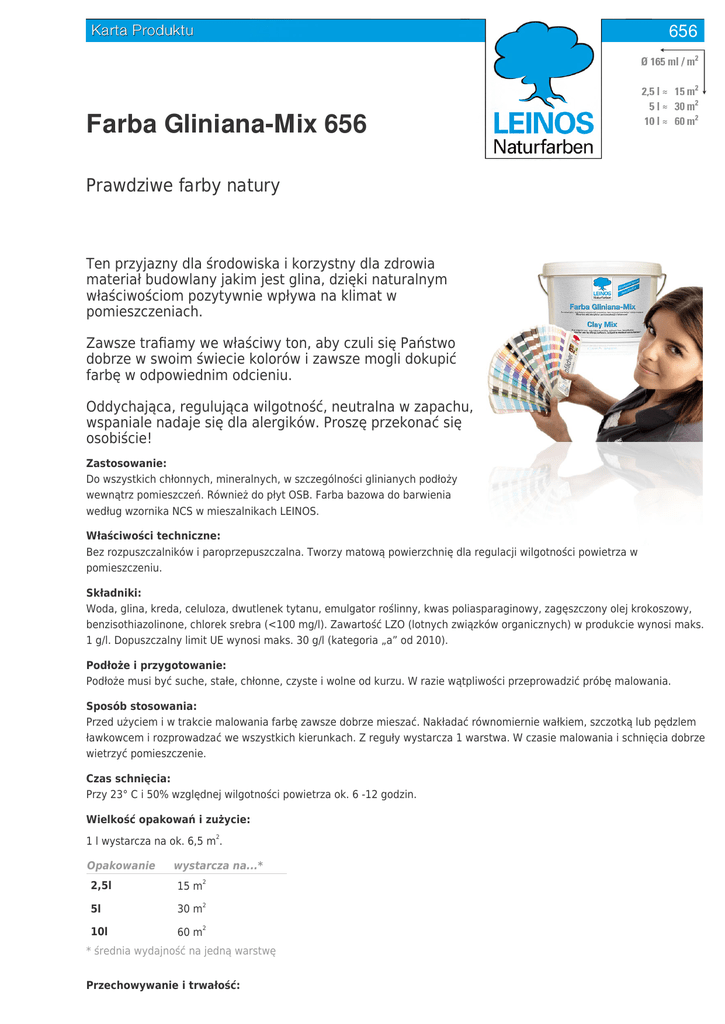 656 Farba Gliniana-Mix 656 Prawdziwe farby natury Ten przyjazny dla środowiska i korzystny dla zdrowia materiał budowlany jakim jest glina, dzięki naturalnym właściwościom pozytywnie wpływa na klimat w pomieszczeniach. Zawsze trafiamy we właściwy ton, aby czuli się Państwo dobrze w swoim świecie kolorów i zawsze mogli dokupić farbę w odpowiednim odcieniu. Oddychająca, regulująca wilgotność, neutralna w zapachu, wspaniale nadaje się dla alergików. Proszę przekonać się osobiście! Zastosowanie: Do wszystkich chłonnych, mineralnych, w szczególności glinianych podłoży wewnątrz pomieszczeń. Również do płyt OSB. Farba bazowa do barwienia według wzornika NCS w mieszalnikach LEINOS. Właściwości techniczne: Bez rozpuszczalników i paroprzepuszczalna. Tworzy matową powierzchnię dla regulacji wilgotności powietrza w pomieszczeniu. Składniki: Woda, glina, kreda, celuloza, dwutlenek tytanu, emulgator roślinny, kwas poliasparaginowy, zagęszczony olej krokoszowy, benzisothiazolinone, chlorek srebra (<100 mg/l). Zawartość LZO (lotnych związków organicznych) w produkcie wynosi maks. 1 g/l. Dopuszczalny limit UE wynosi maks. 30 g/l (kategoria „a” od 2010). Podłoże i przygotowanie: Podłoże musi być suche, stałe, chłonne, czyste i wolne od kurzu. W razie wątpliwości przeprowadzić próbę malowania. Sposó b stosowania: Przed użyciem i w trakcie malowania farbę zawsze dobrze mieszać. Nakładać równomiernie wałkiem, szczotką lub pędzlem ławkowcem i rozprowadzać we wszystkich kierunkach. Z reguły wystarcza 1 warstwa. W czasie malowania i schnięcia dobrze wietrzyć pomieszczenie. Czas schnięcia: Przy 23° C i 50% względnej wilgotności powietrza ok. 6 -12 godzin. Wielkość opakowań i zużycie: 1 l wystarcza na ok. 6,5 m2. Opakowanie wystarcza na...* 2,5l 15 m2 5l 30 m2 10l 60 m2 * średnia wydajność na jedną warstwę Przechowywanie i trwałość: Przechowywać w chłodnym i suchym miejscu. Chronić przed mrozem! Farba oryginalnie zamknięta zachowuje trwałość przynajmniej przez 1 rok. Napoczęte opakowanie zużyć w ciągu 2 dni. Utylizacja: Zgodnie z lokalnymi, urzędowymi przepisami. Wysuszone resztki produktu mogą być usuwane do odpadów komunalnych. Europejski kod odpadu EWC: 08 01 20. Środki rozcieńczające i czyszczące: Narzędzia pracy umyć natychmiast po użyciu wodą z Mydłem Roślinnym LEINOS 930 . Zwroty wskazujące środki ostrożności: Zawiera 1,2-benzoizotiazol-3(2H)-on. Może powodować wystąpienie reakcji alergicznej. Karta charakterystyki dostępna na życzenie. Chronić przed dziećmi. Unikać uwolnienia do środowiska. Zawartość/pojemnik usuwać zgodnie z lokalnymi przepisami. Kontakt dla alergików: +48 / 608 031 784 Aby osiągnąć optymalne wyniki należy przestrzegać zaleceń Kart Produktów wszystkich stosowanych produktów. Informacje opierają się na aktualnym stanie naszej wiedzy i doświadczeń. Nie stanowią jednak zapewnienia o właściwościach produktu i nie mają skutku prawnego umowy. Wraz z ukazaniem się tej Karty Produktu wszystkie poprzednie informacje tracą swoją ważność. Stan: 08.03.2017 Dystrybutor: AMBIENTE • Tomasz Szczepański • ul. Reymonta 12 • 48-370 Paczków tel./faks: +48(0)77/43175 23 • [email protected] • www.LEINOS.pl Producent: LEINOS • Reincke Naturfarben GmbH • Rudolf-Diesel-Straße 4 • 21614 Buxtehude, Germany Tel. +49 (0) 41 61 - 99 45 40 • www.LEINOS.de • [email protected]
