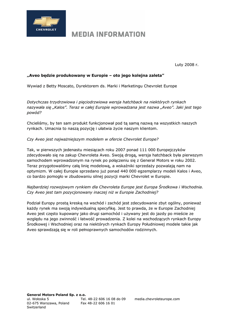 Luty 2008 r. „Aveo będzie produkowany w Europie – oto jego kolejna zaleta” Wywiad z Betty Moscato, Dyrektorem ds. Marki i Marketingu Chevrolet Europe Dotychczas trzydrzwiowa i pięciodrzwiowa wersja hatchback na niektórych rynkach nazywała się „Kalos”. Teraz w całej Europie wprowadzana jest nazwa „Aveo”. Jaki jest tego powód? Chcieliśmy, by ten sam produkt funkcjonował pod tą samą nazwą na wszystkich naszych rynkach. Umacnia to naszą pozycję i ułatwia życie naszym klientom. Czy Aveo jest najważniejszym modelem w ofercie Chevrolet Europe? Tak, w pierwszych jedenastu miesiącach roku 2007 ponad 111 000 Europejczyków zdecydowało się na zakup Chevroleta Aveo. Swoją drogą, wersja hatchback była pierwszym samochodem wprowadzonym na rynek po połączeniu się z General Motors w roku 2002. Teraz przygotowaliśmy całą linię modelową, a wskaźniki sprzedaży pozwalają nam na optymizm. W całej Europie sprzedano już ponad 440 000 egzemplarzy modeli Kalos i Aveo, co bardzo pomogło w zbudowaniu silnej pozycji marki Chevrolet w Europie. Najbardziej rozwojowym rynkiem dla Chevroleta Europe jest Europa Środkowa i Wschodnia. Czy Aveo jest tam pozycjonowany inaczej niż w Europie Zachodniej? Podział Europy prostą kreską na wschód i zachód jest zdecydowanie zbyt ogólny, ponieważ każdy rynek ma swoją indywidualną specyfikę. Jest to prawda, że w Europie Zachodniej Aveo jest często kupowany jako drugi samochód i używany jest do jazdy po mieście ze względu na jego zwinność i łatwość prowadzenia. Z kolei na wschodzących rynkach Europy Środkowej i Wschodniej oraz na niektórych rynkach Europy Południowej modele takie jak Aveo sprawdzają się w roli pełnoprawnych samochodów rodzinnych. General Motors Poland Sp. z o.o. ul. Wołoska 5 Tel. 48-22 606 16 08 do 09 02-675 Warszawa, Poland Fax 48-22 606 16 01 Switzerland media.chevroleteurope.com -2- Nowy Aveo hatchback od lipca będzie produkowany w Warszawie. Jakie przyniesie to zmiany? Pod względem jakości i od strony technicznej nie odczujemy żadnych różnic, ponieważ wszystkie nasze zakłady produkcyjne na całym świecie pracują zgodnie z tymi samymi wysokimi standardami, czyli Globalnym Systemem Produkcyjnym GM (GM GMS). Nowy zakład produkcyjny pozwoli nam przede wszystkim zaspokoić szybko rosnące zapotrzebowanie klientów i bardziej elastyczne odpowiadać na potrzeby kierowców, a także skrócić czas i zmniejszyć koszty transportu. To, że Aveo będzie teraz produkowany w Europie, dla wielu Europejczyków będzie też miało istotne znaczenie z emocjonalnego punktu widzenia. Prawdopodobnie samochody wyprodukowane w Warszawie zostaną w Europie, ale Aveo jest też sprzedawany na innych kontynentach, prawda? Tak, Chevrolet Aveo to bardzo kosmopolityczny samochód, ponieważ można go nabyć w ponad 120 krajach na całym świecie, w tym w Australii, Nowej Zelandii, Chinach czy USA. W Europie rozgorzała ostatnio burzliwa dyskusja, w której dużo mówi się o ograniczeniu zużycia paliwa i emisji CO2. Jak wyglądają działania Chevrolet Europe na rzecz ochrony środowiska? Chevrolet Aveo jest dobrym przykładem obrazującym naszą strategię troski o środowisko. W porównaniu ze swoim poprzednikiem nowy Aveo 1.2 zużywa o 14 procent paliwa mniej. Jest to zmiana korzystna i dla środowiska, i dla portfela kierowcy. Technologie oszczędzania paliwa służą też przecież oszczędnościom. Pamiętamy o tej dewizie także podczas projektowania samochodów z silnikiem diesla. W wielu krajach kierowcy oszczędni i wyczuleni na problemy środowiska mogą skorzystać z opcji zmiany paliwa zasilającego z benzyny na gaz (LPG). Na przykład napędzany gazem Chevrolet Spark/Matiz S 0.8 emituje 111 g CO2 na kilometr, co czyni go jednym z najbardziej ekologicznych samochodów na rynku. Natomiast to, jak w przyszłości może wyglądać ekologiczna jazda, widać na przykładzie naszego koncepcyjnego samochodu elektrycznego – Chevroleta Volt. Betty Moscato jest Dyrektorem ds. Marki i Marketingu Chevrolet Europe i od maja 2007 roku stoi na czele europejskiego zespołu ds. marketingu. Betty Moscato urodziła się w Brazylii, zaś przed objęciem obecnego stanowiska pracowała dla Chevroleta w Argentynie. General Motors Poland Sp. z o.o. ul. Wołoska 5 Tel. 48-22 606 16 08 do 09 02-675 Warszawa, Poland Fax 48-22 606 16 01 Switzerland media.chevroleteurope.com -3- Osoby kontaktowe: Przemyslaw (Przemek) Byszewski PR Direktor GM Poland +48 22 606 16 08 kom. +48 604 158 990 Fax +48 22 606 16 01 [email protected] General Motors Poland Sp. z o.o. ul. Wołoska 5 Tel. 48-22 606 16 08 do 09 02-675 Warszawa, Poland Fax 48-22 606 16 01 Switzerland media.chevroleteurope.com