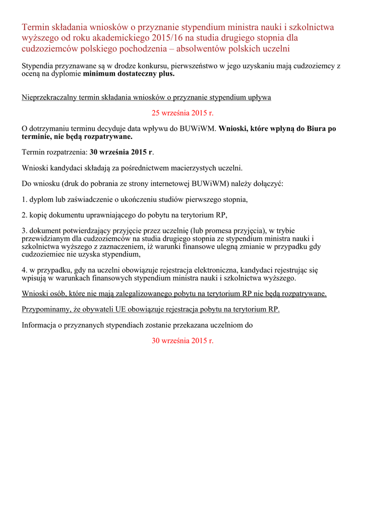 Termin składania wniosków o przyznanie stypendium ministra nauki i szkolnictwa wyższego od roku akademickiego 2015/16 na studia drugiego stopnia dla cudzoziemców polskiego pochodzenia – absolwentów polskich uczelni Stypendia przyznawane są w drodze konkursu, pierwszeństwo w jego uzyskaniu mają cudzoziemcy z oceną na dyplomie minimum dostateczny plus. Nieprzekraczalny termin składania wniosków o przyznanie stypendium upływa 25 września 2015 r. O dotrzymaniu terminu decyduje data wpływu do BUWiWM. Wnioski, które wpłyną do Biura po terminie, nie będą rozpatrywane. Termin rozpatrzenia: 30 września 2015 r. Wnioski kandydaci składają za pośrednictwem macierzystych uczelni. Do wniosku (druk do pobrania ze strony internetowej BUWiWM) należy dołączyć: 1. dyplom lub zaświadczenie o ukończeniu studiów pierwszego stopnia, 2. kopię dokumentu uprawniającego do pobytu na terytorium RP, 3. dokument potwierdzający przyjęcie przez uczelnię (lub promesa przyjęcia), w trybie przewidzianym dla cudzoziemców na studia drugiego stopnia ze stypendium ministra nauki i szkolnictwa wyższego z zaznaczeniem, iż warunki finansowe ulegną zmianie w przypadku gdy cudzoziemiec nie uzyska stypendium, 4. w przypadku, gdy na uczelni obowiązuje rejestracja elektroniczna, kandydaci rejestrując się wpisują w warunkach finansowych stypendium ministra nauki i szkolnictwa wyższego. Wnioski osób, które nie mają zalegalizowanego pobytu na terytorium RP nie będą rozpatrywane. Przypominamy, że obywateli UE obowiązuje rejestracja pobytu na terytorium RP. Informacja o przyznanych stypendiach zostanie przekazana uczelniom do 30 września 2015 r.