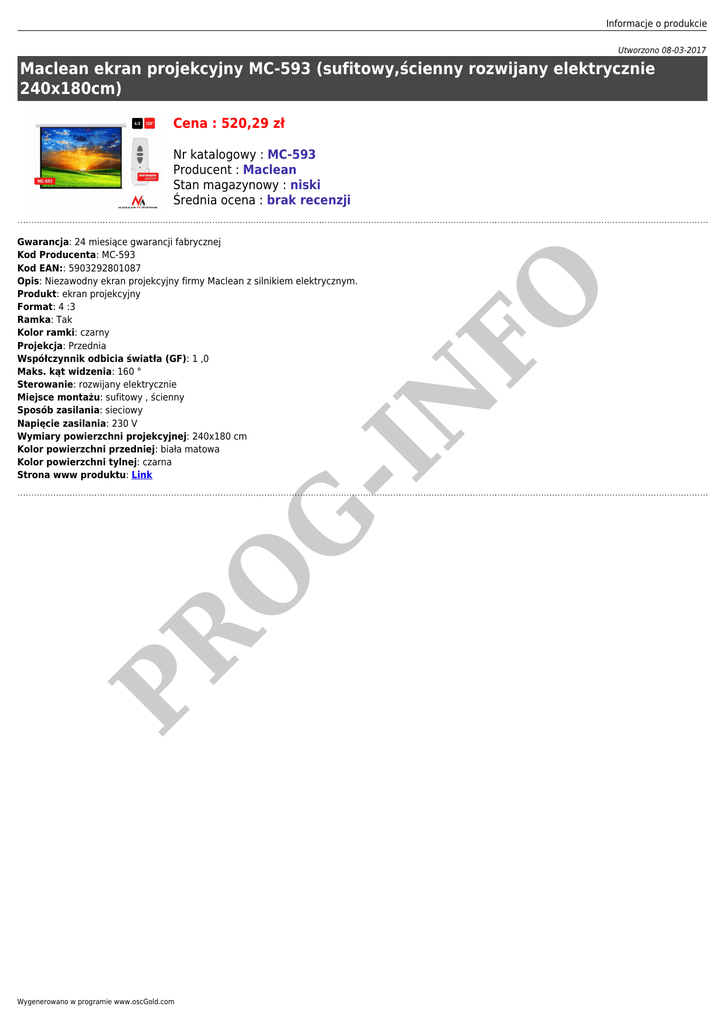 Informacje o produkcie Utworzono 08-03-2017 Maclean ekran projekcyjny MC-593 (sufitowy,ścienny rozwijany elektrycznie 240x180cm) Cena : 520,29 zł PR O G -I N Gwarancja: 24 miesiące gwarancji fabrycznej Kod Producenta: MC-593 Kod EAN:: 5903292801087 Opis: Niezawodny ekran projekcyjny firmy Maclean z silnikiem elektrycznym. Produkt: ekran projekcyjny Format: 4 :3 Ramka: Tak Kolor ramki: czarny Projekcja: Przednia Współczynnik odbicia światła (GF): 1 ,0 Maks. kąt widzenia: 160 ° Sterowanie: rozwijany elektrycznie Miejsce montażu: sufitowy , ścienny Sposób zasilania: sieciowy Napięcie zasilania: 230 V Wymiary powierzchni projekcyjnej: 240x180 cm Kolor powierzchni przedniej: biała matowa Kolor powierzchni tylnej: czarna Strona www produktu: Link FO Nr katalogowy : MC-593 Producent : Maclean Stan magazynowy : niski Średnia ocena : brak recenzji Wygenerowano w programie www.oscGold.com