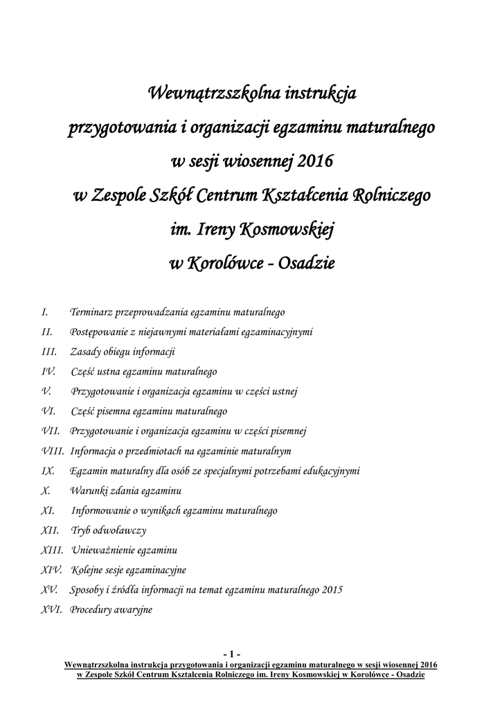 Wewnątrzszkolna instrukcja przygotowania i organizacji egzaminu maturalnego w sesji wiosennej 2016 w Zespole Szkół Centrum Kształcenia Rolniczego im. Ireny Kosmowskiej w Korolówce - Osadzie I. Terminarz przeprowadzania egzaminu maturalnego II. Postępowanie z niejawnymi materiałami egzaminacyjnymi III. Zasady obiegu informacji IV. Część ustna egzaminu maturalnego V. Przygotowanie i organizacja egzaminu w części ustnej VI. Część pisemna egzaminu maturalnego VII. Przygotowanie i organizacja egzaminu w części pisemnej VIII. Informacja o przedmiotach na egzaminie maturalnym IX. Egzamin maturalny dla osób ze specjalnymi potrzebami edukacyjnymi X. Warunki zdania egzaminu XI. Informowanie o wynikach egzaminu maturalnego XII. Tryb odwoławczy XIII. Unieważnienie egzaminu XIV. Kolejne sesje egzaminacyjne XV. Sposoby i źródła informacji na temat egzaminu maturalnego 2015 XVI. Procedury awaryjne -1Wewnątrzszkolna instrukcja przygotowania i organizacji egzaminu maturalnego w sesji wiosennej 2016 w Zespole Szkół Centrum Kształcenia Rolniczego im. Ireny Kosmowskiej w Korolówce - Osadzie I. Terminarz: L. P. 1. 2. 3. 4. 5. 6. 7. 8. 9. 10. 11. 12. 13. 14. Czynność Termin Zapoznanie uczniów i ich rodziców z informacją o egzaminie maturalnym w sesji 2015/2016 oraz komunikatami dyrektora CKE Wychowawcy informują uczniów o procedurach maturalnych na lekcjach wychowawczych Wychowawcy informują rodziców o procedurach maturalnych na zebraniach. Udostępnienie materiałów informacyjnych na temat matury w bibliotece, u dyrektora szkoły, u wychowawców, na szkolnej stronie internetowej, w gablocie na korytarzu w widocznym miejscu. do 30.09.2015 Nauczyciele przedmiotów maturalnych informują o standardach egzaminacyjnych i na bieżąco udzielają wyjaśnień. Składanie przewodniczącemu szkolnego zespołu egzaminacyjnego (dyrektorowi szkoły) wstępnej deklaracji przystąpienia do egzaminu maturalnego Potwierdzenie odbioru deklaracji, sporządzenie kopii i przekazanie ich zdającym – absolwent może deklaracji wstępnej nie składać Składanie dokumentów uprawniających uczniów do dostosowania warunków i form egzaminu maturalnego i przekazanie ich radzie pedagogicznej (dokumentacja może być uzupełniona do 07.02.2016 r) Próbne egzaminy maturalne z przedmiotów obowiązkowych i dodatkowych Zebranie od uczniów i absolwentów ostatecznych deklaracji przystąpienia do egzaminu maturalnego. Potwierdzenie odbioru deklaracji, sporządzenie kopii i przekazanie ich zdającym. Ustalenie sposobów dostosowania warunków i form egzaminu dla uczniów i absolwentów uprawnionych do dostosowań oraz poinformowanie o nich na piśmie Weryfikacja danych o zdających przekazanych do OKE. Zebranie podpisów zdających na potwierdzeniach zgodności zgłoszonych danych wydrukowanych z systemu OBIEG Przyjęcie oświadczeń uczniów i absolwentów o korzystaniu albo niekorzystaniu z przyznanych dostosowań Przesłanie do OKE w formie elektronicznej wykazu uczniów i absolwentów przystępujących do egzaminu maturalnego Odbycie przez PZE (dyrektora szkoły) lub zastępcę PZE szkolenia w zakresie organizacji egzaminu maturalnego w sesji 2015/2016 Osoba odpowiedzialna przewodniczący SZE (dyrektor szkoły) na bieżąco wychowawcy na bieżąco wychowawcy do 30.09.15 oraz w miarę pozyskiwania nowych informacji na bieżąco wychowawcy wicedyrektor szkoły nauczyciele przedmiotów maturalnych do 30.09.2015 przewodniczący SZE (dyrektor szkoły) wicedyrektor szkoły do 30.09.2015 przewodniczący SZE (dyrektor szkoły) zgodnie z terminem do 07.02.2016 przewodniczący SZE (dyrektor szkoły) przewodniczący SZE (dyrektor szkoły) do 10.02.2016 przewodniczący SZE (dyrektor szkoły) do 12.02.2016 przewodniczący SZE (dyrektor szkoły) do 15.02.2016 przewodniczący SZE (dyrektor szkoły) do 15.02.2016 przewodniczący SZE (dyrektor szkoły) marzec – kwiecień 2016r. przewodniczący SZE (dyrektor szkoły) zastępca PZE -2Wewnątrzszkolna instrukcja przygotowania i organizacji egzaminu maturalnego w sesji wiosennej 2016 w Zespole Szkół Centrum Kształcenia Rolniczego im. Ireny Kosmowskiej w Korolówce - Osadzie Powołanie na podstawie pisemnego porozumienia 15. z dyrektorem innej szkoły członków zespołu przedmiotowego spoza szkoły Powołanie zastępcy przewodniczącego szkolnego 16. zespołu egzaminacyjnego Powołanie członków zespołów przedmiotowych 17. do przeprowadzenia części ustnej egzaminu oraz wyznaczenie przewodniczących tych zespołów Ogłoszenie szkolnego harmonogramu części ustnej 18. egzaminu i przesłanie go do OKE Przekazanie uczniom treści komunikatu dyrektora CKE o materiałach i przyborach pomocniczych, z których 19. mogą korzystać zdający w części pisemnej egzaminu z poszczególnych przedmiotów oraz ustaleń o zasadach korzystania z tych pomocy . Powołanie członków zespołów nadzorujących przebieg 20. egzaminu pisemnego i wyznaczenie przewodniczących Przyjęcie od uczniów, którzy uzyskali tytuł laureata lub 21. finalisty olimpiady przedmiotowej, wniosku o wprowadzenie zmian w deklaracji Przekazanie zdającym instrukcji dotyczącej przebiegu egzaminu, przeszkolenie ich z zasad kodowania arkuszy egzaminacyjnych i kart odpowiedzi i konieczności 22. wypełniania odpowiedzi do zadań zamkniętych w części pisemnej z matematyki na poziomie podstawowym i w części pisemnej z języka obcego na obu poziomach Przekazanie zdającym informacji o zasadach postępowania w przypadku niezgłoszenia się 23. na egzamin egzaminów przyczyn losowych lub zdrowotnych Przekazanie zdającym informacji o terminie ogłoszenia 24. wyników egzaminów i odbioru świadectw Zgłoszenie do OKE informacji dotyczących usunięcia 25. zdających uczniów, którzy nie ukończyli szkoły Przeprowadzenie szkolenia zespołów przedmiotowych 26. z zakresu ich obowiązków i wypełniania dokumentacji egzaminacyjnej Przeprowadzenie szkolenia zespołów nadzorujących 27. z zakresu ich 
