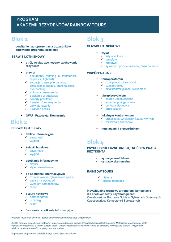 PROGRAM AKADEMII REZYDENTÓW RAINBOW TOURS Blok 1 powitanie i autoprezentacja uczestników omówienie programu szkolenia Blok 3 SERWIS LOTNISKOWY SERWIS LOTNISKOWY strój, wygląd zewnętrzny, zachowanie rezydenta przylot 9 dokumenty (rooming list, transfer list, requests, flight list) 9 sytuacje: zaginięcie bagażu, zniszczenie bagażu, braki na liście, overbooking 9 autokary i oznaczenia 9 powitanie w autokarze 9 koperty powitalne 9 transfer z/bez rezydenta 9 zakwaterowanie 9 utracone posiłki WSPÓŁPRACA Z: OWU i Przeczytaj Koniecznie touroperatorem 9 dział pilotażu i transportu 9 dział produktu 9 dział kontroli jakości i reklamacji ubezpieczycielem 9 zakres ubezpieczenia 9 schemat postępowania 9 centrala alarmowa 9 druki szkody lokalnym kontrahentem 9 organizacja wycieczek fakultatywnych 9 rozliczenia finansowe Blok 2 SERWIS HOTELOWY tablice informacyjne 9 zawartość 9 wygląd książki hotelowe 9 zawartość 9 wygląd spotkanie informacyjne 9 części 9 style prowadzenia po spotkaniu informacyjnym 9 rozwiązywanie zgłaszanych spraw 9 zapisy na wycieczki 9 wynajem samochodów 9 raport dyżury hotelowe 9 harmonogram 9 przebieg 9 raport wylot 9 listy wylotowe 9 transfery 9 odprawa 9 sytuacje: opóźnienia lotów, braki na liście hotelarzami i przewoźnikami Blok 4 PSYCHOSPOŁECZNE UMIEJĘTNOŚCI W PRACY REZYDENTA sytuacje konfliktowe sytuacje ekstremalne RAINBOW TOURS 9 9 historia proces rekrutacji indywidualne rozmowy z trenerem, konsultacje dla chętnych testy psychologiczne: Kwestionariusz Radzenia Sobie w Sytuacjach Stresowych, Kwestionariusz Kompetencji Społecznych ćwiczenie: spotkanie informacyjne Program może ulec zmianie i zostać zmodyfikowany na potrzeby Uczestników. Jest to program autorski, przygotowany przez prowadzącego zajęcia, Pana Radosława Szafranowicza-Małozięcia, psychologa i pilota wycieczek/rezydenta z 9 letnim stażem pracy. Odpowiedzialnego w Rainbow Tours za szkolenia wewnętrzne pilotów i rezydentów, a także za rekrutację osób na powyższe stanowiska. Kopiowanie programu w całości lub jego części jest zabronione.