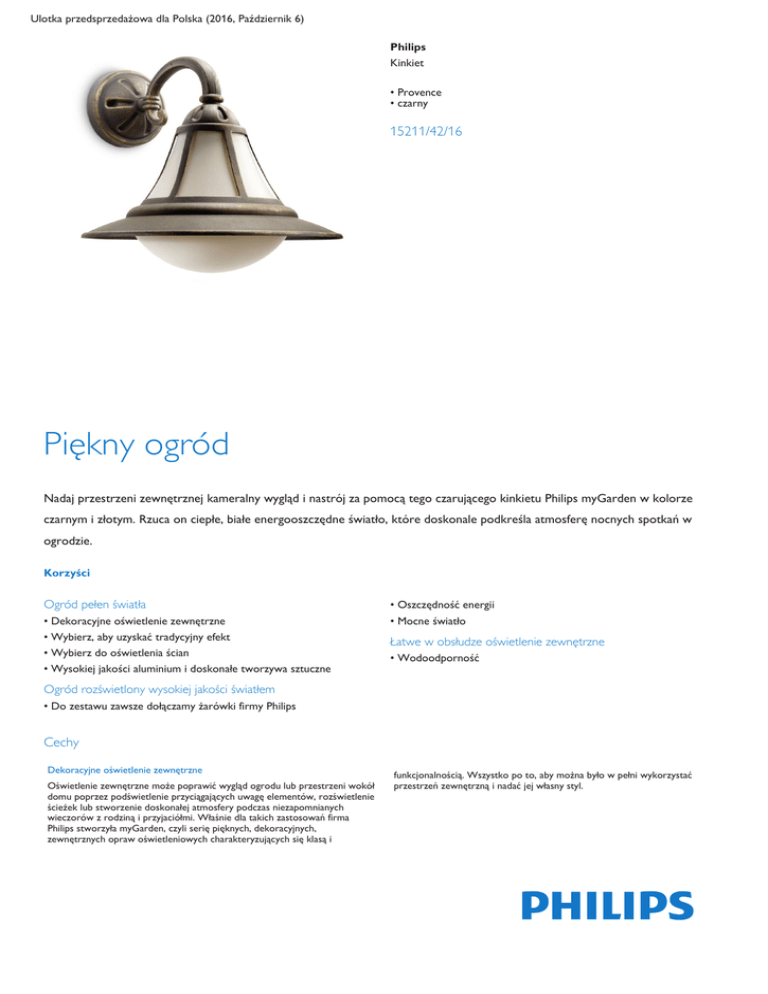 Ulotka przedsprzedażowa dla Polska (2016, Październik 6) Philips Kinkiet • Provence • czarny 15211/42/16 Piękny ogród Nadaj przestrzeni zewnętrznej kameralny wygląd i nastrój za pomocą tego czarującego kinkietu Philips myGarden w kolorze czarnym i złotym. Rzuca on ciepłe, białe energooszczędne światło, które doskonale podkreśla atmosferę nocnych spotkań w ogrodzie. Korzyści Ogród pełen światła • Dekoracyjne oświetlenie zewnętrzne • Wybierz, aby uzyskać tradycyjny efekt • Wybierz do oświetlenia ścian • Wysokiej jakości aluminium i doskonałe tworzywa sztuczne • Oszczędność energii • Mocne światło Łatwe w obsłudze oświetlenie zewnętrzne • Wodoodporność Ogród rozświetlony wysokiej jakości światłem • Do zestawu zawsze dołączamy żarówki firmy Philips Cechy Dekoracyjne oświetlenie zewnętrzne Oświetlenie zewnętrzne może poprawić wygląd ogrodu lub przestrzeni wokół domu poprzez podświetlenie przyciągających uwagę elementów, rozświetlenie ścieżek lub stworzenie doskonałej atmosfery podczas niezapomnianych wieczorów z rodziną i przyjaciółmi. Właśnie dla takich zastosowań firma Philips stworzyła myGarden, czyli serię pięknych, dekoracyjnych, zewnętrznych opraw oświetleniowych charakteryzujących się klasą i funkcjonalnością. Wszystko po to, aby można było w pełni wykorzystać przestrzeń zewnętrzną i nadać jej własny styl. Wybierz, aby uzyskać tradycyjny efekt Mocne światło Ta zaprojektowana w Europie lampa o unikatowym wzorze pozwala osiągnąć tradycyjny efekt na zewnątrz. Ta lampa zewnętrzna daje mocne, ciepłe, białe światło. Jasny strumień światła odpowiednio oświetli Twój ogród lub taras. Wybierz do oświetlenia ścian Wodoodporność Wykorzystaj dostępną przestrzeń. Ten kinkiet jest idealny do zamontowania w pobliżu drzwi wejściowych lub na ścianach tarasu. Najwyższej jakości materiały Ta lampa Philips została zaprojektowana specjalnie do zastosowań zewnętrznych. Jest trwała i będzie oświetlać ogród przez długi czas. Została wykonana z wysokiej jakości odlewanego aluminium i doskonałych tworzyw sztucznych. Do zestawu zawsze dołączamy żarówki firmy Philips Ta lampa Philips została zaprojektowana pod kątem wilgotnych miejsc i przeszła rygorystyczne testy, które potwierdziły jej odporność na wodę. Poziom IP określają dwie liczby: pierwsza to poziom ochrony przeciw kurzowi, a druga przeciw wodzie. Poziom IP44 oznacza, że jest odporna na zachlapania. To czyni z niej idealną lampę do zastosowań zewnętrznych. W zestawie znajdują się wysokiej jakości, energooszczędne żarówki Philips EcoLamp, które pozwalają osiągnąć najlepszy efekt oświetleniowy. Oszczędność energii Ta lampa firmy Philips zużywa mniej energii niż tradycyjne źródła światła, co pozwala zmniejszyć rachunki za prąd i przyczynia się do ochrony środowiska. Specyfikacje Prosimy pamiętać, że jest to ulotka przedsprzedażowa. Treść ulotki jest zgodna z naszą najlepszą wiedzą w momencie publikacji i w odniesieniu do danego kraju (podane powyżej). Treść ulotki może ulec zmianie bez powiadomienia. Firma Philips nie ponosi odpowiedzialności za treść ulotki. Stylistyka i wykończenie Materiał Kolor aluminium syntetyk czarny Dodatkowe funkcje/akcesoria w zestawie Pełna odporność na warunki pogodowe TAK Wymiary i waga produktu Wysokość Długość Szerokość Waga netto 30,6 cm 32 cm 38,2 cm 1,200 kg Oprawa z możliwością przyciemniania LED Wbudowane źródło światła LED Klasa energetyczna dołączonego źródła światła Oprawa jest zgodna ze źródłami światła klasy Maksymalny okres eksploatacji Współczynnik IP Dane techniczne Zasilanie sieciowe Technologia źródła światła Liczba źródeł światła Trzonek Moc źródła światła w zestawie Maksymalna moc wymiennego źródła światła Barwa światła Przedział 220–240 V 50–60 Hz fluorescencyjne 230 V 1 E27 23 W 100 W Klasa ochronności Źródło światła odpowiadające tradycyjnej żarówce o mocy Moc strumienia świetlnego dołączonego źródła światła w lumenach Nie Nie NIE A A+ do E 10 000 godz. IP44 ochrona przed przedmiotami powyżej 1 mm ochrona przed rozchlapaną wodą I — uziemienie 110 W 1570 lm Serwis ciepła biel Gwarancja 2 lata Dane wkrótce ulegną zmianie 2016, Październik 6 Różne Wymiary i waga opakowania Wysokość Długość Szerokość Waga Opracowano z myślą o Styl Typ 26,1 cm 39,5 cm 31,5 cm 1,870 kg Dane wkrótce ulegną zmianie 2016, Październik 6 Version: 2.0.1 EAN: 8718291443704 Ogród i patio Tradycyjny Kinkiet © 2016 Koninklijke Philips Electronics N.V. Wszelkie prawa zastrzeżone Dane mogą ulec zmianie bez uprzedniego powiadomienia. Znak towarowy jest własnością Koninklijke Philips Electronics N.V. lub odpowiednich podmiotów . www.philips.com