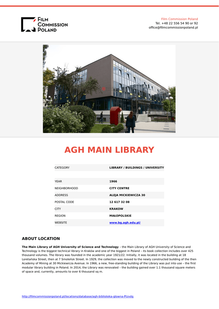 Film Commission Poland Tel. +48 22 556 54 90 or 92 office@filmcommissionpoland.pl AGH MAIN LIBRARY CATEGORY LIBRARY / BUILDINGS / UNIVERSITY YEAR 1966 NEIGHBORHOOD CITY CENTRE ADDRESS ALEJA MICKIEWICZA 30 POSTAL CODE 12 617 32 08 CITY KRAKOW REGION MAŁOPOLSKIE WEBSITE www.bg.agh.edu.pl/ ABOUT LOCATION The Main Library of AGH University of Science and Technology – the Main Library of AGH University of Science and Technology is the biggest technical library in Kraków and one of the biggest in Poland – its book collection includes over 425 thousand volumes. The library was founded in the academic year 1921/22. Initially, it was located in the building at 18 Loretańska Street, then at 7 Smoleńsk Street. In 1929, the collection was moved to the newly constructed building of the then Academy of Mining at 30 Mickiewicza Avenue. In 1966, a new, free-standing building of the Library was put into use – the first modular library building in Poland. In 2014, the Library was renovated – the building gained over 1.1 thousand square meters of space and, currently, amounts to over 6 thousand sq m. http://filmcommissionpoland.pl/locations/database/agh-biblioteka-glowna-Ptzvdg