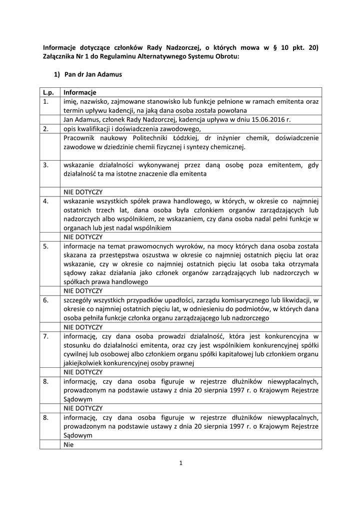 Informacje dotyczące członków Rady Nadzorczej, o których mowa w § 10 pkt. 20) Załącznika Nr 1 do Regulaminu Alternatywnego Systemu Obrotu: 1) Pan dr Jan Adamus L.p. 1. 2. 3. 4. 5. 6. 7. 8. 8. Informacje imię, nazwisko, zajmowane stanowisko lub funkcje pełnione w ramach emitenta oraz termin upływu kadencji, na jaką dana osoba została powołana Jan Adamus, członek Rady Nadzorczej, kadencja upływa w dniu 15.06.2016 r. opis kwalifikacji i doświadczenia zawodowego, Pracownik naukowy Politechniki Łódzkiej, dr inżynier chemik, doświadczenie zawodowe w dziedzinie chemii fizycznej i syntezy chemicznej. wskazanie działalności wykonywanej przez daną osobę poza emitentem, gdy działalność ta ma istotne znaczenie dla emitenta NIE DOTYCZY wskazanie wszystkich spółek prawa handlowego, w których, w okresie co najmniej ostatnich trzech lat, dana osoba była członkiem organów zarządzających lub nadzorczych albo wspólnikiem, ze wskazaniem, czy dana osoba nadal pełni funkcje w organach lub jest nadal wspólnikiem NIE DOTYCZY informacje na temat prawomocnych wyroków, na mocy których dana osoba została skazana za przestępstwa oszustwa w okresie co najmniej ostatnich pięciu lat oraz wskazanie, czy w okresie co najmniej ostatnich pięciu lat osoba taka otrzymała sądowy zakaz działania jako członek organów zarządzających lub nadzorczych w spółkach prawa handlowego NIE DOTYCZY szczegóły wszystkich przypadków upadłości, zarządu komisarycznego lub likwidacji, w okresie co najmniej ostatnich pięciu lat, w odniesieniu do podmiotów, w których dana osoba pełniła funkcje członka organu zarządzającego lub nadzorczego NIE DOTYCZY informację, czy dana osoba prowadzi działalność, która jest konkurencyjna w stosunku do działalności emitenta, oraz czy jest wspólnikiem konkurencyjnej spółki cywilnej lub osobowej albo członkiem organu spółki kapitałowej lub członkiem organu jakiejkolwiek konkurencyjnej osoby prawnej NIE DOTYCZY informację, czy dana osoba figuruje w rejestrze dłużników niewypłacalnych, prowadzonym na podstawie ustawy z dnia 20 sierpnia 1997 r. o Krajowym Rejestrze Sądowym NIE DOTYCZY informację, czy dana osoba figuruje w rejestrze dłużników niewypłacalnych, prowadzonym na podstawie ustawy z dnia 20 sierpnia 1997 r. o Krajowym Rejestrze Sądowym Nie 1 2) Pan Jacek Franasik L.p. 1. 2. 3. 4. 5. 6. 7. Informacje imię, nazwisko, zajmowane stanowisko lub funkcje pełnione w ramach emitenta oraz termin upływu kadencji, na jaką dana osoba została powołana Jacek Franasik, Członek Rady Nadzorczej, kadencja upływa w dniu 15.06.2016 r. opis kwalifikacji i doświadczenia zawodowego, 2002 – MASTER PHARM S.A. 91-203 Łódź ul. Wersalska 8 - Prezes Zarządu 1999 – 2003 AGROPHARM S.A. 95 - 080 Tuszyn ul. Starościańska 33 - Dyrektor handlowy 1989 - 1994 Akademia Medyczna w Łodzi Wydział Stomatologii Studia zakończone uzyskaniem dyplomu lekarza stomatologa. 1985-1986 Akademia Medyczna w Łodzi Wydział Farmaceutyczny Ukończony pierwszy rok studiów wskazanie działalności wykonywanej przez daną osobę poza emitentem, gdy działalność ta ma istotne znaczenie dla emitenta 2002 – MASTER PHARM S.A. 91-203 Łódź ul. Wersalska 8 - Prezes Zarządu wskazanie wszystkich spółek prawa handlowego, w których, w okresie co najmniej ostatnich trzech lat, dana osoba była członkiem organów zarządzających lub nadzorczych albo wspólnikiem, ze wskazaniem, czy dana osoba nadal pełni funkcje w organach lub jest nadal wspólnikiem 2002 – MASTER PHARM S.A. 91-203 Łódź ul. Wersalska 8 - Prezes Zarządu 2011 – BUDOWLANI RUGBY S.A. 91-765 Łódź ul. Górnicza 5 - Przewodniczący Rady Nadzorczej 2012 - Max Welt Holdings Limited (Larnaka, Cypr) – Dyrektor 2015 - 31.03.2016 01CYBERATON S.A. Słomińskiego 15/504, 00-195 WARSZAWA Członek Rady Nadzorczej informacje na temat prawomocnych wyroków, na mocy których dana osoba została skazana za przestępstwa oszustwa w okresie co najmniej ostatnich pięciu lat oraz wskazanie, czy w okresie co najmniej ostatnich pięciu lat osoba taka otrzymała sądowy zakaz działania jako członek organów zarządzających lub nadzorczych w spółkach prawa handlowego Nie dotyczy szczegóły wszystkich przypadków upadłości, zarządu komisarycznego lub likwidacji, w okresie co najmniej ostatnich pięciu lat, w odniesieniu do podmiotów, w których dana osoba pełniła funkcje członka organu zarządzającego lub nadzorczego Nie dotyczy informację, czy dana osoba prowadzi działalność, która jest konkurencyjna w stosunku do działalności emitenta, oraz czy jest wspólnikiem konkurencyjnej spółki cywilnej lub osobowej albo członkiem organu spółki kapitałowej lub członkiem organu jakiejkolwiek konkurencyjnej osoby prawnej 2002 – MASTER PHARM S.A. 91-203 Łódź ul. Wersalska 8 - Prezes Zarządu Firma działa na rynku suplementów diety i zajmuje się ich opracowywaniem i 2 8. produkcja na zlecenie. informację, czy dana osoba figuruje w rejestrze dłużników niewypłacalnych, prowadzonym na podstawie ustawy z dnia 20 sierpnia 1997 r. o Krajowym Rejestrze Sądowym Nie 3) Pan prof. dr hab. Jerzy Gębicki L.p. 1. 2. 3. 4. 5. 6. 7. Informacje imię, nazwisko, zajmowane stanowisko lub funkcje pełnione w ramach emitenta oraz termin upływu kadencji, na jaką dana osoba została powołana Jerzy Gębicki, członek Rady Nadzorczej Pharmena S.A., kadencja upływa w dniu 15.06.2016 r. opis kwalifikacji i doświadczenia zawodowego, prof. dr hab. nauk chemicznych, profesor zwyczajny Politechniki Łódzkiej Zainteresowania naukowe: struktura i reaktywność jonów molekularnych, chemia ksenobiotyków, molekularne mechanizmy działania oraz projektowanie nowych substancji leczniczych Długoterminowe staże naukowe: State University of New York at Stony Brook, University of Utah, University of Texas at Austin, Ohio State University, University of Fribourg (Switzerland). Autor licznych publikacji 