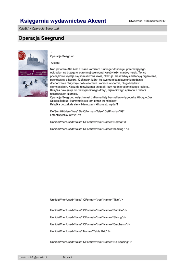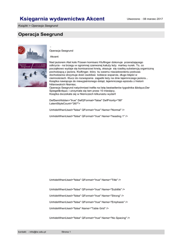Księgarnia wydawnictwa Akcent Utworzono : 08 marzec 2017 Książki > Operacja Seegrund Operacja Seegrund Operacja Seegrund Akcent Nad jeziorem Alat koło Füssen komisarz Kluftinger dokonuje przerażającego odkrycia - na brzegu w ogromnej czerwonej kałuży leży martwy nurek. To, co początkowo wydaje się komisarzowi krwią, okazuje się rzadką substancją organiczną pochodzącą z jeziora. Kluftinger, który ku swemu niezadowoleniu podczas dochodzenia otrzymuje dość osobliwe kobiece wsparcie, długo błądzi w ciemnościach. Klucz do rozwiązania zagadki leży na dnie tajemniczego jeziora... Książka nawiązuje do niewyjaśnionego dotąd, tajemniczego epizodu z historii hitlerowskich Niemiec. Operacja Seegrund natychmiast trafiła na listę bestsellerów tygodnika „Der Spiegel” i utrzymała się tam przez 10 miesięcy. Książka doczekała się w Niemczech kilkunastu wydań! DefSemiHidden="true" DefQFormat="false" DefPriority="99" LatentStyleCount="267"> UnhideWhenUsed="false" QFormat="true" Name="Normal" /> UnhideWhenUsed="false" QFormat="true" Name="heading 1" /> UnhideWhenUsed="false" QFormat="true" Name="Title" /> UnhideWhenUsed="false" QFormat="true" Name="Subtitle" /> UnhideWhenUsed="false" QFormat="true" Name="Strong" /> UnhideWhenUsed="false" QFormat="true" Name="Emphasis" /> UnhideWhenUsed="false" Name="Table Grid" /> UnhideWhenUsed="false" QFormat="true" Name="No Spacing" /> kontakt: - [email protected] Strona 1 Księgarnia wydawnictwa Akcent Utworzono : 08 marzec 2017 Książki > Operacja Seegrund Operacja Seegrund UnhideWhenUsed="false" Name="Light Shading" /> UnhideWhenUsed="false" Name="Light List" /> UnhideWhenUsed="false" Name="Light Grid" /> UnhideWhenUsed="false" Name="Medium Shading 1" /> UnhideWhenUsed="false" Name="Medium Shading 2" /> UnhideWhenUsed="false" Name="Medium List 1" /> UnhideWhenUsed="false" Name="Medium List 2" /> UnhideWhenUsed="false" Name="Medium Grid 1" /> UnhideWhenUsed="false" Name="Medium Grid 2" /> UnhideWhenUsed="false" Name="Medium Grid 3" /> UnhideWhenUsed="false" Name="Dark List" /> UnhideWhenUsed="false" Name="Colorful Shading" /> UnhideWhenUsed="false" Name="Colorful List" /> UnhideWhenUsed="false" Name="Colorful Grid" /> UnhideWhenUsed="false" Name="Light Shading Accent 1" /> UnhideWhenUsed="false" Name="Light List Accent 1" /> UnhideWhenUsed="false" Name="Light Grid Accent 1" /> UnhideWhenUsed="false" Name="Medium Shading 1 Accent 1" /> UnhideWhenUsed="false" Name="Medium Shading 2 Accent 1" /> UnhideWhenUsed="false" Name="Medium List 1 Accent 1" /> UnhideWhenUsed="false" QFormat="true" Name="List Paragraph" /> UnhideWhenUsed="false" QFormat="true" Name="Quote" /> UnhideWhenUsed="false" QFormat="true" Name="Intense Quote" /> UnhideWhenUsed="false" Name="Medium List 2 Accent 1" /> UnhideWhenUsed="false" Name="Medium Grid 1 Accent 1" /> UnhideWhenUsed="false" Name="Medium Grid 2 Accent 1" /> UnhideWhenUsed="false" Name="Medium Grid 3 Accent 1" /> kontakt: - [email protected] Strona 2 Księgarnia wydawnictwa Akcent Utworzono : 08 marzec 2017 Książki > Operacja Seegrund Operacja Seegrund UnhideWhenUsed="false" Name="Dark List Accent 1" /> UnhideWhenUsed="false" Name="Colorful Shading Accent 1" /> UnhideWhenUsed="false" Name="Colorful List Accent 1" /> UnhideWhenUsed="false" Name="Colorful Grid Accent 1" /> UnhideWhenUsed="false" Name="Light Shading Accent 2" /> UnhideWhenUsed="false" Name="Light List Accent 2" /> UnhideWhenUsed="false" Name="Light Grid Accent 2" /> UnhideWhenUsed="false" Name="Medium Shading 1 Accent 2" /> UnhideWhenUsed="false" Name="Medium Shading 2 Accent 2" /> UnhideWhenUsed="false" Name="Medium List 1 Accent 2" /> UnhideWhenUsed="false" Name="Medium List 2 Accent 2" /> UnhideWhenUsed="false" Name="Medium Grid 1 Accent 2" /> UnhideWhenUsed="false" Name="Medium Grid 2 Accent 2" /> UnhideWhenUsed="false" Name="Medium Grid 3 Accent 2" /> UnhideWhenUsed="false" Name="Dark List Accent 2" /> UnhideWhenUsed="false" Name="Colorful Shading Accent 2" /> UnhideWhenUsed="false" Name="Colorful List Accent 2" /> UnhideWhenUsed="false" Name="Colorful Grid Accent 2" /> UnhideWhenUsed="false" Name="Light Shading Accent 3" /> UnhideWhenUsed="false" Name="Light List Accent 3" /> UnhideWhenUsed="false" Name="Light Grid Accent 3" /> UnhideWhenUsed="false" Name="Medium Shading 1 Accent 3" /> UnhideWhenUsed="false" Name="Medium Shading 2 Accent 3" /> UnhideWhenUsed="false" Name="Medium List 1 Accent 3" /> UnhideWhenUsed="false" Name="Medium List 2 Accent 3" /> UnhideWhenUsed="false" Name="Medium Grid 1 Accent 3" /> UnhideWhenUsed="false" Name="Medium Grid 2 Accent 3" /> kontakt: - [email protected] Strona 3 Księgarnia wydawnictwa Akcent Utworzono : 08 marzec 2017 Książki > Operacja Seegrund Operacja Seegrund UnhideWhenUsed="false" Name="Medium Grid 3 Accent 3" /> UnhideWhenUsed="false" Name="Dark List Accent 3" /> UnhideWhenUsed="false" Name="Colorful Shading Accent 3" /> UnhideWhenUsed="false" Name="Colorful List Accent 3" /> UnhideWhenUsed="false" Name="Colorful Grid Accent 3" /> UnhideWhenUsed="false" Name="Light Shading Accent 4" /> UnhideWhenUsed="false" Name="Light List Accent 4" /> UnhideWhenUsed="false" Name="Light Grid Accent 4" /> UnhideWhenUsed="false" Name="Medium Shading 1 Accent 4" /> UnhideWhenUsed="false" Name="Medium Shading 2 Accent 4" /> UnhideWhenUsed="false" Name="Medium List 1 Accent 4" /> UnhideWhenUsed="false" Name="Medium List 2 Accent 4" /> UnhideWhenUsed="false" Name="Medium Grid 1 Accent 4" /> UnhideWhenUsed="false" Name="Medium Grid 2 Accent 4" /> UnhideWhenUsed="false" Name="Medium Grid 3 Accent 4" /> UnhideWhenUsed="false" Name="Dark List Accent 4" /> UnhideWhenUsed="false" Name="Colorful Shading Accent 4" /> UnhideWhenUsed="false" Name="Colorful List Accent 4" /> UnhideWhenUsed="false" Name="Colorful Grid Accent 4" /> UnhideWhenUsed="false" Name="Light Shading Accent 5" /> UnhideWhenUsed="false" Name="Light List Accent 5" /> UnhideWhenUsed="false" Name="Light Grid Accent 5" /> UnhideWhenUsed="
