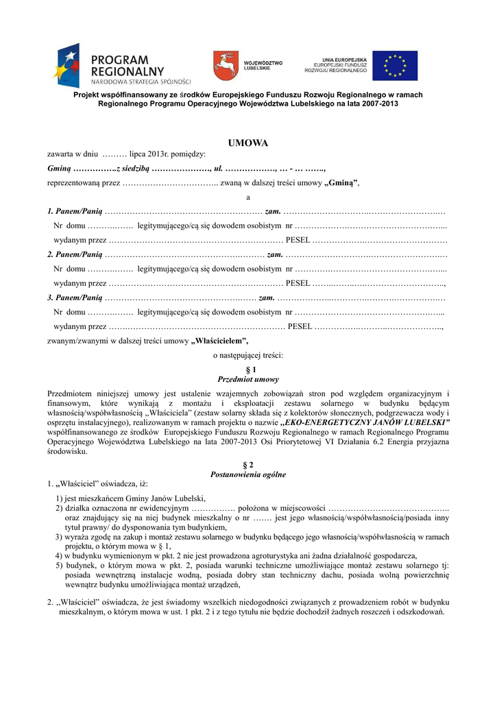 Projekt współfinansowany ze środków Europejskiego Funduszu Rozwoju Regionalnego w ramach Regionalnego Programu Operacyjnego Województwa Lubelskiego na lata 2007-2013 UMOWA zawarta w dniu ……… lipca 2013r. pomiędzy: Gminą …………….z siedzibą …………………, ul. ………………, … - … ……., reprezentowaną przez …………………………….. zwaną w dalszej treści umowy „Gminą”, a 1. Panem/Panią ………………………………………………… zam. ………………………….…………………….… Nr domu ……….……. legitymującego/cą się dowodem osobistym nr ……………….………………………….…... wydanym przez ……………………………………………………… PESEL ……………….………………………… 2. Panem/Panią ………………………………………….……… zam. ………………………….…………………….… Nr domu ……….……. legitymującego/cą się dowodem osobistym nr ………….……………………………….…... wydanym przez ……………………………………………………… PESEL ……..……..….……………………….., 3. Panem/Panią ………………………………………….…… zam. ………………..………….……….…………….… Nr domu ……….……. legitymującego/cą się dowodem osobistym nr ………………………………………….…... wydanym przez …….………………………………………………… PESEL …………….………..……………….., zwanym/zwanymi w dalszej treści umowy „Właścicielem”, o następującej treści: §1 Przedmiot umowy Przedmiotem niniejszej umowy jest ustalenie wzajemnych zobowiązań stron pod względem organizacyjnym i finansowym, które wynikają z montażu i eksploatacji zestawu solarnego w budynku będącym własnością/współwłasnością ,,Właściciela” (zestaw solarny składa się z kolektorów słonecznych, podgrzewacza wody i osprzętu instalacyjnego), realizowanym w ramach projektu o nazwie ,,EKO-ENERGETYCZNY JANÓW LUBELSKI” współfinansowanego ze środków Europejskiego Funduszu Rozwoju Regionalnego w ramach Regionalnego Programu Operacyjnego Województwa Lubelskiego na lata 2007-2013 Osi Priorytetowej VI Działania 6.2 Energia przyjazna środowisku. §2 Postanowienia ogólne 1. ,,Właściciel” oświadcza, iż: 1) jest mieszkańcem Gminy Janów Lubelski, 2) działka oznaczona nr ewidencyjnym ……………. położona w miejscowości …………………………………….. oraz znajdujący się na niej budynek mieszkalny o nr ……. jest jego własnością/współwłasnością/posiada inny tytuł prawny/ do dysponowania tym budynkiem, 3) wyraża zgodę na zakup i montaż zestawu solarnego w budynku będącego jego własnością/współwłasnością w ramach projektu, o którym mowa w § 1, 4) w budynku wymienionym w pkt. 2 nie jest prowadzona agroturystyka ani żadna działalność gospodarcza, 5) budynek, o którym mowa w pkt. 2, posiada warunki techniczne umożliwiające montaż zestawu solarnego tj: posiada wewnętrzną instalacje wodną, posiada dobry stan techniczny dachu, posiada wolną powierzchnię wewnątrz budynku umożliwiająca montaż urządzeń, 2. ,,Właściciel” oświadcza, że jest świadomy wszelkich niedogodności związanych z prowadzeniem robót w budynku mieszkalnym, o którym mowa w ust. 1 pkt. 2 i z tego tytułu nie będzie dochodził żadnych roszczeń i odszkodowań. Projekt współfinansowany ze środków Europejskiego Funduszu Rozwoju Regionalnego w ramach Regionalnego Programu Operacyjnego Województwa Lubelskiego na lata 2007-2013 3. ,,Właściciel” oświadcza, że w ankiecie uczestnictwa w projekcie instalacji kolektorów słonecznych złożonej w 2012r. podał prawdziwą ilość zamieszkujących w budynku mieszkańców i taka liczba osób zostanie uwzględniona przy doborze parametrów instalacji solarnej dla budynku będącego własnością/współwłasnością ,,Właściciela”. 4. ,,Właściciel” upoważnia ,,Gminę”, do występowania w jego imieniu przed właściwymi organami administracyjnymi, przy ubieganiu się o uzyskanie przewidzianych przepisami prawa niezbędnych opinii, decyzji, zezwoleń i innych dokumentów niezbędnych dla prawidłowej realizacji projektu, o którym mowa w § 1, dotyczących nieruchomości Właściciela określonej w ust. 1 pkt. 2. 5. ,,Gmina” zobowiązuje się do prowadzenia wszelkich spraw związanych z rzeczową realizacją projektu, o którym mowa w § 1, w tym jego rozliczenie i promocja. §3 Określenie warunków organizacyjnych 1. ,,Gmina” zobowiązuje się do zabezpieczenia rzeczowej realizacji projektu na którą się składa: wyłonienie wykonawcy zestawów solarnych oraz nadzoru inwestorskiego zgodnie z przepisami ustawy Prawo zamówień publicznych, ustalenie dla niego harmonogramu realizacji dokumentacji technicznej i rzeczowej zestawów solarnych, sprawowanie bieżącego nadzoru nad przebiegiem prac, przeprowadzenie odbiorów końcowych oraz rozliczenie finansowe przedmiotowego projektu. 2. ,,Właściciel” wyraża zgodę, aby wykonawca instalacji solarnej wyłoniony przez ,,Gminę” zamontował zestaw solarny i przeprowadził wszelkie niezbędne do jego funkcjonowania roboty w budynku będącego jego własnością. 3. Wykonawca zestawu solarnego dokona montażu i uruchomienia zestawu solarnego w budynku ,,Właściciela” na co składa się montaż urządzeń i włączenie ich do wodnej instalacji wewnętrznej. 4. ,,Właściciel” zobowiązuje się do wykonania na własny koszt prac remontowych będących wynikiem prac montażowych zestawu solarnego typu: uzupełnienie okładzin podłóg, uzupełnienia tynku, malowanie, naprawa elewacji i innych prac przywracających poprzedni wygląd i estetykę budynku. §4 Określenie warunków własnościowych i eksploatacyjnych