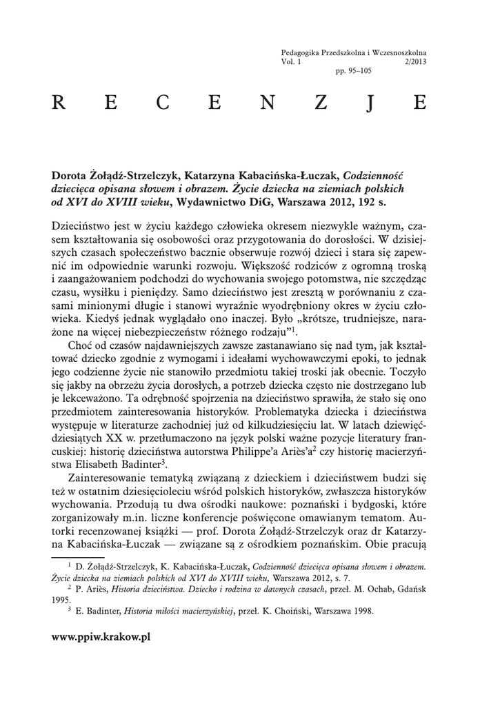 Pedagogika Przedszkolna i Wczesnoszkolna Vol. 1 2/2013 pp. 95–105 R E C E N Z J E Dorota Żołądź-Strzelczyk, Katarzyna Kabacińska-Łuczak, Codzienność dziecięca opisana słowem i obrazem. Życie dziecka na ziemiach polskich od XVI do XVIII wieku, Wydawnictwo DiG, Warszawa 2012, 192 s. Dzieciństwo jest w życiu każdego człowieka okresem niezwykle ważnym, cza sem kształtowania się osobowości oraz przygotowania do dorosłości. W dzisiej szych czasach społeczeństwo bacznie obserwuje rozwój dzieci i stara się zapew nić im odpowiednie warunki rozwoju. Większość rodziców z ogromną troską i zaangażowaniem podchodzi do wychowania swojego potomstwa, nie szczędząc czasu, wysiłku i pieniędzy. Samo dzieciństwo jest zresztą w porównaniu z cza sami minionymi długie i stanowi wyraźnie wyodrębniony okres w życiu czło wieka. Kiedyś jednak wyglądało ono inaczej. Było „krótsze, trudniejsze, nara żone na więcej niebezpieczeństw różnego rodzaju”1. Choć od czasów najdawniejszych zawsze zastanawiano się nad tym, jak kształ tować dziecko zgodnie z wymogami i ideałami wychowawczymi epoki, to jednak jego codzienne życie nie stanowiło przedmiotu takiej troski jak obecnie. Toczyło się jakby na obrzeżu życia dorosłych, a potrzeb dziecka często nie dostrzegano lub je lekceważono. Ta odrębność spojrzenia na dzieciństwo sprawiła, że stało się ono przedmiotem zainteresowania historyków. Problematyka dziecka i dzieciństwa występuje w literaturze zachodniej już od kilkudziesięciu lat. W latach dziewięć dziesiątych XX w. przetłumaczono na język polski ważne pozycje literatury fran cuskiej: historię dzieciństwa autorstwa Philippe’a Ariès’a2 czy historię macierzyń stwa Elisabeth Badinter3. Zainteresowanie tematyką związaną z dzieckiem i dzieciństwem budzi się też w ostatnim dziesięcioleciu wśród polskich historyków, zwłaszcza historyków wychowania. Przodują tu dwa ośrodki naukowe: poznański i bydgoski, które zorganizowały m.in. liczne konferencje poświęcone omawianym tematom. Au torki recenzowanej książki — prof. Dorota Żołądź-Strzelczyk oraz dr Katarzy na Kabacińska-Łuczak — związane są z ośrodkiem poznańskim. Obie pracują 1 D. Żołądź-Strzelczyk, K. Kabacińska-Łuczak, Codzienność dziecięca opisana słowem i obrazem. Życie dziecka na ziemiach polskich od XVI do XVIII wieku, Warszawa 2012, s. 7. 2 P. Ariès, Historia dzieciństwa. Dziecko i rodzina w dawnych czasach, przeł. M. Ochab, Gdańsk 1995. 3 E. Badinter, Historia miłości macierzyńskiej, przeł. K. Choiński, Warszawa 1998. www.ppiw.krakow.pl 96 Recenzje w Zakładzie Historii Wychowania Uniwersytetu Adama Mickiewicza. W kręgu ich zainteresowań naukowych znalazły się: dzieje dziecka i dzieciństwa, zaba wy i zabawki dziecięce, literatura dziecięca, wreszcie — przedstawienia dziecka w sztuce staropolskiej. Zainteresowania te widoczne były już we wcześniejszych publikacjach obu Autorek, zarówno samodzielnych4, jak i wydanych wspólnie5, recenzowana praca jest bowiem już ich trzecią wspólną książką. W odróżnieniu od poprzednich nie jest pracą zbiorową, ale monografią współautorską. Mieści się w nurcie ich dotychczasowych zainteresowań, będąc równocześnie rezulta tem badań prowadzonych w ramach projektu „Dziecko w ikonografii staropol skiej”, dofinansowanego przez Ministerstwo Nauki i Szkolnictwa Wyższego. Praca, jak stwierdzają Autorki, jest próbą rekonstrukcji wybranych sfer ży cia dziecka na ziemiach polskich do końca Pierwszej Rzeczypospolitej. Najwię cej informacji, zgodnie zresztą z podtytułem, dotyczy XVI, XVII i XVIII stu lecia, ale sporo też znajdziemy odniesień zarówno do czasów wcześniejszych, jak i późniejszych, porozbiorowych. Pod względem geograficznym badaniami objęte zostały głównie tereny Korony, a więc obszar Małopolski, Wielkopolski i Mazowsza. Książka składa się z sześciu rozdziałów, ukazujących różne aspekty życia dziecka w epoce staropolskiej. Rozdział pierwszy dotyczy narodzin i okresu nie mowlęctwa. Uwzględniono w nim kwestię samego porodu, a następnie czynno ści pielęgnacyjnych: kąpieli, powijaków, miejsca do spania, karmienia. Rozdział kończy się opisem obyczajów związanych z chrztem, stanowiącym akt wprowa dzenia dziecka do wspólnoty kościelnej. Rozdział drugi porusza zagadnienia życia rodzinnego. Autorki skupiają się w nim na analizie dwóch istotnych problemów: dzietności rodziny staropolskiej oraz relacji w niej panujących. Najobszerniejszy jest rozdział trzeci, omawiający stroje dziecięce. Rozpoczy na się on od przytoczenia poglądów pisarzy staropolskich na kwestię ubioru dzieci. W kolejnych podrozdziałach opisane zostały stroje małych dzieci. Au torki starały się także odtworzyć wygląd „specjalnych urządzeń”, mających za pewnić bezpieczeństwo dzieciom uczącym się chodzić, rozmaite szelki czy cza peczki chroniące głowy przed skutkami upadku. W rozdziale tym znajdujemy również opisy ubiorów dzieci starszych — odmiennych już dla dziewczynek i chłopców, a na końcu — strojów dzieci królewskich. Czwarty rozdział przynosi opis wydzielonych w przestrzeni domowej miejsc dla dzieci oraz zapełniających je sprzętów (łóżeczek, krzesełek, chodzików, urzą dzeń higienicznych i naczyń). 4 D. Żołądź-Strzelczyk, Dziecko w dawnej Polsce, Poznań 2002, 2006; K. Kabacińska, Zabawy i zabawki dziecięce w osiemnastowiecznej Polsce, Poznań 2007. 5 Dawne zabawy dziecięce, red. D. Żołądź-Strzelczyk, K. Kabacińska, Warszawa–Kielce 2008; Dawne i współczesne zabawki dziecięce, red. D. Żołądź-Strzelczyk, K. Kabacińska, Poznań 2010. Recenzje 97 Piąty rozdział został poświęcony zabawie i edukacji, czynnościom wypełnia jącym znaczną część życia dziecka i często, zwłaszcza w odniesieniu do dzieci najmłodszych, wzajemnie się przenikającym. W ep