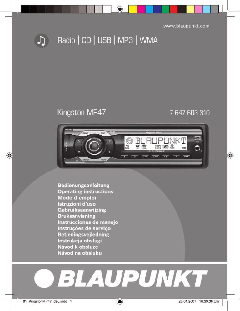 www.blaupunkt.com Radio CD USB MP3 WMA Kingston MP47 7 647 603 310 Bedienungsanleitung Operating instructions Mode d’emploi Istruzioni d’uso Gebruiksaanwijzing Bruksanvisning Instrucciones de manejo Instruções de serviço Betjeningsvejledning Instrukcja obsługi Návod k obsluze Návod na obsluhu 01_KingstonMP47_deu.indd 1 23.01.2007 16:39:36 Uhr 1 13 3 2 12 11 4 10 5 9 8 7 6 14 2 01_KingstonMP47_deu.indd 2 23.01.2007 16:39:36 Uhr 1 -Taste zum Aufklappen des abnehmbaren Bedienteils (Flip-Release-Panel). 2 BAND-Taste Kurzdruck: Wahl der FM-Speicherebenen und der Wellenbereiche MW und LW. Langdruck: Start der Travelstore-Funktion. 3 Ein-/Aus-Taste Kurzdruck: Einschalten des Gerätes. Im Betrieb: Stummschaltung (Mute) des Gerätes. Langdruck: Ausschalten des Gerätes. ; MENU/OK-Taste Kurzdruck: Aufrufen des Menüs für die Grundeinstellungen und Bestätigung von Einstellungen. Beenden der Scan-Funktion. Langdruck: Starten der Scan-Funktion. < Pfeiltasten DEUTSCH Bedienelemente und = SOURCE-Taste Quellenwahl zwischen Radio und CD und (wenn angeschlossen bzw. eingeschaltet) CD-Wechsler, USBDatenträger, AUX und FRONT AUX. > -Taste (Eject) zum Entfernen der CD aus dem Gerät. 4 Lautstärkeregler 5 ESC/DIS-Taste Verlassen des Menüs (auch des AudioMenüs). Display-Inhalte wechseln. 6 FRONT AUX-Eingang 7 AUDIO-Taste, Aufrufen des AudioMenüs: Einstellen von Bässen, Höhen, Mitten, Subout, Balance und Fader. X-BASS ein-/ausschalten und einstellen. Auswahl einer Equalizer-Voreinstellung. 8 Tastenblock 1 - 6 9 Pfeiltasten und : TRAF-Taste Kurzdruck: Ein-/Ausschalten der Verkehrsfunkbereitschaft Langdruck: RDS-Komfortfunktion ein-/ ausschalten. 3 01_KingstonMP47_deu.indd 3 23.01.2007 16:39:38 Uhr Inhalt Zu dieser Anleitung ............................ 6 Verwendete Symbole ....................... 6 Bestimmungsgemäßer Gebrauch ....... 6 Konformitätserklärung ...................... 6 Zu Ihrer Sicherheit ............................. 7 Wenn Sie das Gerät selbst einbauen ... 7 Reinigungshinweis ........................... 8 Altgerät-Entsorgung (nur EU-Länder) .. 8 Lieferumfang..................................... 8 Sonderzubehör (nicht im Lieferumfang) .................... 8 Gewährleistung ................................. 9 Service .......................................... 9 Abnehmbares Bedienteil .................... 9 Diebstahlschutz............................... 9 Abnehmen des Bedienteils ................ 9 Bedienteil anbringen ...................... 10 Ausschaltzeit (OFF TIMER) .............. 10 Time-out-Funktion ......................... 10 Ein-/Ausschalten ............................. 11 Lautstärke einstellen ....................... 11 Einschaltlautstärke einstellen .......... 11 Lautstärke schnell absenken (MUTE) ........................................ 12 Telefon-Audio/Navigation-Audio ....... 12 Bestätigungston ein-/ausschalten..... 13 Automatic Sound ........................... 13 Radiobetrieb ................................... 14 Tuner einstellen ............................. 14 Radiobetrieb einschalten ................ 14 RDS-Komfortfunktion (AF, REG) ....... 14 Wellenbereich/Speicherebene wählen ......................................... 15 Sender einstellen ........................... 15 Empfindlichkeit des Sendersuchlaufs einstellen...................................... 16 Sender speichern .......................... 16 Sender automatisch speichern (Travelstore) ................................. 16 Gespeicherte Sender abrufen .......... 17 Empfangbare Sender anspielen (SCAN) ........................................ 17 Anspielzeit einstellen...................... 17 Programm-Typ (PTY) ..................... 17 Anzeige einstellen .......................... 18 Verkehrsfunk .................................. 19 Vorrang für Verkehrsfunk ein-/ausschalten ............................ 19 Lautstärke für Verkehrsdurchsagen einstellen...................................... 19 CD-Betrieb ...................................... 20 CD-Betrieb starten ......................... 20 Titel wählen .................................. 20 Schneller Suchlauf (hörbar) ............ 20 Zufallswiedergabe der Titel (MIX) ..... 21 Titel anspielen (SCAN).................... 21 Titel wiederholen (REPEAT) ............. 21 Wiedergabe unterbrechen (PAUSE) .. 21 Anzeige einstellen .......................... 21 CD-Text anzeigen lassen.................. 22 Verkehrsdurchsage im CD-Betrieb .... 22 CD entnehmen .............................. 22 MP3-/WMA-Betrieb ......................... 23 Vorbereitung eines MP3-Datenträgers ......................... 23 MP3-Betrieb starten....................... 24 Anzeige einstellen .......................... 25 Verzeichnis wählen ........................ 25 Titel/Dateien wählen ...................... 25 Schneller Suchlauf ......................... 26 Titel in zufälliger Reihenfolge abspielen (MIX) ............................. 26 Titel anspielen (SCAN).................... 26 Einzelne Titel oder ganze Verzeichnisse wiederholt abspielen (REPEAT)........ 26 Wiedergabe unterbrechen (PAUSE) .. 27 4 01_KingstonMP47_deu.indd 4 23.01.2007 16:39:38 Uhr CD-Wechsler-Betrieb ....................... 27 CD-Wechsler-Betrieb starten ........... 27 CD wählen .................................... 27 Titel wählen .................................. 27 Schneller Suchlauf (hörbar) ............ 27 Einzelne Titel oder ganze CDs wiederholt abspielen (REPEAT)........ 28 Titel in zufälliger Reihenfolge abspielen (MIX) ............................. 28 Alle Titel aller CDs anspielen (SCAN) ........................................ 28 Wiedergabe unterbrechen (PAUSE) ....................................... 28 Anzeige einstellen .......................... 29 Clock – Uhrzeit ................................ 29 Uhrzeit einstellen ........................... 29 Uhrmodus 12/24 Std. wählen ......... 29 Uhrzeit bei ausgeschaltetem Gerät und eingeschalteter Zündung dauerhaft anzeigen lassen ......
