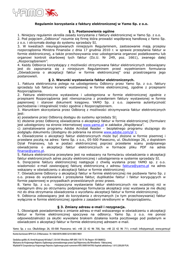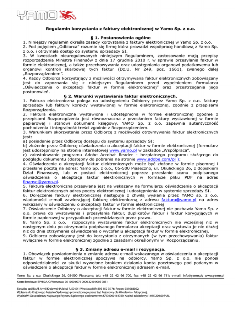 Regulamin korzystania z faktury elektronicznej w Yamo Sp. z oo § 1