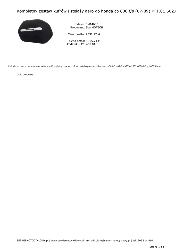Kompletny zestaw kufrów i stelaźy aero do honda cb 600 f/s (07-09) KFT.01.602.6 Indeks: SM14685 Producent: SW-MOTECH Cena brutto: 2331.72 zł Cena netto: 1895.71 zł Podatek VAT: 436.01 zł Link do produktu: serwismotocyklowy.pl/Kompletny-zestaw-kufrow-i-stelazy-aero-do-honda-cb-600-f-s-07-09-KFT.01.602.60000-B,p,14685.html Opis produktu: SERWISMOTOCYKLOWY.pl | www.serwismotocyklowy.pl | e-mail: [email protected] | tel. 606 814 814 Strona 1 z 1