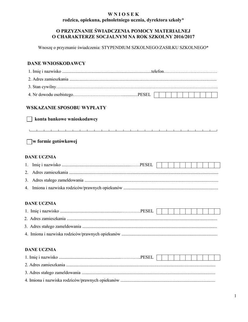 WNIOSEK rodzica, opiekuna, pełnoletniego ucznia, dyrektora szkoły* O PRZYZNANIE ŚWIADCZENIA POMOCY MATERIALNEJ O CHARAKTERZE SOCJALNYM NA ROK SZKOLNY 2016/2017 Wnoszę o przyznanie świadczenia: STYPENDIUM SZKOLNEGO/ZASIŁKU SZKOLNEGO* DANE WNIOSKODAWCY 1. Imię i nazwisko ................................................................................telefon……………………………… 2. Adres zamieszkania .................................................................................................................................... 3. Stan cywilny………………………………………………………………………………………………. 4. Nr dowodu osobistego……………………………..............PESEL WSKAZANIE SPOSOBU WYPŁATY konta bankowe wnioskodawcy w formie gotówkowej DANE UCZNIA 1. Imię i nazwisko ..............................................................……PESEL 2. Adres zamieszkania ...................................................................................................................................... 3. Adres stałego zameldowania ........................................................................................................................ 4. Imiona i nazwiska rodziców/prawnych opiekunów ..................................................................................... DANE UCZNIA 1. Imię i nazwisko .......................................................………….PESEL 2. Adres zamieszkania ....................................................................................................................................... 3. Adres stałego zameldowania ......................................................................................................................... 4. Imiona i nazwiska rodziców/prawnych opiekunów ...................................................................................... DANE UCZNIA 1. Imię i nazwisko .......................................................…………..PESEL 2. Adres zamieszkania ...................................................................................................................................... 3. Adres stałego zameldowania ........................................................................................................................ 4. Imiona i nazwiska rodziców/prawnych opiekunów ..................................................................................... 1 DANE UCZNIA 1. Imię i nazwisko ..............................................................……PESEL 2. Adres zamieszkania ...................................................................................................................................... 3. Adres stałego zameldowania ........................................................................................................................ 4. Imiona i nazwiska rodziców/prawnych opiekunów ..................................................................................... DANE UZASADNIAJĄCE PRZYZNANIE ŚWIADCZENIA POMOCY MATERIALNEJ (wypełnia wnioskodawca) I. Trudna sytuacja materialna rodziny związana jest z niskim dochodem na osobę w rodzinie, gdyż występuje*: 1. bezrobocie (kto, od kiedy nie pracuje) ........................................................................................................... 2. niepełnosprawność (oryginał orzeczenia do wglądu) ..................................................................................... 3. ciężka lub długotrwała choroba (kto, rodzaj schorzenia) ............................................................................... 4. wielodzietność (liczba dzieci) ........................................................................................................................ 5. brak umiejętności wypełniania funkcji opiekuńczo-wychowawczych, 6. alkoholizm lub narkomania (kogo dotyczy) .................................................................................................... 7. rodzina jest niepełna (od kiedy, z jakiego powodu) ........................................................................................ 8. wystąpiło zdarzenie losowe (właściwe podkreślić): a) pożar b) kradzież c) wypadek d) nagła lub przewlekła choroba wrodzona e) śmierć członka rodziny f) inne okoliczności utrudniające prawidłowe funkcjonowanie rodziny i naukę ucznia (jakie-opisać): .............................................................................................................................................................................. II. Pożądana forma świadczenia pomocy materialnej inna niż pieniężna*: pomoc rzeczowa o charakterze edukacyjnym, w tym w szczególności na zakup podręczników, całkowite lub częściowe pokrycie kosztów udziału w zajęciach edukacyjnych, w tym wyrównawczych, wykraczających poza zajęcia realizowane w szkole w ramach planu nauczania, a także udziału w zajęciach edukacyjnych realizowanych poza szkołą, całkowite lub częściowe pokrycie kosztów związanych z pobieraniem nauki poza miejscem zamieszkania (dotyczy uczniów szkół ponadgimnazjalnych). 2 SYTUACJA RODZINNA I MATERIALNA Oświadczam, że niżej wymienione osoby prowadzą wspólne gospodarstwo domowe i w miesiącu poprzedzającym złożenie wniosku dochody wynosiły : Lp. Nazwisko i imię Data urodzenia Pokrewieństwo Miejsce zatrudnienia/nauki 1. 2. 3. 4. 5. 6. 7. 8. 9. 10. 11. Źródła miesięcznego dochodu netto w rodzinie, w miesiącu poprzedzającym złożenie wniosku (udokumentowane odpowiednimi zaświadczeniami), stanowiły: 1) wynagrodzenie za pracę (netto) ……………………………………………………..…………………………....zł 2) dochody z prowadzenia działalności gospodarczej …………...……………………………………………….…zł 3) dochody z gospodarstwa rolnego (liczba ha przeliczeniowych x 288