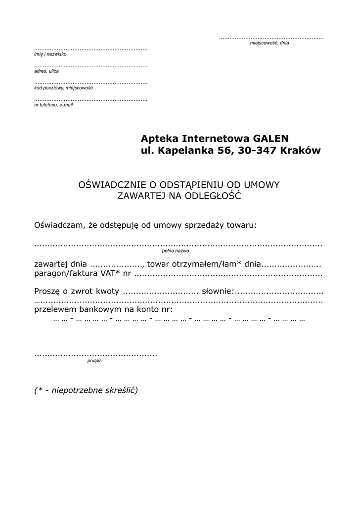 ............................................................ miejscowość, dnia ................................................................. imię i nazwisko ................................................................. adres, ulica ................................................................. kod pocztowy, miejscowość ................................................................. nr telefonu, e-mail Apteka Internetowa GALEN ul. Kapelanka 56, 30-347 Kraków OŚWIADCZNIE O ODSTĄPIENIU OD UMOWY ZAWARTEJ NA ODLEGŁOŚĆ Oświadczam, że odstępuję od umowy sprzedaży towaru: .............................................................................................................. pełna nazwa zawartej dnia ...................., towar otrzymałem/łam* dnia....................... paragon/faktura VAT* nr ........................................................................ Proszę o zwrot kwoty ............................. słownie:.................................. …............................................................................................................ przelewem bankowym na konto nr: ……-…………-…………-…………-…………-…………-………… ............................................... podpis (* - niepotrzebne skreślić)
