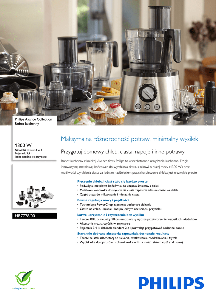 Philips Avance Collection Robot kuchenny 1300 W Niewielki zestaw 4 w 1 Pojemnik 3,4 l Jedno naciśnięcie przycisku Maksymalna różnorodność potraw, minimalny wysiłek Przygotuj domowy chleb, ciasta, napoje i inne potrawy Robot kuchenny z kolekcji Avance firmy Philips to wszechstronne urządzenie kuchenne. Dzięki innowacyjnej metalowej końcówce do wyrabiania ciasta, silnikowi o dużej mocy (1300 W) oraz możliwości wyrabiania ciasta za jednym naciśnięciem przycisku pieczenie chleba jest niezwykle proste. Pieczenie chleba i ciast stało się bardzo proste • Podwójna, metalowa końcówka do ubijania śmietany i białek • Metalowa końcówka do wyrabiania ciasta zapewnia idealne ciasto na chleb • Część tnąca do miksowania i mieszania ciasta Pewna regulacja mocy i prędkości • Technologia PowerChop zapewnia doskonałe siekanie • Ciasto na chleb, ubijanie i lód po jednym naciśnięciu przycisku HR7778/00 Łatwe korzystanie i czyszczenie bez wysiłku • Tarcze XXL o średnicy 18 cm umożliwiają szybsze przetworzenie wszystkich składników • Akcesoria można czyścić w zmywarce • Pojemnik 3,4 l i dzbanek blendera 2,2 l pozwalają przygotować rodzinne porcje Starannie dobrane akcesoria zapewniają doskonałe rezultaty • Tarcze ze stali szlachetnej do siekania, szatkowania, rozdrabniania i frytek • Wyciskarka do cytrusów i sokowirówka odśr. z metal. siateczką (6 szkl. soku) HR7778/00 Robot kuchenny 1300 W Niewielki zestaw 4 w 1, Pojemnik 3,4 l, Jedno naciśnięcie przycisku Zalety Podwójna, metalowa końcówka do ubijania Technologia PowerChop Tarcze XXL umożliwiające szybsze wykonanie pracy Dzięki tarczom XXL o średnicy 18 cm robot kuchenny firmy Philips umożliwia szybsze wykonanie pracy, zapewniając tym samym oszczędność czasu i wysiłku podczas gotowania. Akcesoria można czyścić w zmywarce Podwójna, metalowa końcówka do ubijania włączana jednym naciśnięciem przycisku ubija białka (ich objętość wzrasta do 600%) i śmietanę (jej objętość wzrasta do 200%). Przygotowywanie pysznych deserów nigdy nie było tak proste! Innowacyjna metalowa końcówka do wyrabiania ciasta Dzięki silnikowi o dużej mocy ta metalowa końcówka szybko formuje kulę ciasta z poszczególnych składników. Po uformowaniu ciasta innowacyjna końcówka wyrabia je z odpowiednią siłą, aby otrzymać smaczny chleb. Część tnąca Część tnąca do miksowania i mieszania ciasta Technologia PowerChop to połączenie kształtu ostrza, kąta cięcia i wewnętrznego pojemnika, które daje idealny efekt siekania zarówno miękkich, jak i twardych składników, a także sprawdza się doskonale podczas przygotowywania przecierów oraz mieszania ciasta! Jedno naciśnięcie przycisku Wszystkie akcesoria robota kuchennego Philips znajdujące się w zestawie można myć w zmywarce. Oprócz 12 ustawianych ręcznie prędkości i ustawienia pulsacyjnego robot kuchenny Avance jest wyposażony w 3 automatyczne przyciski. Aby ich użyć, wystarczy ustawić pokrętło w pozycji „ON” i nacisnąć jeden z przycisków. Silnik automatycznie ustawi odpowiednią prędkość i automatyczne funkcje pulsacyjne, aby uzyskać najlepsze rezultaty. Zielone logo firmy Philips „Zielone” produkty firmy Philips zapewniają niższe zużycie energii i redukcję emisji dwutlenku węgla. Jak? Oferują one znacznie lepsze rozwiązania środowiskowe w jednym lub kilku obszarach ekologicznych firmy Philips: wydajności energetycznej, opakowaniu, wykorzystaniu niebezpiecznych substancji, wadze, recyklingu i wyrzucaniu zużytych produktów oraz trwałości. HR7778/00 Robot kuchenny 1300 W Niewielki zestaw 4 w 1, Pojemnik 3,4 l, Jedno naciśnięcie przycisku Dane techniczne Akcesoria Dane techniczne Informacje ogólne Wykończenie • W zestawie: Część tnąca z ostrzem „S”, Wyciskarka do cytrusów, Narzędzie do czyszczenia, Narzędzie do szatkowania na grubo, Narzędzie do siekania na grubo, Podwójna trzepaczka, Narzędzie do szatkowania na drobno, Narzędzie do siekania na drobno, Narzędzie robota kuchennego, Dzbanek, Narzędzie do wyrabiania ciasta, Dwustronna tarcza, Łopatka • • • • Regulowane tarcze do krojenia: 1–7 mm Funkcje: 32+ Liczba ustawień prędkości: 12 + pulsacyjna Charakterystyka produktu: Możliwość mycia w zmywarce, Wbudowany schowek na przewód, Stopy antypoślizgowe, Wyłącznik, Funkcja pulsacji, Schowek • • • • • • • • Moc: 1300 W Napięcie: 220–240 V Częstotliwość: 50/60 Hz Długość przewodu: 1,2 m Pojemność pojemnika: 2,4 L Pojemność dzbanka: 2.2 L Obr./min — blender (maks.): 20 000 obr./min Obr./min — pojemnik (maks.): 1700 obr./min • Materiał akcesoriów: Stal szlachetna/plastik • Materiał dzbanka: Tworzywo SAN • Materiał korpusu: Stal szlachetna Waga i wymiary • Wymiary produktu (D x S x W): 289 x 254 x 436 mm • Data wydania 2016-05-19 © 2016 Koninklijke Philips N.V. Wszelkie prawa zastrzeżone. Wersja: 21.3.1 Dane techniczne mogą ulec zmianie bez powiadomienia. Znaki towarowe są własnością Koninklijke Philips N.V. lub własnością odpowiednich firm. EAN: 08 71010 35872 24 www.philips.com * Akcesoria opcjonalne nie są dostępne na wszystkich rynkach.