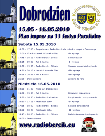 8 Sobota 15.05.2010 16:00 – 17:00 – Przywitanie - Radio Bercik dla dzieci + zespół z Czarnowąs 17:00 - 17:45 – Leszek i Kornelia Filec -I- występ 17:45 – 18:15 – Radio Bercik - Silesia Slonski szałot 18:15 – 19:00 – Adi & Karina -I- występ 19:00 – 19:30 – Radio Bercik - Silesia Slonske konski do kolybanio 19:30 – 20:15 – Leszek i Kornelia Filec -II- występ 20:15 – 20:45 – Adi & Karina -II- występ 21:00 – Disco zabawa zabawa do rana Niedziela 16.05.2010 10:30 – 11:30 – Msza Sw. Dobrodzień 15:00 – 15:30 – Adi & Karina Dodatek i poŜegnanie 15:30 – 16:30 – Radio Bercik dzieciom Recytowanie i muzykowanie 16:30 – 17:15 – Proskauer Echo -I- występ 17:15 – 18:00 – Radio Bercik - Silesia Slonsko potancówka 18:00 – 18:45 – Proskauer Echo -II- występ 18:45 – 20:00 – Radio Bercik - Silesia Podziynkowanie i poŜegnanie 20:00 – Disco zabawa