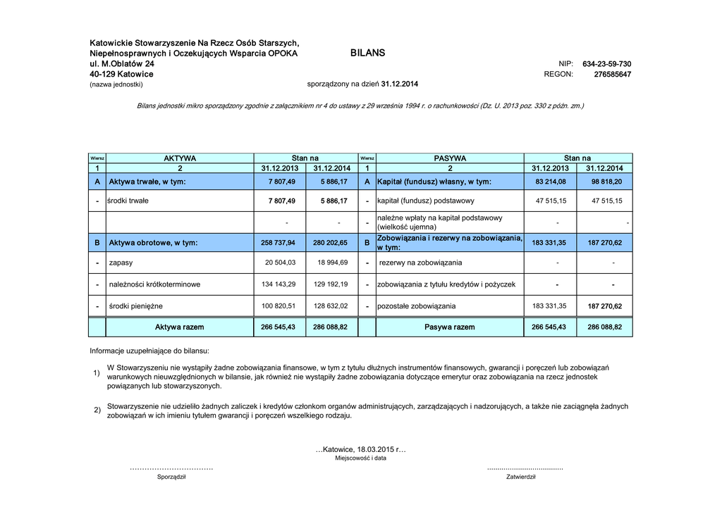 Katowickie Stowarzyszenie Na Rzecz Osób Starszych, Niepełnosprawnych i Oczekujących Wsparcia OPOKA ul. M.Oblatów 24 40-129 Katowice BILANS NIP: REGON: 634-23-59-730 276585647 sporządzony na dzień 31.12.2014 (nazwa jednostki) Bilans jednostki mikro sporządzony zgodnie z załącznikiem nr 4 do ustawy z 29 września 1994 r. o rachunkowości (Dz. U. 2013 poz. 330 z późn. zm.) AKTYWA 2 Wiersz 1 A Aktywa trwałe, w tym: - środki trwałe Stan na 31.12.2013 31.12.2014 Aktywa obrotowe, w tym: - zapasy - 1 7 807,49 5 886,17 A Kapitał (fundusz) własny, w tym: 83 214,08 98 818,20 7 807,49 5 886,17 - kapitał (fundusz) podstawowy 47 515,15 47 515,15 - B Stan na 31.12.2013 31.12.2014 PASYWA 2 Wiersz - - należne wpłaty na kapitał podstawowy (wielkość ujemna) Zobowiązania i rezerwy na zobowiązania, w tym: 258 737,94 280 202,65 B 20 504,03 18 994,69 - rezerwy na zobowiązania należności krótkoterminowe 134 143,29 129 192,19 - zobowiązania z tytułu kredytów i pożyczek środki pieniężne 100 820,51 128 632,02 - pozostałe zobowiązania 266 545,43 286 088,82 Aktywa razem Pasywa razem 183 331,35 187 270,62 - - - - 183 331,35 187 270,62 266 545,43 286 088,82 Informacje uzupełniające do bilansu: 1) W Stowarzyszeniu nie wystąpiły żadne zobowiązania finansowe, w tym z tytułu dłużnych instrumentów finansowych, gwarancji i poręczeń lub zobowiązań warunkowych nieuwzględnionych w bilansie, jak również nie wystąpiły żadne zobowiązania dotyczące emerytur oraz zobowiązania na rzecz jednostek powiązanych lub stowarzyszonych. 2) Stowarzyszenie nie udzieliło żadnych zaliczek i kredytów członkom organów administrujących, zarządzających i nadzorujących, a także nie zaciągnęła żadnych zobowiązań w ich imieniu tytułem gwarancji i poręczeń wszelkiego rodzaju. …Katowice, 18.03.2015 r… Miejscowość i data ……………………………. Sporządził ..................................... Zatwierdził