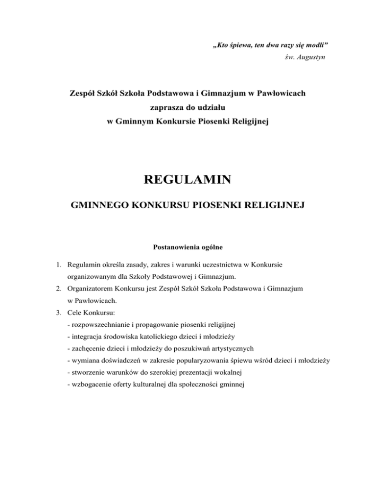 „Kto śpiewa, ten dwa razy się modli” św. Augustyn Zespół Szkół Szkoła Podstawowa i Gimnazjum w Pawłowicach zaprasza do udziału w Gminnym Konkursie Piosenki Religijnej REGULAMIN GMINNEGO KONKURSU PIOSENKI RELIGIJNEJ Postanowienia ogólne 1. Regulamin określa zasady, zakres i warunki uczestnictwa w Konkursie organizowanym dla Szkoły Podstawowej i Gimnazjum. 2. Organizatorem Konkursu jest Zespół Szkół Szkoła Podstawowa i Gimnazjum w Pawłowicach. 3. Cele Konkursu: - rozpowszechnianie i propagowanie piosenki religijnej - integracja środowiska katolickiego dzieci i młodzieży - zachęcenie dzieci i młodzieży do poszukiwań artystycznych - wymiana doświadczeń w zakresie popularyzowania śpiewu wśród dzieci i młodzieży - stworzenie warunków do szerokiej prezentacji wokalnej - wzbogacenie oferty kulturalnej dla społeczności gminnej Uczestnicy Konkursu 1. Udział w przesłuchaniach mogą wziąć soliści. 2. Kategorie wiekowe: I – kl. I – III szkoły podstawowej, II – kl. 4 – 6 szkoły podstawowej, III – kl. I – III gimnazjum. Szkoła może zgłosić do Konkursu maksymalnie 3 osoby w każdej kategorii. 3. Zasady uczestnictwa: - wykonawcy prezentują 1 piosenkę religijną, - czas trwania piosenki nie może przekroczyć 4 minut, - wykonawca może zaprezentować piosenkę a capella lub z akompaniamentem (półplayback przygotowany na płycie CD lub akompaniament „na żywo”) - zgłoszenia można przesłać drogą elektroniczną ([email protected]) lub pocztą na adres szkoły (Karta Zgłoszenia) Organizacja Konkursu 1. Termin i miejsce: - 18 maja 2013 r.: - I kategoria wiekowa – godz. 9.00 - II kategoria wiekowa – godz. 10.00 - III kategoria wiekowa – godz. 11.00 - szkoła w Pawłowicach 2. Organizator zapewnia wykonawcom profesjonalne nagłośnienie, odtwarzacz CD, instrument klawiszowy: electronic piano P-200 YAMAHA Nie dopuszcza się podkładów muzycznych w formacie MP3 i MP4, na kasecie oraz podkładów ze ścieżką wokalną. 3. O kolejności występu w każdej kategorii zdecyduje losowanie (lista pisemna na tablicy ogłoszeń Szkoły w dniu występu). 4. Uczestnicy razem z opiekunami przyjeżdżają na własny koszt Ogłoszenie wyników 1. W swojej ocenie jury kierować się będzie następującymi kryteriami: - warunki głosowe, - poprawność wokalna (intonacja, dykcja, emisja), - interpretacja utworu, - muzykalność, - kultura sceniczna. 2. Wyniki Konkursu zostaną ogłoszone po przesłuchaniu wszystkich uczestników. 3. Jury przyzna: - trzy główne nagrody w każdej kategorii wiekowej - wyróżnienie w każdej kategorii wiekowej - dyplomy 4. Po ogłoszeniu wyników odbędzie się Koncert Laureatów w każdej kategorii wiekowej. 5. Decyzja jury jest nieodwołalna. Postanowienia końcowe 1. Organizator może wykluczyć uczestnika z udziału w Konkursie w przypadku naruszenia przez uczestnika postanowień niniejszego Regulaminu. 2. Organizator powołuje jury, które zdecyduje o przyznaniu miejsc i podziale nagród. 3. Zgłoszenia do Konkursu, które wpłyną po terminie, nie będą rozpatrywane. 4. Zgłoszenia prosimy przesłać do 26 kwietnia 2013 r. na adres: Zespół Szkół Szkoła Podstawowa i Gimnazjum w Pawłowicach ul. Leszczyńska 6 64 – 122 Pawłowice lub drogą elektroniczną: [email protected] Szczegółowych informacji udziela: Anna Kasińska 697 529 897, [email protected] GMINNY KONKURS PIOSENKI RELIGIJNEJ KARTA ZGŁOSZENIA NAZWISKO I IMIĘ: ………………………………………………………………………… KLASA………………………………………………………………… SZKOŁA (adres, telefon) ………………………………………………………………………… …………………………………………………………………………. OPIEKUN…………………………………………………………….. TYTUŁ UTWORU: …………………………………………………………………………. AUTORZY UTWORU *: …………………………………………………………………………. (*) lub zaznaczyć, że anonimowi WYMAGANIA TECHNICZNE (odtwarzacz CD, instrument klawiszowy): ………………………………………………………………………….