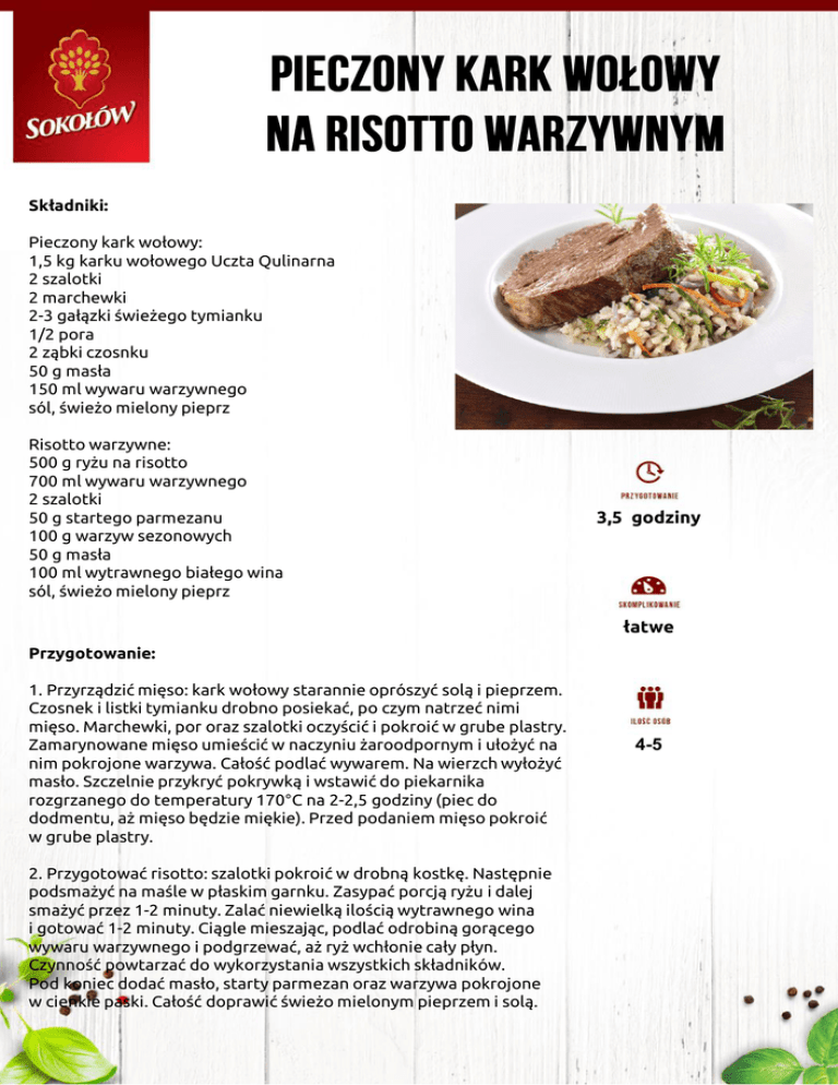 Składniki: Pieczony kark wołowy: 1,5 kg karku wołowego Uczta Qulinarna 2 szalotki 2 marchewki 2-3 gałązki świeżego tymianku 1/2 pora 2 ząbki czosnku 50 g masła 150 ml wywaru warzywnego sól, świeżo mielony pieprz Risotto warzywne: 500 g ryżu na risotto 700 ml wywaru warzywnego 2 szalotki 50 g startego parmezanu 100 g warzyw sezonowych 50 g masła 100 ml wytrawnego białego wina sól, świeżo mielony pieprz 3,5 godziny łatwe Przygotowanie: 1. Przyrządzić mięso: kark wołowy starannie oprószyć solą i pieprzem. Czosnek i listki tymianku drobno posiekać, po czym natrzeć nimi mięso. Marchewki, por oraz szalotki oczyścić i pokroić w grube plastry. Zamarynowane mięso umieścić w naczyniu żaroodpornym i ułożyć na nim pokrojone warzywa. Całość podlać wywarem. Na wierzch wyłożyć masło. Szczelnie przykryć pokrywką i wstawić do piekarnika rozgrzanego do temperatury 170°C na 2-2,5 godziny (piec do dodmentu, aż mięso będzie miękie). Przed podaniem mięso pokroić w grube plastry. 2. Przygotować risotto: szalotki pokroić w drobną kostkę. Następnie podsmażyć na maśle w płaskim garnku. Zasypać porcją ryżu i dalej smażyć przez 1-2 minuty. Zalać niewielką ilością wytrawnego wina i gotować 1-2 minuty. Ciągle mieszając, podlać odrobiną gorącego wywaru warzywnego i podgrzewać, aż ryż wchłonie cały płyn. Czynność powtarzać do wykorzystania wszystkich składników. Pod koniec dodać masło, starty parmezan oraz warzywa pokrojone w cienkie paski. Całość doprawić świeżo mielonym pieprzem i solą. 4-5