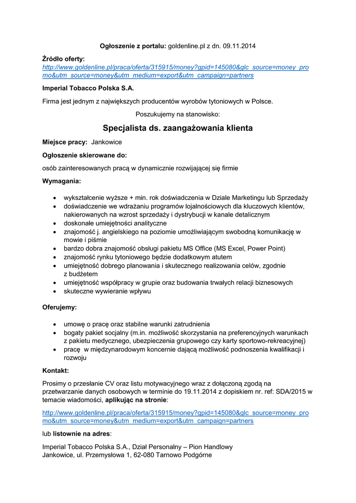 Ogłoszenie z portalu: goldenline.pl z dn. 09.11.2014 Źródło oferty: http://www.goldenline.pl/praca/oferta/315915/money?gpid=145080&glc_source=money_pro mo&utm_source=money&utm_medium=export&utm_campaign=partners Imperial Tobacco Polska S.A. Firma jest jednym z największych producentów wyrobów tytoniowych w Polsce. Poszukujemy na stanowisko: Specjalista ds. zaangażowania klienta Miejsce pracy: Jankowice Ogłoszenie skierowane do: osób zainteresowanych pracą w dynamicznie rozwijającej się firmie Wymagania: wykształcenie wyższe + min. rok doświadczenia w Dziale Marketingu lub Sprzedaży doświadczenie we wdrażaniu programów lojalnościowych dla kluczowych klientów, nakierowanych na wzrost sprzedaży i dystrybucji w kanale detalicznym doskonałe umiejętności analityczne znajomość j. angielskiego na poziomie umożliwiającym swobodną komunikację w mowie i piśmie bardzo dobra znajomość obsługi pakietu MS Office (MS Excel, Power Point) znajomość rynku tytoniowego będzie dodatkowym atutem umiejętność dobrego planowania i skutecznego realizowania celów, zgodnie z budżetem umiejętność współpracy w grupie oraz budowania trwałych relacji biznesowych skuteczne wywieranie wpływu Oferujemy: umowę o pracę oraz stabilne warunki zatrudnienia bogaty pakiet socjalny (m.in. możliwość skorzystania na preferencyjnych warunkach z pakietu medycznego, ubezpieczenia grupowego czy karty sportowo-rekreacyjnej) pracę w międzynarodowym koncernie dającą możliwość podnoszenia kwalifikacji i rozwoju Kontakt: Prosimy o przesłanie CV oraz listu motywacyjnego wraz z dołączoną zgodą na przetwarzanie danych osobowych w terminie do 19.11.2014 z dopiskiem nr. ref: SDA/2015 w temacie wiadomości, aplikując na stronie: http://www.goldenline.pl/praca/oferta/315915/money?gpid=145080&glc_source=money_pro mo&utm_source=money&utm_medium=export&utm_campaign=partners lub listownie na adres: Imperial Tobacco Polska S.A., Dział Personalny – Pion Handlowy Jankowice, ul. Przemysłowa 1, 62-080 Tarnowo Podgórne