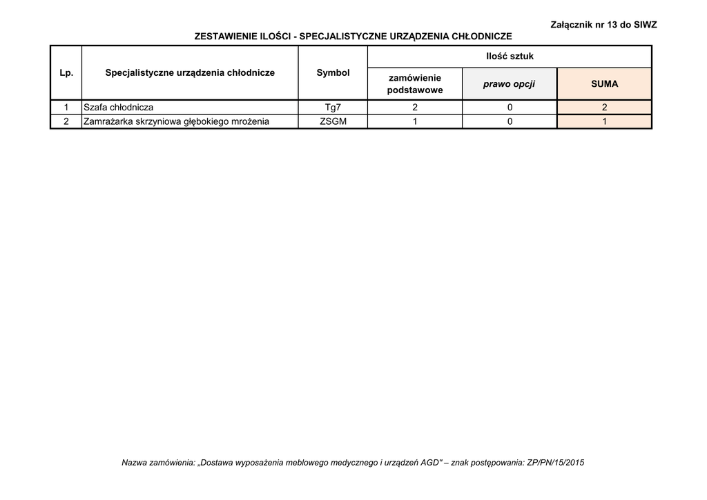 Załącznik nr 13 do SIWZ ZESTAWIENIE ILOŚCI - SPECJALISTYCZNE URZĄDZENIA CHŁODNICZE Ilość sztuk Lp. Specjalistyczne urządzenia chłodnicze 1 Szafa chłodnicza 2 Zamrażarka skrzyniowa głębokiego mrożenia Symbol zamówienie podstawowe prawo opcji SUMA Tg7 2 0 2 ZSGM 1 0 1 Nazwa zamówienia: „Dostawa wyposażenia meblowego medycznego i urządzeń AGD" – znak postępowania: ZP/PN/15/2015