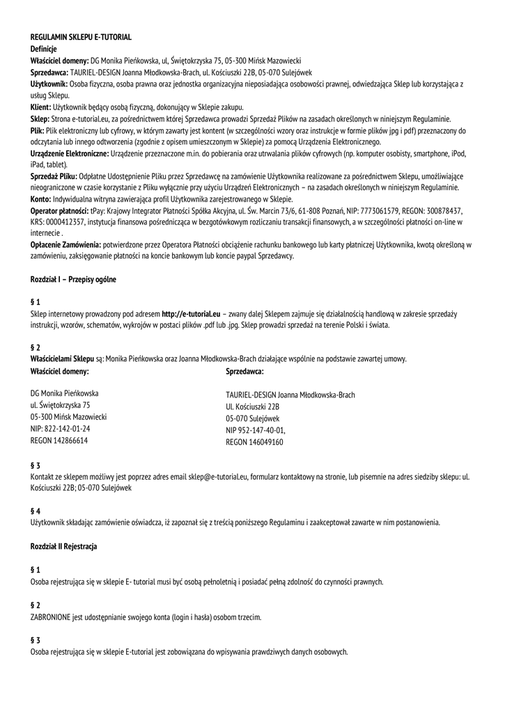 REGULAMIN SKLEPU E-TUTORIAL Definicje Właściciel domeny: DG Monika Pieńkowska, ul, Świętokrzyska 75, 05-300 Mińsk Mazowiecki Sprzedawca: TAURIEL-DESIGN Joanna Młodkowska-Brach, ul. Kościuszki 22B, 05-070 Sulejówek Użytkownik: Osoba fizyczna, osoba prawna oraz jednostka organizacyjna nieposiadająca osobowości prawnej, odwiedzająca Sklep lub korzystająca z usług Sklepu. Klient: Użytkownik będący osobą fizyczną, dokonujący w Sklepie zakupu. Sklep: Strona e-tutorial.eu, za pośrednictwem której Sprzedawca prowadzi Sprzedaż Plików na zasadach określonych w niniejszym Regulaminie. Plik: Plik elektroniczny lub cyfrowy, w którym zawarty jest kontent (w szczególności wzory oraz instrukcje w formie plików jpg i pdf) przeznaczony do odczytania lub innego odtworzenia (zgodnie z opisem umieszczonym w Sklepie) za pomocą Urządzenia Elektronicznego. Urządzenie Elektroniczne: Urządzenie przeznaczone m.in. do pobierania oraz utrwalania plików cyfrowych (np. komputer osobisty, smartphone, iPod, iPad, tablet). Sprzedaż Pliku: Odpłatne Udostępnienie Pliku przez Sprzedawcę na zamówienie Użytkownika realizowane za pośrednictwem Sklepu, umożliwiające nieograniczone w czasie korzystanie z Pliku wyłącznie przy użyciu Urządzeń Elektronicznych – na zasadach określonych w niniejszym Regulaminie. Konto: Indywidualna witryna zawierająca profil Użytkownika zarejestrowanego w Sklepie. Operator płatności: tPay: Krajowy Integrator Płatności Spółka Akcyjna, ul. Św. Marcin 73/6, 61-808 Poznań, NIP: 7773061579, REGON: 300878437, KRS: 0000412357, instytucja finansowa pośrednicząca w bezgotówkowym rozliczaniu transakcji finansowych, a w szczególności płatności on-line w internecie . Opłacenie Zamówienia: potwierdzone przez Operatora Płatności obciążenie rachunku bankowego lub karty płatniczej Użytkownika, kwotą określoną w zamówieniu, zaksięgowanie płatności na koncie bankowym lub koncie paypal Sprzedawcy. Rozdział I – Przepisy ogólne §1 Sklep internetowy prowadzony pod adresem http://e-tutorial.eu – zwany dalej Sklepem zajmuje się działalnością handlową w zakresie sprzedaży instrukcji, wzorów, schematów, wykrojów w postaci plików .pdf lub .jpg. Sklep prowadzi sprzedaż na terenie Polski i świata. §2 Właścicielami Sklepu są: Monika Pieńkowska oraz Joanna Młodkowska-Brach działające wspólnie na podstawie zawartej umowy. Właściciel domeny: Sprzedawca: DG Monika Pieńkowska ul. Świętokrzyska 75 05-300 Mińsk Mazowiecki NIP: 822-142-01-24 REGON 142866614 TAURIEL-DESIGN Joanna Młodkowska-Brach Ul. Kościuszki 22B 05-070 Sulejówek NIP 952-147-40-01, REGON 146049160 §3 Kontakt ze sklepem możliwy jest poprzez adres email [email protected], formularz kontaktowy na stronie, lub pisemnie na adres siedziby sklepu: ul. Kościuszki 22B; 05-070 Sulejówek §4 Użytkownik składając zamówienie oświadcza, iż zapoznał się z treścią poniższego Regulaminu i zaakceptował zawarte w nim postanowienia. Rozdział II Rejestracja §1 Osoba rejestrująca się w sklepie E- tutorial musi być osobą pełnoletnią i posiadać pełną zdolność do czynności prawnych. §2 ZABRONIONE jest udostępnianie swojego konta (login i hasła) osobom trzecim. §3 Osoba rejestrująca się w sklepie E-tutorial jest zobowiązana do wpisywania prawdziwych danych osobowych. Rozdział III Zawarcie i wykonanie umowy §1 Produkty prezentowane na stronie sklepu nie stanowią oferty handlowej w myśl przepisów kodeksu cywilnego. §2 Sprzedaż Pliku następuje po złożeniu przez Klienta zamówienia, które realizowane jest poprzez kliknięcie ikony o nazwie KUPUJĘ I PŁACĘ oraz złożenie dyspozycji zapłaty w sposób określony w niniejszym Regulaminie. Po złożeniu zamówienia Klient otrzyma na podany przez niego adres e-mail wiadomość potwierdzającą treść złożonego zamówienia, zawierającą pouczenie o przysługującym prawie do odstąpienia od umowy o dostarczanie Plików niezapisanych na nośniku materialnym oraz utracie prawa do odstąpienia od umowy w związku ze złożonym przez Konsumenta żądaniem rozpoczęcia świadczenia usługi przed upływem 14 dniowego terminu do odstąpienia od umowy. Klient może zapoznać się z historią zakupów dokonywanych w Sklepie za pośrednictwem swojego Konta w Sklepie. W momencie kliknięcia ikony KUPUJĘ I PŁACĘ dochodzi do zawarcia umowy między Sklepem a Klientem, której przedmiotem jest Sprzedaż danego Pliku (Plików). Cena określona przy danym Pliku w chwili złożenia zamówienia zawiera podatek od towarów i usług wg. stawki obowiązującej przy dokonywaniu tej transakcji oraz wszelkie koszty, które Klient ponosi na rzecz Sklepu, w związku ze sprzedażą mu tego Pliku (Plików) oraz jego (ich) pobraniem, z wyłączeniem kosztów należnych od Klienta na rzecz podmiotów świadczących usługi telekomunikacyjne i im podobne, umożliwiające połączenie z Serwisem oraz na rzecz instytucji finansowych – zgodnie z tabelami opłat obowiązującymi w tych przedsiębiorstwach. §3 Użytkownik zobowiązany jest do Opłacenia Zamówienia, zgodnie z dokonanym przez niego wyborem, za pośrednictwem: a) operatora Płatności tPay b) bezpośrednio przelewem na rachunek bankowy Sprzedawcy: Nr konta: mBank 53 1140 2004 0000 3702 7466 1356, posiadacz rachunku: TAURIELDESIGN Joanna Młodkowska-Brach, adres: ul. Kościuszki 22B; 05-070 Sujelówek c) – przelewając pieniądze na konto paypal: [email protected] §4 Sprzedaż Pliku jest każdorazowo potwierdzana specyfikacją zamówienia przesyłaną pod adres poczty elektronicznej wskazany przez Klienta. Na żądanie Klienta wyrażone przez zaznaczenie odpowiedniej opcji podczas składania zamówienia jest dokumentowane fakturą VAT. Sklep przesyła do Klienta fakturę elektroniczną w rozumieniu art. 2 pkt. 32) ustawy o podatku od towarów i usług (Dz. U. z 2011 r. poz. 1054 ze zm.) na adres poczty elektronicznej Klienta (domyślnie) albo fak