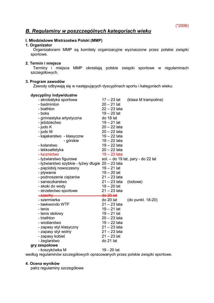 (*2006) B. Regulaminy w poszczególnych kategoriach wieku I. M odzie owe Mistrzostwa Polski (MMP) 1. Organizator Organizatorami MMP s komitety organizacyjne wyznaczone przez polskie zwi zki sportowe. 2. Termin i miejsce Terminy i miejsca MMP okre laj szczegó$owych. polskie zwi zki sportowe w regulaminach 3. Program zawodów Zawody odbywaj si( w nast(puj cych dyscyplinach sportu i kategoriach wieku: dyscypliny indywidualne - akrobatyka sportowa 17 – 23 lat (klasa M trampolina) - badminton 20 – 21 lat - biathlon 22 – 23 lata - boks 19 – 20 lat - gimnastyka artystyczna do 18 lat - je1dziectwo 19 – 21 lat - judo K 20 – 22 lata - judo M 20 – 22 lata - kajakarstwo - klasyczne 19 – 22 lata - górskie 19 – 22 lata - kolarstwo 19 – 22 lata - lekkoatletyka 20 – 22 lata - $ucznictwo 19 – 23 lata - $y3wiarstwo figurowe sol. – do 19 lat, pary - do 22 lat - $y3wiarstwo szybkie - $y3wy d$ugie 20 – 23 lata - pi(ciobój nowoczesny 19 – 21 lat - p$ywanie 19 – 20 lat - podnoszenie ci(3arów 21 – 23 lata - saneczkarstwo 21 – 23 lata (lodowe) - skoki do wody 19 – 20 lat - strzelectwo sportowe 21 – 23 lata - szachy do 20 lat - szermierka do 20 lat (do punkt. 18-20) - taekwondo WTF 21 – 23 lata - tenis 19 – 21 lat - tenis sto$owy 19 – 21 lat - triathlon 20 – 23 lata - wio larstwo 19 – 22 lata - zapasy styl klasyczny 21 – 23 lata - zapasy styl wolny 21 – 23 lata - zapasy kobiet 21 – 23 lat - 3eglarstwo do 21 lat gry zespo owe - koszykówka M 19 - 20 lat wed$ug regulaminów szczegó$owych opracowanych przez polskie zwi zki sportowe. 4. Ocena wyników patrz regulaminy szczegó$owe 5. Zasady finansowania 5.1. Koszty organizacyjne MMP pokrywane s przez polskie zwi zki sportowe. 5.2. Koszty uczestnictwa pokrywaj uczestnicy. II. Mistrzostwa Polski Juniorów (MPJ) 1. Organizator 1.1. Organizatorami zawodów s komitety organizacyjne wyznaczone przez polskie zwi zki sportowe. 2. Termin i miejsce Terminy i miejsca MPJ okre laj szczegó$owych. 3. Program zawodów polskie zwi zki sportowe w regulaminach ((+) – oznacza dyscypliny rozgrywane w ramach OOM) dyscypliny indywidualne - akrobatyka sportowa - badminton - biathlon - biathlon letni - bieg na orientacj( - biegi prze$ajowe - boks - bryd3 - gimnastyka artystyczna - gimnastyka sportowa - je1dziectwo - judo K - judo M - kajakarstwo - klasyczne - górskie - kolarstwo - kr(glarstwo - lekkoatletyka - $ucznictwo - $y3wiarstwo figurowe - $y3wiarstwo szybkie - $y3wy d$ugie - short track - narciarstwo alpejskie - narciarstwo klasyczne - biegi - kombinacja norweska - skoki - pi(ciobój nowoczesny (4-bój) - p$ywanie - p$ywanie synchroniczne - podnoszenie ci(3arów - saneczkarstwo - skoki do wody - snowboard - strzelectwo sportowe - szachy 11-19, 11-16, 12-18, do 15 lat (klasa I, II) 17 – 19 lat 19 – 21 lat (+) 19 – 21 lat 17 – 18 lat 18 – 19 lat 17 – 18 lat 19 – 20 lat do 15 lat (klasa I) K – do 16 lat (klasa I) M – do 18 lat (klasa I) 17 – 18 lat 17 – 19 lat 17 – 19 lat 17 – 18 lat 17 – 18 lat 17 – 18 lat 19 – 23 lata 18 – 19 lat 17 – 18 lat sol. – do 19 lat, pary - do 19 lat 18 – 19 lat 18 – 19 lat 16 – 20 lat (+) (+) (+) 19 – 20 lat (+) 19 – 20 lat (+) 17 – 18 lat (+) 17 – 18 lat 17 – 18 lat (+) do 18 lat 19 – 20 lat 18 – 20 lat (+) 16 – 18 lat 16 – 20 lat (+) 18 – 20 lat 17 – 18 lat i 15 – 16 lat - szermierka - taekwondo WTF - taekwondo ITF - tenis - tenis sto$owy - triathlon - wio larstwo - zapasy styl klasyczny - zapasy styl wolny - zapasy kobiet - 3eglarstwo - 3eglarstwo lodowe do 17 lat (do punktacji indyw. 16 - 17 lat) 18 – 20 lat 17 – 18 lat 17 – 18 lat 16 – 18 lat 18 – 19 lat 17 – 18 lat 18 – 20 lat 18 – 20 lat 18 – 20 lat do 18 lat, do 19 lat do 21 lat gry zespo owe - hokej na lodzie 19 – 21 lat - hokej na trawie K, M 17 – 19 lat - koszykówka K, M 17 – 18 lat - pi$ka no3na K 16 – 18 lat - pi$ka no3na M 18 – 19 lat - pi$ka r(czna K, M 18 – 19 lat - pi$ka siatkowa K, M do 19 lat - pi$ka siatkowa pla3owa K, M do 19 lat - pi$ka wodna 18 – 19 lat - rugby 18 – 19 lat wed$ug regulaminów szczegó$owych opracowanych przez polskie zwi zki sportowe. 4. Ocena wyników patrz regulaminy szczegó$owe dyscyplin 5. Zasady finansowania 5.1. Koszty organizacyjne zawodów fina$owych finansowana s sportowe. 5.2. Koszty zakwaterowania i wy3ywienia pokrywaj uczestnicy. przez polskie zwi zki III. Ogólnopolska Olimpiada Juniorów M odszych M odzie y – Mistrzostwa Polski 1. Organizator 1.1. Organizatorem zawodów fina$owych s terenowe komitety organizacyjne. 1.2. Bezpo redni nadzór nad realizacj OOM sprawuje Ministerstwa Sportu. 1.3. Kierownictwo sportowe nad zawodami w poszczególnych dyscyplinach sprawuj polskie zwi zki sportowe. 1.4.Zawody eliminacyjne przeprowadzane s w strefach wed$ug regulaminów szczegó$owych. Organizatorami zawodów eliminacyjnych s Wojewódzkie Interdyscyplinarne Stowarzyszenia Sportowe. 1.5. W niektórych dyscyplinach sportu prowadzone s eliminacje centralne organizowane przez polskie zwi zki sportowe. 2.Termin i miejsce: Ogólnopolska Olimpiada M$odzie3y rozgrywana jest w czterech blokach sportów: - sporty zimowe - luty - biegi prze$ajowe - marzec/kwiecie@ - sporty halowe - maj - sporty letnie - lipiec Terminy i miejsca zawodów okre la Komitet Organizacyjny OOM w Komunikacie. 3. Program zawodów: - w ramach Ogólnopolskiej Olimpiady M odzie y (OOM) – Mistrzostw Polski Juniorów M odszych (MPJM ) a) sporty zimowe - biathlon 17 –18 lat - hokej na lodzie 17 – 18 lat - $y3wiarstwo figurowe jm$ A, jm$ B - $y3wiarstwo szybkie - $y3wy d$ugie 16 –17 lat - $y3wiarstwo szybkie - short track 16 –17 lat - narciarstwo alpejskie 14 –15 lat - narciarstwo klasyczne - biegi 17 –18 lat - kombinacja norw. 17 –18 lat - skoki 15 –16 lat - saneczkarstwo 15 –17 lat - snowboard 13 –15 lat b) biegi prze ajowe - biegi prze$ajowe 16 – 17 lat c) sporty halowe - akrobatyka sportowa do 15 lat, do 13 lat (