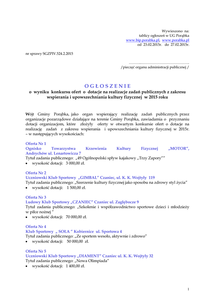 Wywieszono na: tablicy ogłoszeń w UG Porąbka www.bip.porabka.pl, www.porabka.pl od 23.02.2015r. do 27.02.2015r. nr sprawy SGZPIV.524.2.2015 ………..…………………………………. /pieczęć organu administracji publicznej / OGŁOSZENIE o wyniku konkursu ofert o dotacje na realizacje zadań publicznych z zakresu wspierania i upowszechniania kultury fizycznej w 2015 roku Wójt Gminy Porąbka, jako organ wspierający realizację zadań publicznych przez organizacje pozarządowe działające na terenie Gminy Porąbka, zawiadamia o przyznaniu dotacji organizacjom, które złożyły oferty w otwartym konkursie ofert o dotacje na realizację zadań z zakresu wspierania i upowszechniania kultury fizycznej w 2015r. – w następujących wysokościach: Oferta Nr 1 Ognisko Towarzystwa Krzewienia Kultury Fizycznej „MOTOR”, Andrychów ul. Lenartowicza 7 Tytuł zadania publicznego: „49 Ogólnopolski spływ kajakowy „Trzy Zapory”” wysokość dotacji: 3 000,00 zł. Oferta Nr 2 Uczniowski Klub Sportowy „GIMBAL” Czaniec, ul. K. K. Wojtyły 119 Tytuł zadania publicznego: „Szerzenie kultury fizycznej jako sposobu na zdrowy styl życia” wysokość dotacji: 1 500,00 zł. Oferta Nr 3 Ludowy Klub Sportowy „CZANIEC” Czaniec ul. Zagłębocze 9 Tytuł zadania publicznego: „Szkolenie i współzawodnictwo sportowe dzieci i młodzieży w piłce nożnej ” wysokość dotacji: 70 000,00 zł. Oferta Nr 4 Klub Sportowy „ SOŁA ” Kobiernice ul. Sportowa 4 Tytuł zadania publicznego: „Ze sportem wesoło, aktywnie i zdrowo” wysokość dotacji: 50 000,00 zł. Oferta Nr 5 Uczniowski Klub Sportowy „DIAMENT” Czaniec ul. K. K. Wojtyły 32 Tytuł zadania publicznego: „Nowa Olimpiada” wysokość dotacji: 1 400,00 zł. 1 Oferta Nr 6 Ludowy Klub Sportowy Porąbka „ ZAPORA” Porąbka ul. Stadionowa 5 Tytuł zadania publicznego: „Szkolenie dzieci i młodzieży oraz współzawodnictwo w piłce nożnej” wysokość dotacji: 55 000,00 zł. Oferta Nr 7 Ludowy Klub Sportowy „GROŃ ” Bujaków ul. Bielska 1a Tytuł zadania publicznego: „Organizowanie i przeprowadzanie zajęć sportowych w piłce nożnej – współzawodnictwo sportowe dzieci i młodzieży” wysokość dotacji: 41 000,00 zł. Oferta Nr 8 Fundacja „PROMYCZEK” Andrychów, Targanice ul. Dobra 4 Tytuł zadania publicznego: „Sprawniejsi – bardziej samodzielni” OFERTA ODRZUCONA Z PRZYCZYN FORMALNYCH Oferta Nr 9 Parafialny Klub Sportowy „ MILLENIUM” Porąbka ul. Rynek 1 Tytuł zadania publicznego: „Sport to pasja” wysokość dotacji: 5 600,00 zł. Umowy na realizację zadań publicznych z organizacjami które złożyły oferty o numerach: 3, 4, 6,7 zostaną podpisane w dniu 25.02.2015 r. Z pozostałymi oferentami którym przyznano dotacje umowy zostaną podpisane w dniu 27.02.2015r. UWAGA: przed wyznaczonymi terminami tj. odpowiednio do 24.02.2015 i do 26.02.2015 r., należy dostarczyć do UG Porąbka zaktualizowane harmonogramy i kosztorysy dotyczące realizacji zadań biorących udział w konkursie, którym przyznano dotacje w wysokości mniejszej od wnioskowanej. Wszelkich informacji udziela Inspektor Referatu Spraw Gospodarczych i zamówień Publicznych UG Porąbka Ewa Jędrzejowska - pok. nr 4, tel. 033 8272807 oraz Marzena Krupińska – pok. nr 2 , tel. 033 8272802 UG Porąbka. WÓJT GMINY PORĄBKA Czesław Bułka 2