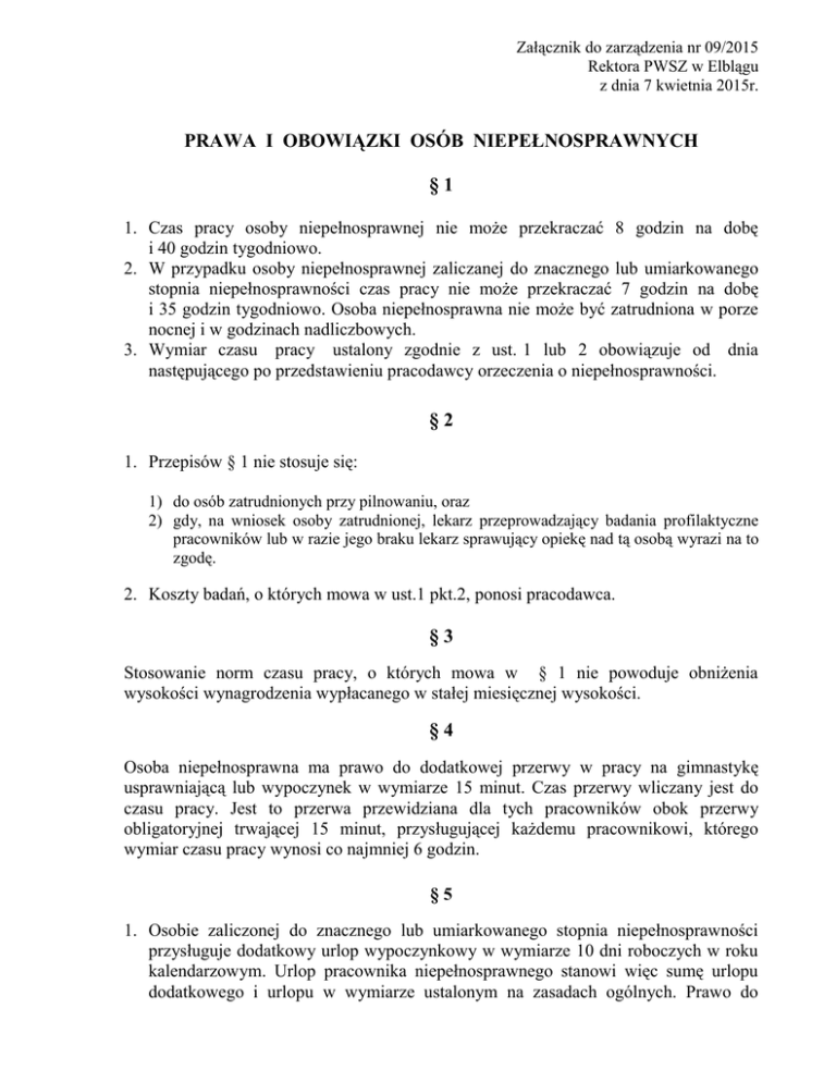 Załącznik do zarządzenia nr 09/2015 Rektora PWSZ w Elblągu z dnia 7 kwietnia 2015r. PRAWA I OBOWIĄZKI OSÓB NIEPEŁNOSPRAWNYCH §1 1. Czas pracy osoby niepełnosprawnej nie może przekraczać 8 godzin na dobę i 40 godzin tygodniowo. 2. W przypadku osoby niepełnosprawnej zaliczanej do znacznego lub umiarkowanego stopnia niepełnosprawności czas pracy nie może przekraczać 7 godzin na dobę i 35 godzin tygodniowo. Osoba niepełnosprawna nie może być zatrudniona w porze nocnej i w godzinach nadliczbowych. 3. Wymiar czasu pracy ustalony zgodnie z ust. 1 lub 2 obowiązuje od dnia następującego po przedstawieniu pracodawcy orzeczenia o niepełnosprawności. §2 1. Przepisów § 1 nie stosuje się: 1) do osób zatrudnionych przy pilnowaniu, oraz 2) gdy, na wniosek osoby zatrudnionej, lekarz przeprowadzający badania profilaktyczne pracowników lub w razie jego braku lekarz sprawujący opiekę nad tą osobą wyrazi na to zgodę. 2. Koszty badań, o których mowa w ust.1 pkt.2, ponosi pracodawca. §3 Stosowanie norm czasu pracy, o których mowa w § 1 nie powoduje obniżenia wysokości wynagrodzenia wypłacanego w stałej miesięcznej wysokości. §4 Osoba niepełnosprawna ma prawo do dodatkowej przerwy w pracy na gimnastykę usprawniającą lub wypoczynek w wymiarze 15 minut. Czas przerwy wliczany jest do czasu pracy. Jest to przerwa przewidziana dla tych pracowników obok przerwy obligatoryjnej trwającej 15 minut, przysługującej każdemu pracownikowi, którego wymiar czasu pracy wynosi co najmniej 6 godzin. §5 1. Osobie zaliczonej do znacznego lub umiarkowanego stopnia niepełnosprawności przysługuje dodatkowy urlop wypoczynkowy w wymiarze 10 dni roboczych w roku kalendarzowym. Urlop pracownika niepełnosprawnego stanowi więc sumę urlopu dodatkowego i urlopu w wymiarze ustalonym na zasadach ogólnych. Prawo do Załącznik do zarządzenia nr 09/2015 Rektora PWSZ w Elblągu z dnia 7 kwietnia 2015r. pierwszego urlopu dodatkowego niepełnosprawny pracownik nabywa po przepracowaniu jednego roku po dniu zaliczenia go do jednego ze stopni niepełnosprawności. Prawo do kolejnego urlopu dodatkowego przysługuje pracownikowi z początkiem nowego roku. 2. Urlop dodatkowy, o którym mowa w ust.1, nie przysługuje, jeżeli niepełnosprawny pracownik jest uprawniony do urlopu wypoczynkowego w wymiarze przekraczającym 26 dni roboczych lub do urlopu dodatkowego na podstawie odrębnych przepisów, chyba że wymiar tego urlopu dodatkowego jest niższy niż 10 dni roboczych. Wtedy bowiem zamiast tego urlopu przysługuje urlop dodatkowy, o którym mowa w ust.1 (tj. 10 dni roboczych). §6 Osoba o znacznym lub umiarkowanym stopniu niepełnosprawności ma prawo do zwolnienia od pracy z zachowaniem prawa do wynagrodzenia: a) w celu wykonania badań specjalistycznych, zabiegów leczniczych lub usprawniających, a także w celu uzyskania zapotrzebowania ortopedycznego lub jego naprawy, jeżeli czynności te nie mogą być wykonane poza godzinami pracy, b) w wymiarze do 21 dni roboczych w celu uczestniczenia w turnusie rehabilitacyjnym, nie częściej jednak niż raz w roku. Jeżeli pracownik skorzystał z tego zwolnienia, nie przysługuje mu dodatkowy urlop wypoczynkowy, jeżeli zaś pracownik wykorzystał już urlop wypoczynkowy, pracodawca może udzielić mu zwolnienia z zachowaniem prawa do wynagrodzenia za czas stanowiący różnicę pomiędzy liczbą dni roboczych w czasie trwania turnusu a liczbą dni roboczych wykorzystanego urlopu wypoczynkowego. Zwolnienie udzielane jest na podstawie wniosku lekarza o skierowanie na turnus rehabilitacyjny, który określać musi rodzaj i czas trwania turnusu. Podstawą wymiaru wynagrodzenia za czas zwolnienia jest dokument, który potwierdza pobyt na turnusie, wystawiony przez organizatora turnusu. Łączny wymiar dodatkowego urlopu wypoczynkowego i zwolnienia od pracy w celu uczestniczenia w turnusie rehabilitacyjnym, nie może przekroczyć 21 dni roboczych w roku kalendarzowym.