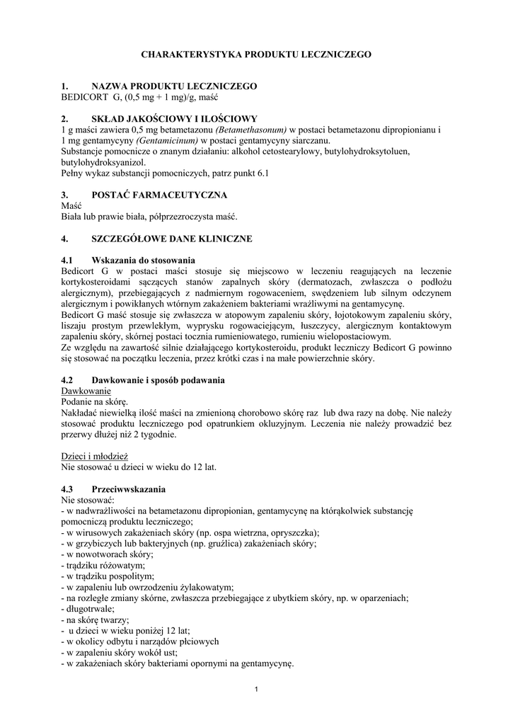 CHARAKTERYSTYKA PRODUKTU LECZNICZEGO 1. NAZWA PRODUKTU LECZNICZEGO BEDICORT G, (0,5 mg + 1 mg)/g, maść 2. SKŁAD JAKOŚCIOWY I ILOŚCIOWY 1 g maści zawiera 0,5 mg betametazonu (Betamethasonum) w postaci betametazonu dipropionianu i 1 mg gentamycyny (Gentamicinum) w postaci gentamycyny siarczanu. Substancje pomocnicze o znanym działaniu: alkohol cetostearylowy, butylohydroksytoluen, butylohydroksyanizol. Pełny wykaz substancji pomocniczych, patrz punkt 6.1 3. POSTAĆ FARMACEUTYCZNA Maść Biała lub prawie biała, półprzezroczysta maść. 4. SZCZEGÓŁOWE DANE KLINICZNE 4.1 Wskazania do stosowania Bedicort G w postaci maści stosuje się miejscowo w leczeniu reagujących na leczenie kortykosteroidami sączących stanów zapalnych skóry (dermatozach, zwłaszcza o podłożu alergicznym), przebiegających z nadmiernym rogowaceniem, swędzeniem lub silnym odczynem alergicznym i powikłanych wtórnym zakażeniem bakteriami wrażliwymi na gentamycynę. Bedicort G maść stosuje się zwłaszcza w atopowym zapaleniu skóry, łojotokowym zapaleniu skóry, liszaju prostym przewlekłym, wyprysku rogowaciejącym, łuszczycy, alergicznym kontaktowym zapaleniu skóry, skórnej postaci tocznia rumieniowatego, rumieniu wielopostaciowym. Ze względu na zawartość silnie działającego kortykosteroidu, produkt leczniczy Bedicort G powinno się stosować na początku leczenia, przez krótki czas i na małe powierzchnie skóry. 4.2 Dawkowanie i sposób podawania Dawkowanie Podanie na skórę. Nakładać niewielką ilość maści na zmienioną chorobowo skórę raz lub dwa razy na dobę. Nie należy stosować produktu leczniczego pod opatrunkiem okluzyjnym. Leczenia nie należy prowadzić bez przerwy dłużej niż 2 tygodnie. Dzieci i młodzież Nie stosować u dzieci w wieku do 12 lat. 4.3 Przeciwwskazania Nie stosować: - w nadwrażliwości na betametazonu dipropionian, gentamycynę na którąkolwiek substancję pomocniczą produktu leczniczego; - w wirusowych zakażeniach skóry (np. ospa wietrzna, opryszczka); - w grzybiczych lub bakteryjnych (np. gruźlica) zakażeniach skóry; - w nowotworach skóry; - trądziku różowatym; - w trądziku pospolitym; - w zapaleniu lub owrzodzeniu żylakowatym; - na rozległe zmiany skórne, zwłaszcza przebiegające z ubytkiem skóry, np. w oparzeniach; - długotrwale; - na skórę twarzy; - u dzieci w wieku poniżej 12 lat; - w okolicy odbytu i narządów płciowych - w zapaleniu skóry wokół ust; - w zakażeniach skóry bakteriami opornymi na gentamycynę. 1 4.4 Specjalne ostrzeżenia i środki ostrożności dotyczące stosowania Jeśli po zastosowaniu produktu leczniczego Bedicort G w maści wystąpi skórna reakcja alergiczna (świąd, pieczenie lub zaczerwienienie skóry), należy go natychmiast odstawić. Nie należy stosować okładów i opatrunków zamkniętych, gdyż mogą nasilać wchłanianie dipropionianu betametazonu przez skórę (patrz punkty 4.8. i 4.9.) oraz może dojść do wtórnych zakażeń. Unikać kontaktu produktu z oczami i błonami śluzowymi. Nie stosować do oczu ani wokół oczu, ze względu na ryzyko wystąpienia jaskry lub zaćmy. W przypadku wystąpienia grzybiczych zakażeń skóry, należy zastosować dodatkowo miejscowe leczenie lekami przeciwgrzybicznymi. Ze względu na to, że kortykosteroidy i gentamycyna wchłaniają się przez skórę, podczas stosowania produktu leczniczego Bedicort G w maści istnieje ryzyko wystąpienia ogólnoustrojowych objawów niepożądanych kortykosteroidów (w tym zahamowanie czynności kory nadnerczy) oraz gentamycyny (oto- i nefrotoksyczność, szczególnie u osób z zaburzeniami czynności nerek). Z tego względu należy unikać stosowania produktu na dużą powierzchnię ciała, uszkodzoną skórę, stosowania w dużych dawkach, stosowania u pacjentów z zaburzeniami czynności wątroby, nerek i u dzieci (patrz punkty 4.8. i 4.9.). Szczególnie ostrożnie należy stosować produkt leczniczy u pacjentów z łuszczycą, gdyż miejscowe stosowanie kortykosteroidów w łuszczycy może być niebezpieczne, m.in. ze względu na nawrót choroby spowodowany rozwojem tolerancji, ryzyko wystąpienia uogólnionej łuszczycy krostkowej i ogólne działania toksyczne spowodowane zaburzeniem ciągłości skóry. Długotrwałe miejscowe stosowanie siarczanu gentamycyny prowadzi do nadmiernego wzrostu niewrażliwych drobnoustrojów oraz może spowodować pojawienie się bakterii opornych na antybiotyki aminoglikozydowe. Nie należy stosować leku na skórę twarzy, ze względu na ryzyko wystąpienia teleangiektazji, dermatitis perioralis, nawet po krótkim stosowaniu. Na skórę pach i pachwin stosować tylko w przypadkach bezwzględnie koniecznych, ze względu na zwiększone wchłanianie produktu leczniczego przez delikatną skórę. Ostrożnie stosować w stanach zanikowych tkanki podskórnej, zwłaszcza u osób w podeszłym wieku. Ze względu na zawartość alkoholu cetostearylowego, butylohydroksytoluenu lubbutylohydroksyanizolu, produkt leczniczy może powodować miejscowe reakcje skórne (np. kontaktowe zapalenie skóry). 4.5 Interakcje z innymi produktami leczniczymi i inne rodzaje interakcji Podczas leczenia glikokortykosteroidami nie należy szczepić chorych przeciwko ospie. Nie należy też podejmować innych immunizacji, szczególnie przy przewlekłym stosowaniu na dużą powierzchnię skóry, ze względu na ryzyko braku odpowiedzi immunologicznej w postaci pojawienia się przeciwciał. Bedicort G maść może nasilać działanie leków immunosupresyjnych i osłabiać działanie leków immunostymulujących. 4.6 Wpływ na płodność, ciążę i laktację Ciąża Nie zaleca się stosowania produktu leczniczego Bedicort G maść u kobiet w ciąży. Nie ma wyników badań dotyczących bezpieczeństwa miejscowego stosowania betametazonu i gentamycyny u ciężarnych kobiet. Wiadomo jednak, że substancje te mogą się wchłaniać przez skórę. W badaniach na zwierzętach wykazano, że kortykosteroi