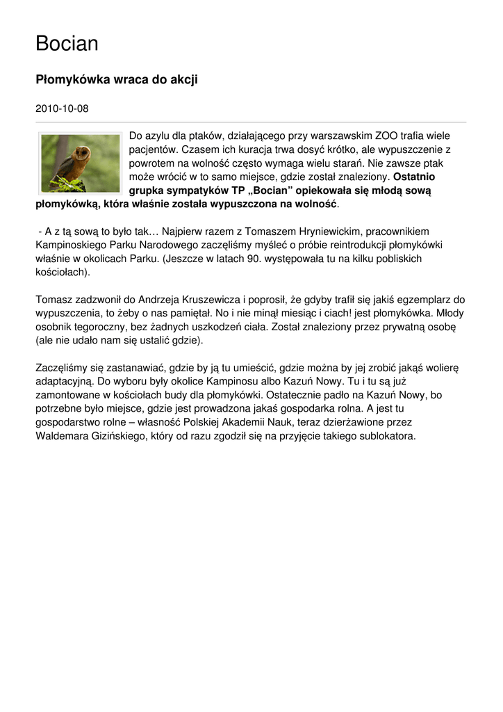 Bocian Płomykówka wraca do akcji 2010-10-08 Do azylu dla ptaków, działającego przy warszawskim ZOO trafia wiele pacjentów. Czasem ich kuracja trwa dosyć krótko, ale wypuszczenie z powrotem na wolność często wymaga wielu starań. Nie zawsze ptak może wrócić w to samo miejsce, gdzie został znaleziony. Ostatnio grupka sympatyków TP „Bocian” opiekowała się młodą sową płomykówką, która właśnie została wypuszczona na wolność. - A z tą sową to było tak… Najpierw razem z Tomaszem Hryniewickim, pracownikiem Kampinoskiego Parku Narodowego zaczęliśmy myśleć o próbie reintrodukcji płomykówki właśnie w okolicach Parku. (Jeszcze w latach 90. występowała tu na kilku pobliskich kościołach). Tomasz zadzwonił do Andrzeja Kruszewicza i poprosił, że gdyby trafił się jakiś egzemplarz do wypuszczenia, to żeby o nas pamiętał. No i nie minął miesiąc i ciach! jest płomykówka. Młody osobnik tegoroczny, bez żadnych uszkodzeń ciała. Został znaleziony przez prywatną osobę (ale nie udało nam się ustalić gdzie). Zaczęliśmy się zastanawiać, gdzie by ją tu umieścić, gdzie można by jej zrobić jakąś wolierę adaptacyjną. Do wyboru były okolice Kampinosu albo Kazuń Nowy. Tu i tu są już zamontowane w kościołach budy dla płomykówki. Ostatecznie padło na Kazuń Nowy, bo potrzebne było miejsce, gdzie jest prowadzona jakaś gospodarka rolna. A jest tu gospodarstwo rolne – własność Polskiej Akademii Nauk, teraz dzierżawione przez Waldemara Gizińskiego, który od razu zgodził się na przyjęcie takiego sublokatora. Teren dookoła znakomity: konie, hodowla świń, dookoła tereny rolne o mozaikowym charakterze, czyli trochę łąk, trochę zbóż, a do tego pola buraczane - więc git! No i co ważne, że tuż przy gospodarstwie jest pastwisko o powierzchni około 2 ha, gdzie pasie się kilkanaście koni. Generalnie pokarmu dla sowy w bród, a do tego w odległości około 300 metrów znajduje się kościół w Kazuniu Nowym, na którym jest zamontowana buda dla płomykówki. Od samego początku sprzyjało nam szczęście. Zaczęliśmy szukać na terenie gospodarstwa właściwego obiektu, czy też jego części, która nadawałaby się na pomieszczenie adaptacyjne. Ale nawet w najśmielszych oczekiwaniach nie przypuszczaliśmy, że znajdziemy tak idealną miejscówkę. Na strychu, który w latach 70. służył jako suszalnia dla ziół. Pomieszczenie odizolowane o powierzchni około 30 metrów kw. z wyjściem na szczyt budynku. W tymże pomieszczeniu zamontowaliśmy budę z wykutym przez ścianę wyjściem na zewnątrz. Wylot był wprost na tereny rolne, a dokładnie na owe pastwisko, na którym pasą się konie - więc po prostu ideał! Ten wylot na wolność na razie był oczywiście zamknięty. Drugi wylot w budzie prowadzi na strych. Wykonaliśmy odpowiednie prace dodatkowe - zrobiliśmy poprzeczki służące jako czatownie i miejsca odpoczynku. I zrobiliśmy zabezpieczenie przed kuną - stare, drewniane drzwi zastąpiliśmy nowymi, ażurowymi z ramy drewnianej, do której przymocowaliśmy siatkę metalową, aby płomykówka mogła stale widzieć co jest na zewnątrz. I obserwować swoje przyszłe terytorium. Rys. Emilia Grzędzicka Dokarmialiśmy ją codziennie. Norma to około 4 myszy, które były wypuszczane w pomieszczeniu do szczelnej skrzyni o wymiarach 2 x 2 metry. Gładkie i równe ścianki miały wysokość 60 cm, żeby żywe myszy nie mogły z niej wyjść. Sowa polowała na nie. Od początku dawaliśmy jej żywe myszy, żeby trenowała samodzielne zdobywanie pokarmu. Czasem, gdy nie było mysz dawaliśmy jej martwego szczura. Myszy były z reguły kupowane. Czasem tylko udało się złapać jakąś w żywołapkę. Sowa przyjechała do nas 31 lipca 2010r. a została wypuszczona 24 września 2010 roku, czyli była u nas prawie dwa miesiące. Od blisko dwóch tygodni jest na wolności i z ostatnich obserwacji wynika (z karmiska znowu zniknęły myszy), że jednak wraca w to swoje znane miejsce. Dalej więc będziemy dokarmiać ptaka, choć już nie w takich ilościach, aby nauczył się sam zdobywać pokarm w naturze. Istnieje duże prawdopodobieństwo, że sowa zainteresuje się budą zamocowaną w kościele. Choć my wciąż liczymy na to, że będzie wracała do swojej budy w pomieszczeniu adaptacyjnym. W tej chwili wygląda to tak, że sowa ma stale otwarty ten wykuty w ścianie otwór, który prowadzi do zamontowanej od wewnątrz budy, a przez nią może też wchodzić do pomieszczenia adaptacyjnego i polować na myszy w skrzyni. Będziemy obserwować co się z nią dzieje. Czas pokaże co z tego wyjdzie - decydująca będzie najtrudniejszy okres, czyli zima i wiosna. Ważna jest też płeć sowy - jeśli jest to samiec szanse, że zostanie znacznie wzrastają, a jeśli samica - to może być różnie. Wysłuchał opowieści i usiłował sfotografować dziarską rekonwalescentkę: Arkadiusz Szaraniec Rysunek płomykówki - Emilia Grzędzicka www.emilia.webd.pl Portret płomykówki wykonał Łukasz Łukasik, prezes Związku Polskich Fotografików Przyrody www.zpfp.pl