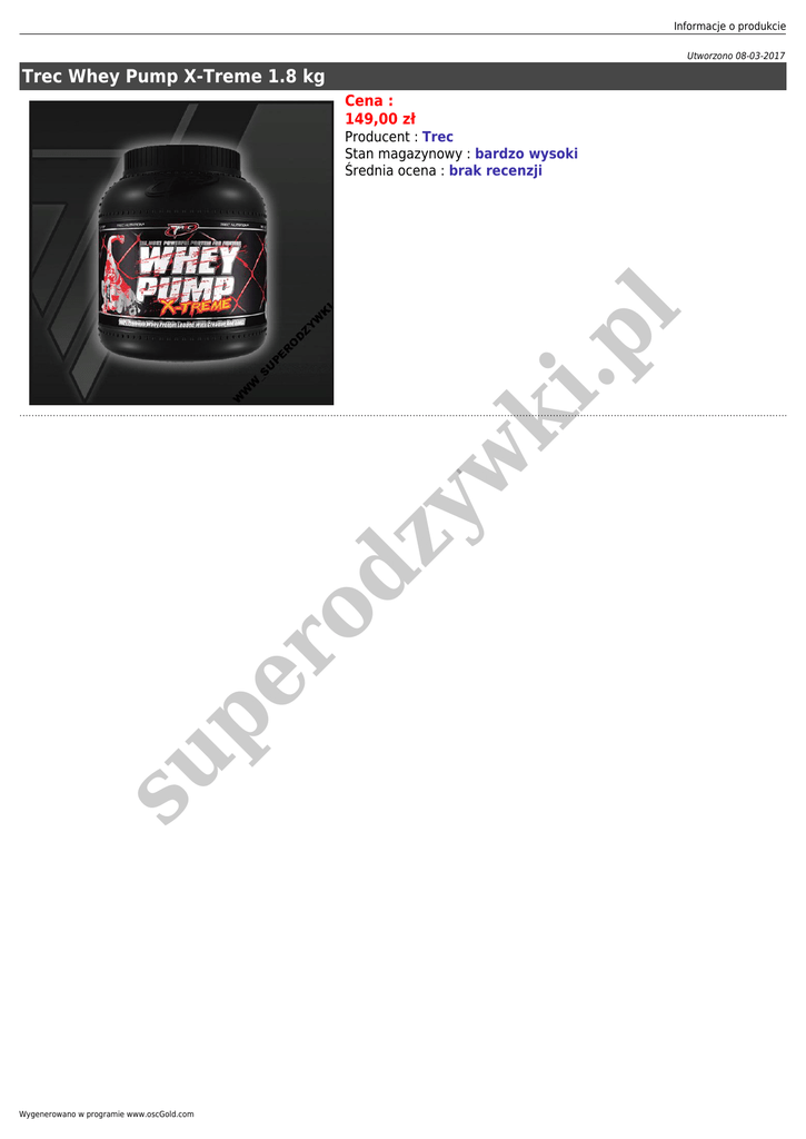 Informacje o produkcie Utworzono 08-03-2017 Trec Whey Pump X-Treme 1.8 kg Cena : 149,00 zł ki .p l Producent : Trec Stan magazynowy : bardzo wysoki Średnia ocena : brak recenzji pe ro dz y w EY PUMP X-TREME to najwyższej jakości koncentrat białek serwatkowych wzbogacony w dużą dawkę kreatyny i argininy. Jest to pierwszy preparat białkowy na rynku, w którym dodatkowo zastosowano podwójną formułę wzrostową pod postacią bardzo silnie działających aminokwasów anabolicznych. Dzięki unikalnemu połączeniu najwyższej jakości białka serwatkowego z silnymi stymulatorami syntezy białek, preparat WHEY PUMP X-TREME charakteryzuje się bardziej unikalnymi właściwościami ergogenicznymi w porównaniu z tradycyjnymi odżywkami białkowymi. su Sposób użycia: Jednorazową porcję preparatu – 30 g (2 miarki) rozpuścić w 200 ml wody lub mleka, używając do tego szejkera lub miksera. W zależności od zapotrzebowania należy stosować 2–3 porcji dziennie. W dni treningowe: I porcja rano po przebudzeniu, II porcja do 1,5 godz. po treningu oraz III porcja przed snem. W dni nietreningowe: I porcja rano po przebudzeniu, II porcja pomiędzy posiłkami oraz III porcja przed snem. Produkt zawiera dodatek technologiczny lecytyny sojowej, która korzystnie wpływa na jego rozpuszczalność i konsystencję. Substancja ta jest naturalnym źródłem choliny i inozytolu – fosfolipidów Wygenerowano w programie www.oscGold.com su pe ro dz y w ki .p l pełniących funkcje neuroprzekaźników i budujących struktury błon komórkowych m.in. w obrębie układu nerwowego. Lecytyna sojowa posiada także właściwości lipotropowe – rozbija cząsteczki tłuszczu, co przyspiesza ich transport i spalanie. Lecytyna może korzystnie wpływać na pamięć i koncentrację oraz ułatwiać kontrolę wagi ciała i utrzymanie właściwego profilu lipidowego krwi.