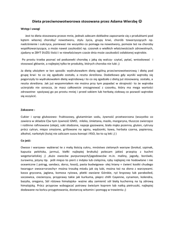 Dieta przeciwnowotworowa stosowana przez Adama Wierzbę Wstęp i uwagi Jest to dieta stosowana przeze mnie, jednak zalecam dokładne zapoznanie się z produktami pod kątem własnej choroby/ nowotworu, stylu życia, grupy krwi, chorób towarzyszących np. nadciśnienie i cukrzyca, ponieważ nie wszystko co pomaga na nowotwory, pomoże też na choroby współtowarzyszące, a może nawet zaszkodzić np. czosnek o wielkich właściwościach zdrowotnych, zjadany w ZBYT DUŻEJ ilości i w niewłaściwym czasie dnia może zaszkodzić osłabionej wątrobie. Po prostu trzeba poznać od podszewki chorobę z jaką się walczy- czytać, pytać, wnioskować i stosować głównie, a najlepiej tylko te produkty, których choroba nie lubi ;) Ja dietę ułożyłem w ten sposób: wydrukowałem dietę ogólną przeciwnowotworową i dietę pod grupę krwi- to co się zgadzało zostało, a reszta skreślona. Dodatkowo gdy wyniki wątroby się pogorszyły to wydrukowałem dietę wątrobową i to co się zgadzało z dietą już stosowaną zostało, a reszta skreślona. Jak już wspomniałem nie można przy tym popadać w skrajność- to że wątroba ucierpiała nie oznacza, że masz całkowicie zrezygnować z czosnku, który ma mega wartości zdrowotne- spożywaj go po prostu mniej i przed sokiem lub herbatą ziołową co pozwoli wątrobie się oczyścić. Zakazane : Cukier i syrop glukozowo- fruktozowy, glutaminian sodu, żywność przetworzona (wszystko co zawiera w składzie E)w tym żywność GMO, mleko, śmietana, masło, margaryna, tłuszcze zwierzęce i roślinne rafinowane (oleje), soki słodzone, napoje gazowane, biała mąka pszenna, gluten, cytrusy prócz cytryn, mięso smażone, grillowane na ogniu, wędzonki, kawa, herbata czarna, papierosy, alkohol, narkotyki (tutaj nie zaliczam suszu konopi i RSO, bo to są leki ;) ) Co jeść: Owoce i warzywa- wybierać te z małą ilością cukru, mnóstwo zielonych warzyw (brokuł, szpinak, kapusta pekińska, jarmuż, kiełki najlepiej brokułu) polecam jakieś przepisy z kuchni wegetariańskiej ;) ,dużo owoców purpurowych/jagodowców m.in. maliny, jagody, borówki, żurawina, jeżyny itp. jeśli mięso to pierś z indyka lub cielęcina, ryby najlepiej nie hodowlane i nie oceaniczne ( pstrąg, sandacz, dorsz, łosoś), pasta budwigowa- olej lniany + ćwierć kostki chudego twarogu+ owoce+orzechy+ można troszkę miodu jak się lubi, można też na słono z warzywami. kasza gryczana, jaglana, komosa ryżowa, płatki owsiane Górskie, ryż brązowy lub paraboiled, soczewica, ciecierzyca, przyprawy takie jak kurkuma, pieprz chilli Cayenne, cynamon, kolendra, bazylia, oregano, Sól różowa himalajska- ważne aby zamienić sól białą kuchenną na tą zdrową himalajską. Prócz przypraw wzbogacać potrawy świeżym koprem lub natką pietruszki, najlepiej dodawane na końcu przygotowania, dostarczą witamin i pomogą w trawieniu ;) Do picia: Woda niegazowana, żywa woda alkaliczna, sok z aceroli (rano i wieczorem) ,granatu, acai, gojimożna włączyć olej z pestek moreli gorzkich, jednak powinien być stosowany w sporej odległości po i przed spożyciem produktów z dużą ilością witaminy C w tym soków, soki warzywno-owocowe nawet 3 razy dziennie ( burak+marchew+jabłko+ pół cytryny)- do soku dodawałem zmielony uprzednio w młynku ostropest plamisty lub siemię lniane i sok z trawy pszenicznej, herbata imbirowa z cytryną i miodem ( 5 plastrów imbiru+ pół cytryny+ miód lipowy lub gryczany), zielona herbata, herbaty ziołowe, oczyszczające organizm- NIE przeczyszczające ;), Info dla pacjentów RSO-Olej RSO zażywałem 3 razy w ciągu dnia w godzinach 8, 15 i przed 22, stąd śniadanie i obiad umieszczone przed zażyciem LEKU! Mój przykładowy dzień diety: 7.30 szklanka wody letniej przegotowanej lub żywej wody alkalicznej np. Redox + 30ml soku z aceroli+ pół cytryny 7.45- 1 śniadanie: namoczone płatki górskie+ banan+ kiwi+orzechy+ słonecznik+olej lniany (jeśli sezon to truskawki, maliny….) bądź Pasta Budwigowa na kanapki. 10-10.30- 2 śniadanie- sałatka warzywna- kolorowa lub zielona ;) lub 3-4 kanapki (chleb robiony w domu, z dużą ilością słonecznika, płatków owsianych, siemienia lnianego, pestek dyni) BEZ masła, z sałatą np. ser dobrej jakości najlepiej biały + pomidor+ szczypior bądź cebula+ sól himalajska+ pieprz ziołowy lub młotkowany z kolendrą 14-14.30 obiad- danie wegetariańskie lub ryba lub mięso- jeśli mięso to z dodatkiem ryżu lub kaszy i sporo warzyw. Jeśli chodzi o mięso to przygotowuję na parze lub w piekarniku w pergaminiefoliom plastikowym nie ufam ;p 17-17.30- podwieczorek- lekka przekąska np. miseczka orzechów (laskowe+ włoskie+nerkowiec), może być naleśnik orkiszowy z pastą budwigową jeśli rano były płatki. Tutaj uwaga dla osób z problemami z cukrem- część bakalii podbija cukier wieczorem więc trzeba uważać na to co spożywamy wieczorem- więcej warzyw, a ograniczyć owoce do minimum! 19-19.30 kolacja- lekki posiłek w ramach diety, który strawi się nim pójdziemy spać po 21-22. Dodatkowo w ciągu dnia pomiędzy posiłkami soki samorobne, herbata imbirowa i wspomagające oczyszczanie i trawienie np. mięta+rumianek. Ja również wysiewałem kiełki brokułu i lucerny, a dodatkowo sadziłem trawę pszeniczną i robiłem z niej sok, który dodawałem do soku owocowo-warzywnego. Nie można też zapominać o sporcie- polecam wysiłki aerobowe: spacery,jazda na rowerze, nordic walking w spokojnym tempie, gimnastyka, joga, tai-chi itp. Smacznego- życzę witalności, pogody ducha, wiary, wytrwałości i sukcesów ;)