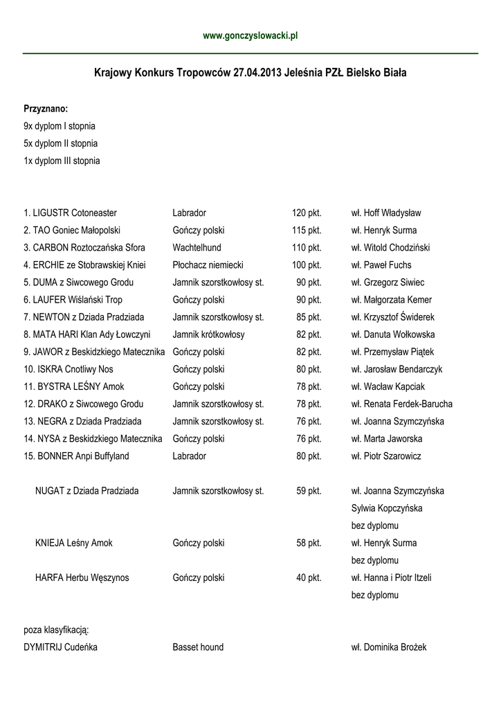 www.gonczyslowacki.pl Krajowy Konkurs Tropowców 27.04.2013 Jeleśnia PZŁ Bielsko Biała Przyznano: 9x dyplom I stopnia 5x dyplom II stopnia 1x dyplom III stopnia 1. LIGUSTR Cotoneaster Labrador 120 pkt. wł. Hoff Władysław 2. TAO Goniec Małopolski Gończy polski 115 pkt. wł. Henryk Surma 3. CARBON Roztoczańska Sfora Wachtelhund 110 pkt. wł. Witold Chodziński 4. ERCHIE ze Stobrawskiej Kniei Płochacz niemiecki 100 pkt. wł. Paweł Fuchs 5. DUMA z Siwcowego Grodu Jamnik szorstkowłosy st. 90 pkt. wł. Grzegorz Siwiec 6. LAUFER Wiślański Trop Gończy polski 90 pkt. wł. Małgorzata Kemer 7. NEWTON z Dziada Pradziada Jamnik szorstkowłosy st. 85 pkt. wł. Krzysztof Świderek 8. MATA HARI Klan Ady Łowczyni Jamnik krótkowłosy 82 pkt. wł. Danuta Wołkowska 9. JAWOR z Beskidzkiego Matecznika Gończy polski 82 pkt. wł. Przemysław Piątek 10. ISKRA Cnotliwy Nos Gończy polski 80 pkt. wł. Jarosław Bendarczyk 11. BYSTRA LEŚNY Amok Gończy polski 78 pkt. wł. Wacław Kapciak 12. DRAKO z Siwcowego Grodu Jamnik szorstkowłosy st. 78 pkt. wł. Renata Ferdek-Barucha 13. NEGRA z Dziada Pradziada Jamnik szorstkowłosy st. 76 pkt. wł. Joanna Szymczyńska 14. NYSA z Beskidzkiego Matecznika Gończy polski 76 pkt. wł. Marta Jaworska 15. BONNER Anpi Buffyland Labrador 80 pkt. wł. Piotr Szarowicz Jamnik szorstkowłosy st. 59 pkt. wł. Joanna Szymczyńska NUGAT z Dziada Pradziada Sylwia Kopczyńska bez dyplomu KNIEJA Leśny Amok Gończy polski 58 pkt. wł. Henryk Surma bez dyplomu HARFA Herbu Węszynos Gończy polski 40 pkt. wł. Hanna i Piotr Itzeli bez dyplomu poza klasyfikacją: DYMITRIJ Cudeńka Basset hound wł. Dominika BroŜek
