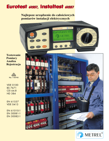 Eurotest 61557, Instaltest 61557 Najlepsze urządzenie do całościowych pomiarów instalacji elektrycznych Testowanie Pomiary Analiza Rejestracja No. 118740 VDE 0100 BS 7671 CEI 64.8 HD 384 EN 61557 VDE 0413 EN 61010-1 EN 50081-1 EN 50082-1 Instaltest 61557 No. 118740 Duży wyświetlacz z podświetleniem oferuje wyraźny odczyt w każdych warunkach Rezystancja pętli zwarcia EN 61557-6 (bez wyzwalania RCD) Rezystancja linii i Ipsc EN 61557-3 (systemy zasilania 115/230 V) Rezystancja pętli zwarcia i Ipsc EN 61557-3 (systemy zasilania 115/230 V) Całkowicie bezpieczne pomiary nisko-napięciowych instalacji elektrycznych, zgodnie z EN 61557 Szeroki zakres podfunkcji i testów, zapewnia proste utrzymanie i szybkie wykrywanie i usuwanie usterek Wtyczka i końcówka commander umożliwia obsługę jedną ręką (pomiary i przechowywanie wyników) Wysoka odporność na wejściowe stany przejściowe dzięki unikatowej wejściowej ochronie hardware PC SW Instal Link zapewnia proste i przejrzyste przenoszenie wyników pomiarów (tylko Instaltest) Dokładne graficzne menu Pomocy zapewnia schematy połączeniowe do każdego pomiaru (tylko Eurotest) Unikatowy PC SW Euro Link – Pro wspiera całą procedurę pomiarową (tylko Eurotest) Rozszerzone pomiary rezystancji uziemienia (tylko Eurotest) Aktualizacja przez Internet (tylko Eurotest) Pięć opatentowanych rozwiązań! Rejestracja napięcia (Rejestracja napięcia przez określony przedział czasu, rejestracja wolnych stanów przejściowych) Inne funkcje (Patrz Eurotest) Eurotest 61557 Impedancja linii i Ipsc EN 61557-3 (systemy zasilania 115/230/400 V) Rezystancja pętli N-PE/uziemienia i Ipsc (Wewnętrzne napięcie pomiarowe,bez wyzolenia RCD) Impedancja pętli zwarcia i Ipsc EN 61557-3 Napięcie dotykowe przy Ipsc – SEV 3569 (skuteczność dodatkowego wyrównywania) No. 118740 NO W Y Sonda PE (Odwrotne przewodniki L i PE) Duży graficzny wyświetlacz z podświetleniem prowadzi operatora przez pomiary Kompleksowa analiza RCD EN 61557-6 (Test automatyczny, bez lub z sondą, rezystancja pętli zwarcia bez wyzwalania RCD) Lokalizator bezpieczników/ usterek/ kabli (Umożliwia wykrywanie i usuwanie usterek oraz detekcj ę poszczególnych części instalacji) Kierunek wirowania faz EN 61557-7 Moc W, VA, Var, cosφ, Energia (Prąd TRMS, napięcie TRMS) Do 21. harmonicznej napięcia i prądu (Jakość energii elektrycznej) SPECYFIKACJA TECHNICNZA Eurotest 61557/ Instaltest 61557 Rezystancja izolacji Zakres wyświetlania 0 – 1000 M Ω (Un≥250 V) 0 – 200 MΩ (Un<250 V) Rozdzielczość 0.001 0.01 0.1 1 M Ω Dokładność ±(2 % + 2 D)…(0 – 200 MΩ) 50 100 250 500 1000 V Napięcie pomiarowe >1 mA Zdolność prądowa generatora Lokalizator bezpieczników/ usterek/ kabli Urządzenie jako generator Lokalizacja Ciągłość przewodników ochronnych (pojedynczy pomiar) Zakres wyświetlania 0.00 – 19.99 20.0 – 199.9 200 - 2000 Ω Dokładność ±(2 % + 2 D)….(0 – 20 Ω) Napięcie pomiarowe na otwartych zaciskach 4 – 7 Vd.c. >200 mA Prąd pomiarowy Kompensacja przewodów pomiarowych tak tak Automatyczna zamiana polaryzacji Ciągłość (ciągły pomiar) 0.0 – 199.9 Ω Zakres wyświetlania Dokładność Zwarciowy prąd pomiarowy Napięcie pomiarowe na otwartych zaciskach 200 – 2000 Ω ±(3 % + 3 D) <7 mA 4 – 7 Vd.c. Rezystancja uziemienia (metoda czteroprzewodowa) 0 – 20 kΩ Zakres wyświetlania 0.01; 0.1; 1; 10 Ω Rozdzielczość ±(2 % + 3 D)…(0 – 2 kΩ) Dokładność podstawowa 40 V(d.c.) / 125 Hz / przebieg sinusoidalny Napięcie pomiarowe Zwarciowy prąd pomiarowy <20 mA tak Auto. pomiar rezystancji sondy prądowej i napięciowej Rezystancja uziemienia (metoda czteroprzewodowa + cęgi) Patrz charakterystyki pod metoda czteroprzewodowa Pomiary rezystancji zwarcia bez użycia elektrod pomocniczych Rezystancja uziemienia EN 61557-5 Metoda 4-zaciskowa 2-elektrodowa Metoda jedno cęgowa (Żadnych rozłączeń zardzewiałych połączeń) Metoda dwu cęgowa (Bez elektrodowa, do zastosowania w mieście) Rezystancja gruntu EN 61557-5 Ciągłość przewodów ochronnych EN 61557-4 (do 2 kOhm) Ciągłość (funkcja ciągła) (Niski prąd pomiarowy dla diod i inne szybkie testy) Sonda luksometryczna Rezystancja izolacji EN 61557-2 (Napięcia pomiarowe 50, 100, 250, 500 i 1000 V) Warystorowe urządzenia przepięciowe – U przebicia (Stromość napięcia 500 V/s, prąd progowy 1 mA) Wejście sensorowe (Pomiar natężenia oświetlenia i inne) Rezystancja uziemienia (pomiar 2 cęgowy) Zakres wyświetlania 0 – 19.99 Ω Dokładność podstawowa ±(10 % + 2D) 20.0 – 100.0 Ω ±(20 %) Rezystancja gruntu Zakres wyświetlania Obliczenia Odległość pomiędzy elektrodami pomiarowymi 0 – 2000 kΩm ρ = 2 πaRe 1 – 30 m Wyłączniki różnicowoprądowe RCD Znam. prąd pomiarowy 10; 30; 100; 300; 500; 1000 mA (0 or 180 °C) AC, standardowy, selektywny Typ RCD RCD – napięcie dotykowe Zakres wyświetlania 0.00 – 9.99 10.0 – 100 V Rozdzielczość 0.01 0.1 V (-0 / +10) % ± 0.2 V (-0 / +10) % Dokładność podstawowa Prąd pomiarowy <0.5 I ∆N Instaltest 61557 Eurotest 61557 A 1102 Prąd TRMS (Brak potrzeby znajomości kształtu przebiegu) Prąd szczytowy (Do pomiaru, np. prądów rozruchowych) Prąd/ Napięcie Adapter trójfazowy A 1111 Kabel trójfazowy A 1110 Końcówka Commander A 1002 Wtyczka Commander A 1001 Lokalizator bezpieczników/usterek/kabli A 1005 RCD – Rezystancja uziemienia/pętli Zasada pomiaru Zakres wyświetlania RCD – czas wyzwalania Zakres wyświetlania (typ standardowy) z lub bez sondy 0 – 10 kΩ Prąd szczytowy Zakres wyświetlania Dokładność podstawowa 5 – 280 A ±(5 %) 0 – 300 ms (0.5 I ∆N, I∆N) 0 – 150 ms (2 I∆N) 0 – 40 ms (5 I∆N) Zakres wyświetlania (typ selektywny) 0 – 500 ms (0.5 I ∆N, I∆N) 0 – 200 ms (2 I ∆N) 0 – 150 ms (5 I ∆N) Dokładność ±3 ms Warystorowe ochronniki przepięciowe – napięcie przebicia stromość napięcia DC (500 V/s) Zasada pomiaru 50 – 1000