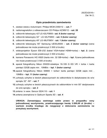 25/ZO/2016 r Zał. Nr 2, Opis przedmiotu zamówienia 1. zestaw wieża z kolumnami Philips MCM 2350/12 – szt. 7 2. radiomagnetofon z odtwarzaczem CD Philips AZ385/12 – szt. 28 3. odbiornik telewizyjny 42’’LG 42LF5800– szt. 6 (kolor czarny) 4. odbiornik telewizyjny 32’’ LG 32LF5800 – szt. 5 (kolor czarny) 5. odbiornik telewizyjny 49” LG 49LF590V - szt. 1 (kolor czarny) 6. odbiornik telewizyjny 55” Samsung UE55J5500 – szt. 2 (kolor czarny) (cena jednostkowa nie może przekroczyć 3 500 zł brutto) 7. wideoprojektor Epson EB-U32 (kabel VGA+kabel HDMI+torba) – kpl. 2; (cena jednostkowa nie może przekroczyć 3 500 zł brutto) 8. kamera Panasonic HC-X920 (karta min. 32 GB+torba) – kpl. 1(cena jednostkowa nie może przekroczyć 3 500 zł brutto) 9. aparat fotograficzny Nikon D5200+obiektyw 18-105 G ED VR + torba + karta pamięci 32GB zapis min . 10MB/s – kpl. 1 (kolor czarny) 10. aparat fotograficzny Nikon S9900 + torba+ karta pamięci 32GB zapis min . 10MB/s – kpl. 11 (kolor czarny) 11. uchwyty uchylne w dwóch płaszczyznach do odbiorników tv dedykowane do w/w sprzętu 32” -50” – szt. 7 12. uchwyty uchylne w dwóch płaszczyznach do odbiorników tv min 55” dedykowane do w/w sprzętu – szt. 2 13. antena tv wew. Sencor SDA110 – szt. 1 14. antena zewnętrzna tv Opticum Sparta 3D – szt. 4 UWAGA: Zamawiający zastrzega sobie prawo w przypadku ceny jednostkowej asortymentu, przekraczającego kwotę 3.500,00 zł (brutto) – wartość środka trwałego do rezygnacji z dokonania zamówienia na powyższy asortyment. str. 1/1