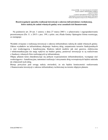ZAŁĄCZNIK Nr 3 do Uchwały Nr X/54/2015 RADY GMINY OPINOGÓRA GÓRNA z dnia 01.10.2015 w sprawie sporządzenia miejscowego planu zagospodarowania przestrzennego gminy Opinogóra Górna dla fragmentu miejscowości Władysławowo I. Rozstrzygnięcie sposobu realizacji inwestycji z zakresu infrastruktury technicznej, które należą do zadań własnych gminy oraz zasadach ich finansowania Na podstawie art. 20 ust. 1 ustawy z dnia 27 marca 2003 r. o planowaniu i zagospodarowaniu przestrzennym (Dz. U. z 2015 r. poz. 199, z późn. zm.) Rada Gminy Opinogóra Górna rozstrzyga, co następuje: Wydatki związane z realizacją inwestycji z zakresu infrastruktury należą do zadań własnych gminy. Zakres wydatków na infrastrukturę obejmuje: budowę dróg, zaopatrzenie terenów funkcjonalnych w sieć wodociągową i kanalizacyjną. Budowa takich mediów jak sieć gazowa, elektryczna i telekomunikacyjna nie mają wpływu na budżet gminy, ponieważ inwestycje te są realizowane z funduszy własnych firm realizujących tę infrastrukturę. Objęty planem teren charakteryzuje się pełnym wyposażeniem infrastrukturalym, występuje sieć wodociągowo - kanalizacyjna, natomiast realizacja i utrzymanie dróg wewnętrznych będzie należała do właścicieli tych dróg. Biorąc powyższe pod uwagę należy stwierdzić, że nie będzie konieczności realizowania i finansowania inwestycji z zakresu infrastruktury technicznej na terenie objętym planem. ZAŁĄCZNIK Nr 3 1/1