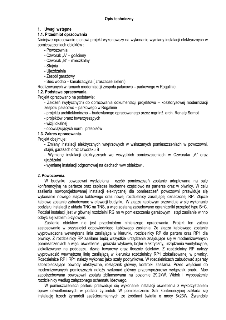 Opis techniczny 1. Uwagi wstępne 1.1. Przedmiot opracowania Niniejsze opracowanie stanowi projekt wykonawczy na wykonanie wymiany instalacji elektrycznych w pomieszczeniach obiektów : - Powozownia - Czworak „A” – gościnny - Czworak „B” – mieszkalny - Stajnia - Ujeżdżalnia - Zespół garażowy - Sieć wodno – kanalizacyjna ( zraszacze zieleni) Realizowanych w ramach modernizacji zespołu pałacowo – parkowego w Rogalinie. 1.2. Podstawa opracowania. Projekt opracowano na podstawie: - Założeń (wytycznych) do opracowania dokumentacji projektowo – kosztorysowej modernizacji zespołu pałacowo – parkowego w Rogalinie - projektu architektoniczno – budowlanego opracowanego przez mgr inż. arch. Renatę Sarnot - projektów branż towarzyszących - wizji lokalnej - obowiązujących norm i przepisów 1.3. Zakres opracowania. Projekt obejmuje: - Zmiany instalacji elektrycznych wnętrzowych w wskazanych pomieszczeniach w powozowni, stajni, garażach oraz czworaku B - Wymianę instalacji elektrycznych we wszystkich pomieszczeniach w Czworaku „A” oraz ujeżdżalni - wymianę instalacji odgromowej na dachach w/w obiektów . 2. Powozownia. W budynku powozowni wydzielona część pomieszczeń zostanie adaptowana na salę konferencyjną na parterze oraz zaplecze kuchenne częściowo na parterze oraz w piwnicy. W celu zasilenia nowoprojektowanej instalacji elektrycznej dla pomieszczeń powozowni przewiduje się wykonanie nowego złącza kablowego oraz nowej rozdzielnicy zasilającej oznaczonej RP. Złącze kablowe zostanie zabudowane w elewacji budynku. W złączu kablowym przewiduje w się wykonanie podziału instalacji z układu TNC na TNS, a więc zostaną zabudowane ograniczniki przepięć typu B+C. Podział instalacji jest w głównej rozdzielni RG nn w pomieszczeniu garażowym i stąd zasilanie winno odbyć się kablem 5-żyłowym. Zasilanie obiektów nie jest przedmiotem niniejszego opracowania. Projekt ten zaleca zastosowanie w przyszłości odpowiedniego kablowego zasilania. Ze złącza kablowego zostanie wyprowadzona wewnętrzna linia zasilająca w kierunku rozdzielnicy RP dla parteru oraz RP1 dla piwnicy. Z rozdzielnicy RP zasilane będą wszystkie urządzenia znajdujące się w modernizowanych pomieszczeniach a więc: oświetlenie , gniazda wtykowe, bojler elektryczny, urządzenia wentylacyjne, zlokalizowane na poddaszu, dźwig towarowy oraz tłocznie ścieków. Z rozdzielnicy RP należy wyprowadzić wewnętrzną linię zasilającą w kierunku rozdzielnicy RP1 zlokalizowanej w piwnicy. Rozdzielnice RP i RP1 należy wykonać jako szafy podtynkowe. W rozdzielnicach zabudować aparaty zabezpieczające obwody elektryczne, rozłącznik główny, kontrolki zasilania. Przed wejściem do modernizowanych pomieszczeń należy wykonać główny przeciwpożarowy wyłącznik prądu. Moc zapotrzebowana powozowni została zbilansowana na poziomie 29,2kW. Widok i wyposażenie rozdzielnicy według załączonego schematu ideowego. W pomieszczeniach parteru przewiduje się wykonanie instalacji oświetlenia z wykorzystaniem opraw oświetleniowych w postaci żyrandoli. W pomieszczeniu Sali konferencyjnej zakłada się instalację trzech żyrandoli sześcioramiennych ze źródłami światła o mocy 6x23W. Żyrandole instalować do stropu właściwego stosując przedłużające oczka lub haczyki. Dodatkowo w pomieszczeniu zostanie zainstalowanych 8 kinkietów trójramiennych. W pomieszczeniu korytarza wejściowego zostanie zainstalowany żyrandol czteroramienny. W pozostały pomieszczeniach parteru (węzeł sanitarny, zaplecze kuchenne) przewiduje się instalowanie opraw oświetleniowych świetlówkowych. W pomieszczeniach zaplecza kuchni projektuje się oprawy instalowane nastropowo a w pomieszczeniach sanitarnych zabudowane w sufit podwieszany. Oświetlenie pomieszczeń piwnicznych zostanie wykonane w całości oprawami instalowanymi na stropie właściwym. Sterowanie oświetleniem zostanie wykonane poprze lokalne łączniki instalowane w pomieszczeniach oświetlanych. Instalację oświetlenia wykonać przewodami typu: YDYżo 3x1,5mm układanymi pod tynkiem. W pomieszczeniach piwnicznych przewiduje się wykonanie instalacji oświetlenia awaryjnego. Oświetlenie będzie działało po zaniku napięcia zasilania podstawowego. W projektowanych pomieszczeniach przewiduje się wykonanie instalacje gniazd wtykowych ogólnego przeznaczenia oraz dedykowanych do zasilania urządzeń kuchennych. Gniazda ogólnego przeznaczenia zostaną zainstalowane w sali konferencyjnej, komunikacji, łazienkach. Dla pomieszczeń kuchennych: zmywalni i przygotowania posiłków przewidziano oddzielne obwody zasilające. Gniazda wtykowe w tych pomieszczeniach instalować na poziomie 1,1m od posadzki pomieszczenia. Dla pomieszczeń kuchennych i łazienek projektuje się gniazda wtykowe o stopniu ochrony IP44. W łazienkach gniazda instalować na poziomie 1,3m od posadzki. Instalację gniazd wtykowych wykonać przewodami typu YDYżo 3x2,5mm układanymi pod tynkiem. Przewody układać zawsze prostopadle i równolegle do krawędzi ścian i stropów. Obwody gniazd wtykowych zabezpieczono wyłącznikami nadprądowymi i różnicowoprądowymi. Na poddaszu powozowni zostaną zainstalowane urządzenia wentylacyjne. Zasilanie urządzeń wykonać z rozdzielnicy RP. Układy sterowania urządzeń wentylacyjnych dostarczane są wraz z urządzeniami. Urządzenia wentylacyjne muszą posiadać wyłączniki serwisowe, zaleca się stosowanie urządzeń z wyłącznikami zintegrowanymi. Na poddaszu należy wykonać instalację oświetlenia. Poza urządzeniami wentylacyjnymi w pomieszczeniach zainstalowano dwie tłocznie ścieków, bojlery elektryczne oraz dźwig towarowy. Zasilanie wszystkich tych urządzeń wykonać z rozdzielnicy PR lub RP1 indywidualnymi przewodami zasilającymi. Przewody układać pod tynkiem. Układy sterowania dźwigu i tłoczni dostarczane wraz z urządzeniem. Instalacja odgromowa Dla budynku powozowni zadani