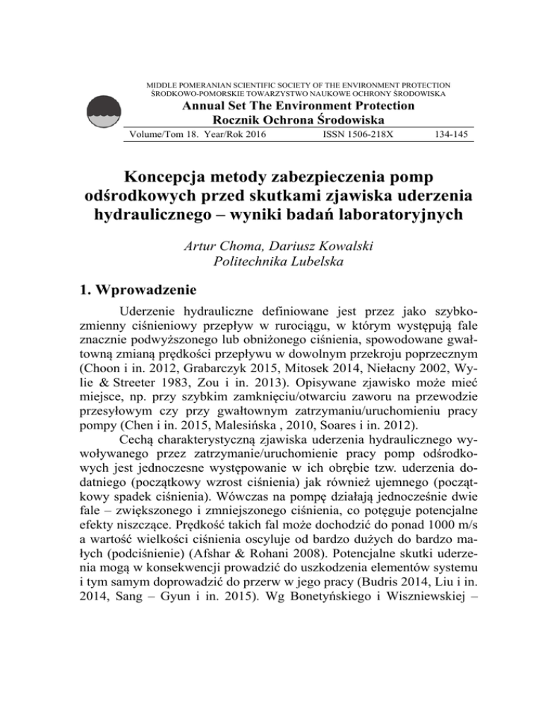 MIDDLE POMERANIAN SCIENTIFIC SOCIETY OF THE ENVIRONMENT PROTECTION ŚRODKOWO-POMORSKIE TOWARZYSTWO NAUKOWE OCHRONY ŚRODOWISKA Annual Set The Environment Protection Rocznik Ochrona Środowiska Volume/Tom 18. Year/Rok 2016 ISSN 1506-218X 134-145 Koncepcja metody zabezpieczenia pomp odśrodkowych przed skutkami zjawiska uderzenia hydraulicznego – wyniki badań laboratoryjnych Artur Choma, Dariusz Kowalski Politechnika Lubelska 1. Wprowadzenie Uderzenie hydrauliczne definiowane jest przez jako szybkozmienny ciśnieniowy przepływ w rurociągu, w którym występują fale znacznie podwyższonego lub obniżonego ciśnienia, spowodowane gwałtowną zmianą prędkości przepływu w dowolnym przekroju poprzecznym (Choon i in. 2012, Grabarczyk 2015, Mitosek 2014, Niełacny 2002, Wylie & Streeter 1983, Zou i in. 2013). Opisywane zjawisko może mieć miejsce, np. przy szybkim zamknięciu/otwarciu zaworu na przewodzie przesyłowym czy przy gwałtownym zatrzymaniu/uruchomieniu pracy pompy (Chen i in. 2015, Malesińska , 2010, Soares i in. 2012). Cechą charakterystyczną zjawiska uderzenia hydraulicznego wywoływanego przez zatrzymanie/uruchomienie pracy pomp odśrodkowych jest jednoczesne występowanie w ich obrębie tzw. uderzenia dodatniego (początkowy wzrost ciśnienia) jak również ujemnego (początkowy spadek ciśnienia). Wówczas na pompę działają jednocześnie dwie fale – zwiększonego i zmniejszonego ciśnienia, co potęguje potencjalne efekty niszczące. Prędkość takich fal może dochodzić do ponad 1000 m/s a wartość wielkości ciśnienia oscyluje od bardzo dużych do bardzo małych (podciśnienie) (Afshar & Rohani 2008). Potencjalne skutki uderzenia mogą w konsekwencji prowadzić do uszkodzenia elementów systemu i tym samym doprowadzić do przerw w jego pracy (Budris 2014, Liu i in. 2014, Sang – Gyun i in. 2015). Wg Bonetyńskiego i Wiszniewskiej – Koncepcja metody zabezpieczenia pomp odśrodkowych przed skutkami… 135 Oraczewskiej (2001) ok. 80% awarii występujących w przewodach dużych sieci wodociągowych nie wyposażonych w urządzenia zabezpieczające powstało w następstwie wystąpienia zjawiska uderzenia hydraulicznego. Co więcej zgodnie z badaniami Kwietniewskiego i Raka (2010) niemal 60% awarii pompowni wodociągowych w Polsce, w ostatnich 10 latach, związane było ze skutkami pojawiającego się tam uderzenia hydraulicznego. Na rynku instalacyjnym istnieje cały szereg metod zabezpieczania pomp odśrodkowych przed skutkami uderzenia hydraulicznego (Choma 2015a). Warto jednak zwrócić uwagę na fakt iż poza metodami związanymi z wydłużeniem czasu zatrzymania/uruchomienia wirnika nie działają one w sposób kompleksowy na ograniczenie pojawiającej się różnicy ciśnienia po obu stronach pompy jednocześnie. Wydaje się zatem, że warto poszukiwać innej, nowej metody zabezpieczenia pomp, działającej jednocześnie na stronę ssawną i tłoczną jednocześnie. Celem artykułu jest przedstawienie autorskiej koncepcji takiej metody, wraz z prezentacją wyników laboratoryjnych badań jej skuteczności. 2. Koncepcja proponowanej metody U podstaw proponowanej metody ograniczania skutków uderzenia hydraulicznego przy uruchomieniu lub zatrzymaniu pracy pomp odśrodkowych leżała obserwacja wykresów zmian ciśnienia po stronie ssawnej i tłocznej (rys. 1). Przy zatrzymaniu wirnika pompy po jej stronie ssawnej można zaobserwować tzw. dodatnie (początkowy wzrost ciśnienia), zaś po stronie tłocznej ujemne (początkowy spadek ciśnienia) uderzenia hydrauliczne. W przypadku uruchomienia wirnika pompy sytuacja jest odwrotna. W efekcie chwilowa różnica ciśnień po obu stronach pompy jest znacznie większa w momencie uruchomienia/zatrzymania niż w trakcie jej ustabilizowanej pracy. Jako cel podjętych badań postawiono wyrównanie powstającej różnicy ciśnień po obu stronach pompy jednocześnie w trakcie uruchomienia/zatrzymania pracy jej wirnika. Proponowana metoda polega na zastosowaniu obejścia pompy, wyposażonego w specjalizowany zawór regulujący ciśnienie – rys. 2. W momencie zatrzymania lub uruchomienia wirnika pompy zawór regulacyjny (5 – rys. 2) powinien być otwarty. Następnie powinien on być 136 Artur Choma, Dariusz Kowalski stopniowo zamykany aby, szczególnie w warunkach normalnej pracy pompy nie obniżać jej sprawności energetycznej. Otwarcie zaworu regulacyjnego powoduje przepływ wody przez obejście, w kierunku od strony ciśnienia wyższego do niższego, wyrównując jego poziom po obu stronach pompy. Wysokość ciśnienia Strona tłoczna Strona ssawna Zatrzymanie pracy pompy 0 Czas Rys.1. Przykładowy przebieg zmian ciśnienia po stronie ssawnej i tłocznej w momencie zatrzymania (po lewej) oraz uruchomienia wirnika pompy odśrodkowej (po prawej). 0 – moment zatrzymania/uruchomienia Fig.1. An example of the pressure changes on the suction and discharge side after the rotor stop (left) and start (right) of the centrifugal pump. 0 – time of the rotor stop/start moment Rys.2. Schemat układu ograniczania skutków uderzenia hydraulicznego opartego o wykorzystanie obejścia pompy. 1 – pompa, 2 – przewód ssawny, 3 – przewód tłoczny, 4 – obejście, 5 – zawór regulacyjny Fig.2. Scheme of the water hammer effects limitation method, basing on pump bypass implementation. 1 – pump, 2 – suction pipe, 3 – pipe, 4 – bypass, 5 – regulation valve To bardzo proste rozwiązanie komplikuje się w sytuacji zastosowania automatyki sterującej pracą zaworu regulacyjnego. Zawór regula- Koncepcja metody zabezpieczenia pomp odśrodkowych przed skutkami… 137 cyjny powinien się otwierać bardzo szybko w sytuacji zagrożenia uderzeniem. Można tu zastosować zawór elektromagnetyczny. Zawór taki charakteryzuje się możliwością bardzo szybkiego otwierania/zamykania. Do kontrolowania jego pracy konieczny jest jednak układ automatyki przemysłowej, zasilany energią elektryczną. W przypadku przerwy w jej do
