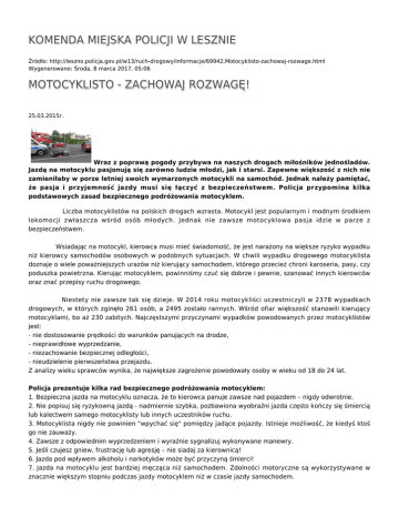 KOMENDA MIEJSKA POLICJI W LESZNIE Źródło: http://leszno.policja.gov.pl/w13/ruch-drogowy/informacje/69942,Motocyklisto-zachowaj-rozwage.html Wygenerowano: Środa, 8 marca 2017, 05:06 MOTOCYKLISTO - ZACHOWAJ ROZWAGĘ! 25.03.2015r. Wraz z poprawą pogody przybywa na naszych drogach miłośników jednośladów. Jazdą na motocyklu pasjonują się zarówno ludzie młodzi, jak i starsi. Zapewne większość z nich nie zamieniłaby w porze letniej swoich wymarzonych motocykli na samochód. Jednak należy pamiętać, że pasja i przyjemność jazdy musi się łączyć z bezpieczeństwem. Policja przypomina kilka podstawowych zasad bezpiecznego podróżowania motocyklem. Liczba motocyklistów na polskich drogach wzrasta. Motocykl jest popularnym i modnym środkiem lokomocji zwłaszcza wśród osób młodych. Jednak nie zawsze motocyklowa pasja idzie w parze z bezpieczeństwem. Wsiadając na motocykl, kierowca musi mieć świadomość, że jest narażony na większe ryzyko wypadku niż kierowcy samochodów osobowych w podobnych sytuacjach. W chwili wypadku drogowego motocyklista doznaje o wiele poważniejszych urazów niż kierujący samochodem, którego przecież chroni karoseria, pasy, czy poduszka powietrzna. Kierując motocyklem, powinniśmy czuć się dobrze i pewnie, szanować innych kierowców oraz znać przepisy ruchu drogowego. Niestety nie zawsze tak się dzieje. W 2014 roku motocykliści uczestniczyli w 2378 wypadkach drogowych, w których zginęło 261 osób, a 2495 zostało rannych. Wśród ofiar większość stanowili kierujący motocyklami, bo aż 230 zabitych. Najczęstszymi przyczynami wypadków powodowanych przez motocyklistów jest: - nie dostosowanie prędkości do warunków panujących na drodze, - nieprawidłowe wyprzedzanie, - niezachowanie bezpiecznej odległości, - nieudzielenie pierwszeństwa przejazdu. Z analizy wieku sprawców wynika, że największe zagrożenie powodowały osoby w wieku od 18 do 24 lat. Policja prezentuje kilka rad bezpiecznego podróżowania motocyklem: 1. Bezpieczna jazda na motocyklu oznacza, że to kierowca panuje zawsze nad pojazdem – nigdy odwrotnie. 2. Nie popisuj się ryzykowną jazdą - nadmiernie szybka, pozbawiona wyobraźni jazda często kończy się śmiercią lub kalectwem samego motocyklisty lub innych uczestników ruchu. 3. Motocyklista nigdy nie powinien "wpychać się" pomiędzy jadące pojazdy. Istnieje możliwość, że kiedyś ktoś go nie zauważy. 4. Zawsze z odpowiednim wyprzedzeniem i wyraźnie sygnalizuj wykonywane manewry. 5. Jeśli czujesz gniew, frustrację lub agresję – nie siadaj za kierownicą! 6. Jazda pod wpływem alkoholu i narkotyków może być przyczyną śmierci! 7. Jazda na motocyklu jest bardziej męcząca niż samochodem. Zdolności motoryczne są wykorzystywane w znacznie większym stopniu podczas jazdy motocyklem niż w czasie jazdy samochodem. 8. Kask ochronny, ochraniacze, odpowiednie buty i rękawice – zwiększą twoje bezpieczeństwo. 9. Od momentu kiedy wsiadasz na motocykl, koncentruj się wyłącznie na bezpiecznej jeździe. źródło KGP Ku przestrodze publikujemy zdjęcia pochodzące z wypadków motocyklowych. AKTUALNOSCI_2015/MARZEC/MOTORY Ocena: 0/5 (0) Tweetnij