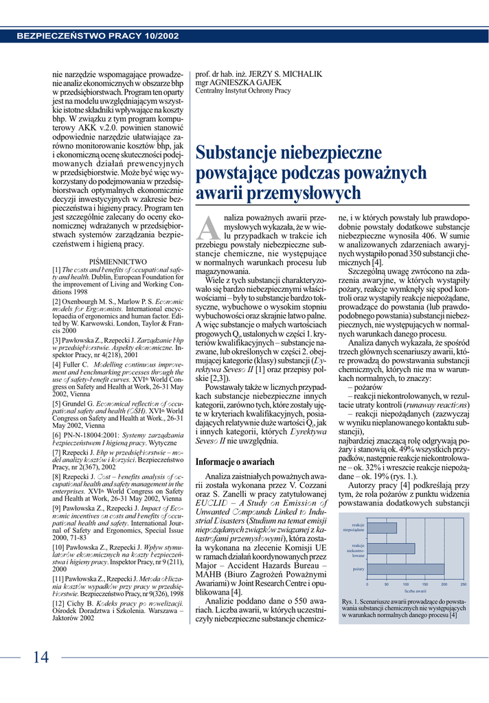 BEZPIECZEÑSTWO PRACY 10/2002 nie narzêdzie wspomagaj¹ce prowadzenie analiz ekonomicznych w obszarze bhp w przedsiêbiorstwach. Program ten oparty jest na modelu uwzglêdniaj¹cym wszystkie istotne sk³adniki wp³ywaj¹ce na koszty bhp. W zwi¹zku z tym program komputerowy AKK v.2.0. powinien stanowiæ odpowiednie narzêdzie u³atwiaj¹ce zarówno monitorowanie kosztów bhp, jak i ekonomiczn¹ ocenê skutecznoci podejmowanych dzia³añ prewencyjnych w przedsiêbiorstwie. Mo¿e byæ wiêc wykorzystany do podejmowania w przedsiêbiorstwach optymalnych ekonomicznie decyzji inwestycyjnych w zakresie bezpieczeñstwa i higieny pracy. Program ten jest szczególnie zalecany do oceny ekonomicznej wdra¿anych w przedsiêbiorstwach systemów zarz¹dzania bezpieczeñstwem i higien¹ pracy. PIMIENNICTWO [1] The costs and benefits of occupational safety and health. Dublin, European Foundation for the improvement of Living and Working Conditions 1998 [2] Oxenbourgh M. S., Marlow P. S. Economic models for Ergonomists. International encyclopaedia of ergonomics and human factor. Edited by W. Karwowski. London, Taylor & Francis 2000 [3] Paw³owska Z., Rzepecki J. Zarz¹dzanie bhp w przedsiêbiorstwie. Aspekty ekonomiczne. Inspektor Pracy, nr 4(218), 2001 [4] Fuller C. Modelling continuous improvement and benchmarking processes through the use of safety-benefit curves. XVIth World Congress on Safety and Health at Work, 26-31 May 2002, Vienna [5] Grundel G. Economical reflection of occupational safety and health (OSH). XVIth World Congress on Safety and Health at Work., 26-31 May 2002, Vienna [6] PN-N-18004:2001: Systemy zarz¹dzania bezpieczeñstwem I higien¹ pracy. Wytyczne [7] Rzepecki J. Bhp w przedsiêbiorstwie model analizy kosztów i korzyci. Bezpieczeñstwo Pracy, nr 2(367), 2002 [8] Rzepecki J. Cost benefits analysis of occupational health and safety management in the enterprises. XVIth World Congress on Safety and Health at Work, 26-31 May 2002, Vienna [9] Paw³owska Z., Rzepecki J. Impact of Economic incentives on costs and benefits of occupational health and safety. International Journal of Safety and Ergonomics, Special Issue 2000, 71-83 [10] Paw³owska Z., Rzepecki J. Wp³yw stymulatorów ekonomicznych na koszty bezpieczeñstwa i higieny pracy. Inspektor Pracy, nr 9 (211), 2000 [11] Paw³owska Z., Rzepecki J. Metoda obliczania kosztów wypadków przy pracy w przedsiêbiorstwie. Bezpieczeñstwo Pracy, nr 9(326), 1998 [12] Cichy B. Kodeks pracy po nowelizacji. Orodek Doradztwa i Szkolenia. Warszawa Jaktorów 2002 14 prof. dr hab. in¿. JERZY S. MICHALIK mgr AGNIESZKA GAJEK Centralny Instytut Ochrony Pracy Substancje niebezpieczne powstaj¹ce podczas powa¿nych awarii przemys³owych naliza powa¿nych awarii przemys³owych wykaza³a, ¿e w wielu przypadkach w trakcie ich przebiegu powsta³y niebezpieczne substancje chemiczne, nie wystêpuj¹ce w normalnych warunkach procesu lub magazynowania. Wiele z tych substancji charakteryzowa³o siê bardzo niebezpiecznymi w³aciwociami by³y to substancje bardzo toksyczne, wybuchowe o wysokim stopniu wybuchowoci oraz skrajnie ³atwo palne. A wiêc substancje o ma³ych wartociach progowych Qi, ustalonych w czêci 1. kryteriów kwalifikacyjnych substancje nazwane, lub okrelonych w czêci 2. obejmuj¹cej kategorie (klasy) substancji (Dyrektywa Seveso II [1] oraz przepisy polskie [2,3]). Powstawa³y tak¿e w licznych przypadkach substancje niebezpieczne innych kategorii, zarówno tych, które zosta³y ujête w kryteriach kwalifikacyjnych, posiadaj¹cych relatywnie du¿e wartoci Qi, jak i innych kategorii, których Dyrektywa Seveso II nie uwzglêdnia. Informacje o awariach Analiza zaistnia³ych powa¿nych awarii zosta³a wykonana przez V. Cozzani oraz S. Zanelli w pracy zatytu³owanej EUCLID A Study on Emission of Unwanted Compounds Linked to Industrial Disasters (Studium na temat emisji niepo¿¹danych zwi¹zków zwi¹zanej z katastrofami przemys³owymi), która zosta³a wykonana na zlecenie Komisji UE w ramach dzia³añ koordynowanych przez Major Accident Hazards Bureau MAHB (Biuro Zagro¿eñ Powa¿nymi Awariami) w Joint Research Centre i opublikowana [4]. Analizie poddano dane o 550 awariach. Liczba awarii, w których uczestniczy³y niebezpieczne substancje chemicz- ne, i w których powsta³y lub prawdopodobnie powsta³y dodatkowe substancje niebezpieczne wynosi³a 406. W sumie w analizowanych zdarzeniach awaryjnych wyst¹pi³o ponad 350 substancji chemicznych [4]. Szczególn¹ uwagê zwrócono na zdarzenia awaryjne, w których wyst¹pi³y po¿ary, reakcje wymknê³y siê spod kontroli oraz wyst¹pi³y reakcje niepo¿¹dane, prowadz¹ce do powstania (lub prawdopodobnego powstania) substancji niebezpiecznych, nie wystêpuj¹cych w normalnych warunkach danego procesu. Analiza danych wykaza³a, ¿e sporód trzech g³ównych scenariuszy awarii, które prowadz¹ do powstawania substancji chemicznych, których nie ma w warunkach normalnych, to znaczy: po¿arów reakcji niekontrolowanych, w rezultacie utraty kontroli (runaway reactions) reakcji niepo¿¹danych (zazwyczaj w wyniku nieplanowanego kontaktu substancji), najbardziej znacz¹c¹ rolê odgrywaj¹ po¿ary i stanowi¹ ok. 49% wszystkich przypadków, nastêpnie reakcje niekontrolowane ok. 32% i wreszcie reakcje niepo¿¹dane ok. 19% (rys. 1.). Autorzy pracy [4] podkrelaj¹ przy tym, ¿e rola po¿arów z punktu widzenia powstawania dodatkowych substancji reakcje niepo¿¹dane reakcje niekontrolowane po¿ary 0 50 100 150 200 250 liczba awarii Rys. 1. Scenariusze awarii prowadz¹ce do powstawania substancji chemicznych nie wystêpuj¹cych w warunkach normalnych danego procesu [4] BEZPIECZEÑSTWO PRACY 10/2002 lakierowanie, barwienie i powierzchniowe powlekanie reakcje niekontrolowane po¿ary 5 30 wêgiel (pierwiastek) i wêgiel (kopalny) elektroliza lakierowanie, barwienie i powierzchniowe powlekanie dodatki do ¿ywnoœci elektroliza fluorowce, alkalia, fosfor i siarka dodatki do ¿ywnoœci produkty przejœciowe