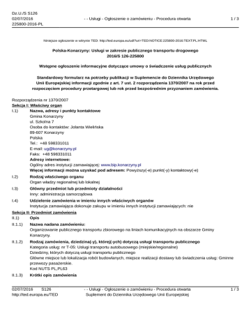 Dz.U./S S126 02/07/2016 225800-2016-PL - - Usługi - Ogłoszenie o zamówieniu - Procedura otwarta 1/3 Niniejsze ogłoszenie w witrynie TED: http://ted.europa.eu/udl?uri=TED:NOTICE:225800-2016:TEXT:PL:HTML Polska-Konarzyny: Usługi w zakresie publicznego transportu drogowego 2016/S 126-225800 Wstępne ogłoszenie informacyjne dotyczące umowy o świadczenie usług publicznych Standardowy formularz na potrzeby publikacji w Suplemencie do Dziennika Urzędowego Unii Europejskiej informacji zgodnie z art. 7 ust. 2 rozporządzenia 1370/2007 na rok przed rozpoczęciem procedury przetargowej lub rok przed bezpośrednim przyznaniem zamówienia. Rozporządzenia nr 1370/2007 Sekcja I: Właściwy organ I.1) Nazwa, adresy i punkty kontaktowe Gmina Konarzyny ul. Szkolna 7 Osoba do kontaktów: Jolanta Wielińska 89-607 Konarzyny Polska Tel.: +48 598331011 E-mail: [email protected] Faks: +48 598331011 Adresy internetowe: Ogólny adres instytucji zamawiającej: www.bip.konarzyny.pl Więcej informacji można uzyskać pod adresem: Powyższy(-e) punkt(-y) kontaktowy(-e) I.2) Rodzaj właściwego organu Organ władzy regionalnej lub lokalnej I.3) Główny przedmiot lub przedmioty działalności Inny: administracja samorządowa I.4) Udzielenie zamówienia w imieniu innych właściwych organów Instytucja zamawiająca dokonuje zakupu w imieniu innych instytucji zamawiających: nie Sekcja II: Przedmiot zamówienia II.1) Opis II.1.1) Nazwa nadana zamówieniu: Organizowanie publicznego transportu zbiorowego na liniach komunikacyjnych na obszarze Gminy Konarzyny. II.1.2) Rodzaj zamówienia, dziedzina(-y), której(-ych) dotyczą usługi transportu publicznego Kategoria usług: nr T-05: Usługi transportu autobusowego (miejskie/regionalne) Dziedziny, których dotyczą usługi transportu publicznego Główne miejsce lub lokalizacja robót budowlanych, miejsce realizacji dostawy lub świadczenia usług: Gminne przewozy pasażerskie. Kod NUTS PL,PL63 II.1.3) Krótki opis zamówienia 02/07/2016 S126 http://ted.europa.eu/TED - - Usługi - Ogłoszenie o zamówieniu - Procedura otwarta Suplement do Dziennika Urzędowego Unii Europejskiej 1/3 Dz.U./S S126 02/07/2016 225800-2016-PL - - Usługi - Ogłoszenie o zamówieniu - Procedura otwarta 2/3 Przedmiotem zamówienia będzie świadczenie usług w zakresie publicznego transportu zbiorowego na terenie Gminy Konarzyny. Planowane usługi będą obejmowały transport drogowy,przewóz o charakterze użyteczności publicznej w publicznym transporcie zbiorowym na liniach komunikacyjnych linia 1 Konarzyny, Konarzynki, Ciecholewy, Ciecholewy Osady, Ciecholewy, Konarzynki, Konarzyny linia 2 Konarzyny, Konarzynki, Zielona Huta, Żychce Osada Leśna ,Jonki, Zielona Chocina, Nierostowo, Binduga ,Kiełpin, Nowa Karczma, Rowista, Żychce, Żychckie Osady, Konarzyny inia 3 Konarzyny, Żychckie Osady, Żychce, Żychckie Osady, Konarzyny linia 4 Jaranty, Zielona Chocina, Jonki – Żychce Osada Leśna, Zielona Huta, Konarzynki, Konarzyny, Konarzynki, Ciecholewy Linia 5 Ciecholewy, Konarzynki, Konarzyny, Żychckie Osady, Żychce, Rowista, Nowa Karczma, Kiełpin, Binduga, Nierostowo, Jaranty. Świadczenie usług w zakresie publicznego transportu zbiorowego na terenie Gminy Konarzyny w skali roku nie przekracza 50 000 pojazdokilometrów. II.1.4) Wspólny Słownik Zamówień (CPV) 60112000 II.1.5) Informacje na temat podwykonawstwa Przewidywane jest zlecenie podwykonawstwa: nie II.2) Ilość i/lub wartość usług: Świadczenie usług w zakresie publicznego transportu zbiorowego na terenie Gminy Konarzyny w skali roku nie przekracza 50 000 kilometrów. km usług publicznych w zakresie transportu pasażerskiego: 50000 II.3) Planowana data rozpoczęcia i czas trwania zamówienia lub termin realizacji Rozpoczęcie: 30.1.2017 Okres w miesiącach: 24 (od udzielenia zamówienia) II.4) Krótki opis rodzaju i zakresu robót budowlanych Sekcja III: Informacje o charakterze prawnym, ekonomicznym, finansowym i technicznym III.1) Warunki dotyczące zamówienia III.1.1) Parametry kosztów w celu obliczenia rekompensaty: III.1.2) Informacje o wyłącznych prawach: Przyznano wyłączne prawa: nie III.1.3) Podział przychodów ze sprzedaży biletów: III.1.4) Standardy socjalne: III.1.5) Zobowiązania do świadczenia usług publicznych: III.1.6) Inne szczególne warunki: III.2) Warunki udziału III.2.1) Zdolność ekonomiczna i finansowa III.2.2) Wymagania techniczne III.3) Cele w zakresie jakości dla umów o usługi Sekcja IV: Procedura IV.1) Rodzaj procedury Otwarta IV.2) Kryteria udzielenia zamówienia IV.2.1) Kryteria udzielenia zamówienia IV.2.2) Informacje na temat aukcji elektronicznej 02/07/2016 S126 http://ted.europa.eu/TED - - Usługi - Ogłoszenie o zamówieniu - Procedura otwarta Suplement do Dziennika Urzędowego Unii Europejskiej 2/3 Dz.U./S S126 02/07/2016 225800-2016-PL - - Usługi - Ogłoszenie o zamówieniu - Procedura otwarta IV.3) Informacje administracyjne IV.3.1) Numer referencyjny: IV.3.2) Warunki uzyskania specyfikacji i dokumentów dodatkowych IV.3.3) Termin składania ofert lub wniosków o dopuszczenie do udziału w postępowaniu 15.1.2017 IV.3.4) Języki, w których można sporządzać oferty lub wnioski o dopuszczenie do udziału w postępowaniu polski. IV.3.5) Minimalny okres, w którym oferent będzie związany ofertą IV.3.6) Warunki otwarcia ofert 3/3 Sekcja VI: Informacje uzupełniające VI.1) Informacje dodatkowe: VI.2) Procedury odwoławcze VI.2.1) Organ odpowiedzialny za procedury odwoławcze VI.2.2) Składanie odwołań VI.2.3) Źródło, gdzie można uzyskać informacje na temat składania odwołań VI.3) Ogłoszenie o udzieleniu zamówienia: VI.4) Data wysłania niniejszego ogłoszenia: 30.6.2016 02/07/2016 S126 http://ted.europa.eu/TED - - Usługi - Ogłoszenie o zamówieniu - Procedura otwarta Suplement do Dziennika Urzędowego Unii Europejskiej 3/3